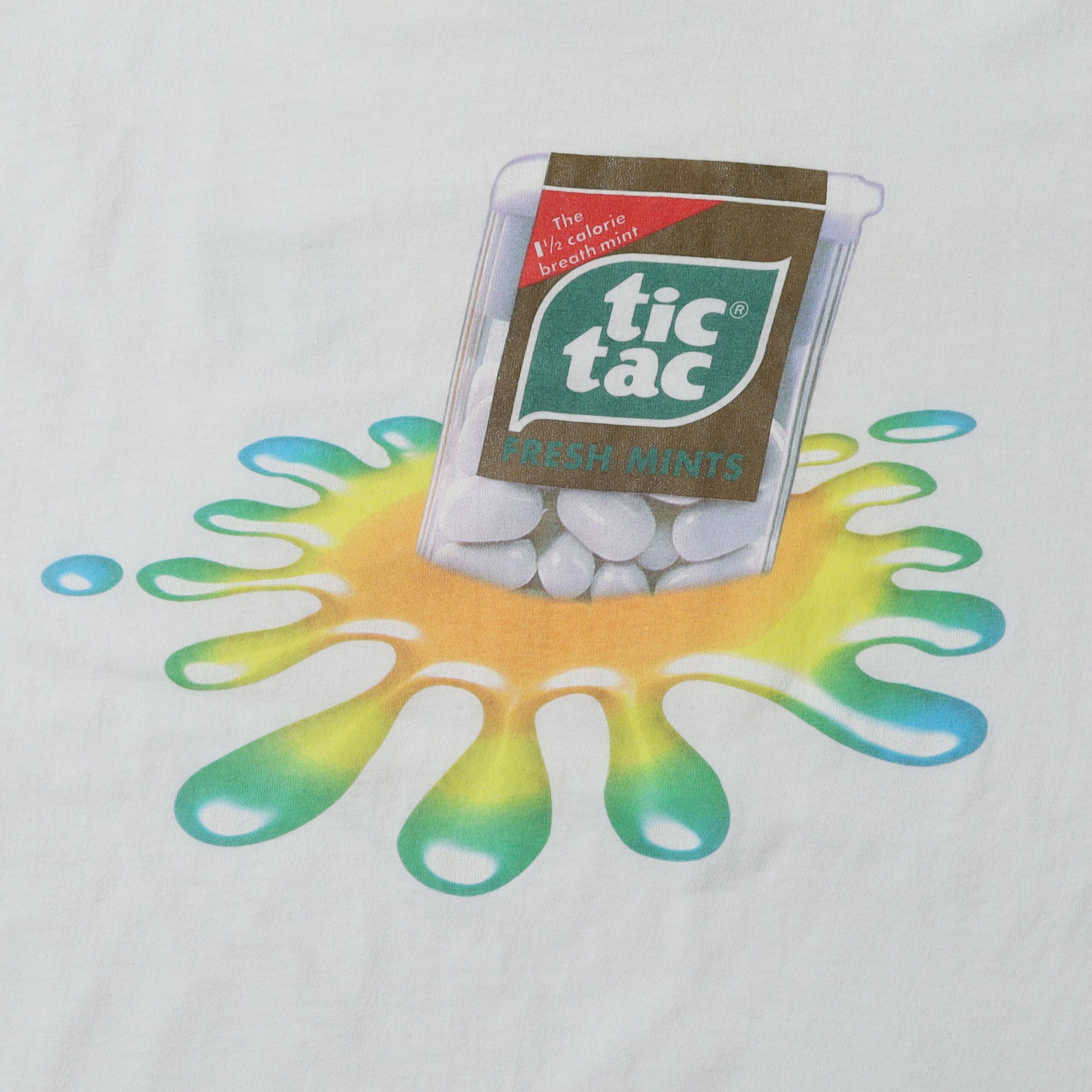イタリア発のミントタブレット "tic tac" のプロモTシャツです。久しぶりの入荷です。個人的に大好きなデザインですし、人気の高いデザインですので、意識的に探していたのですがなかなか出てこず、久しぶりに買い付けられました。こちらはバックプリントのデザイン・カラーリングが最高の1枚。しっかりと製品がプリントされているのが嬉しく、食品系の中でも異質な色使いがとてもかっこいいです。