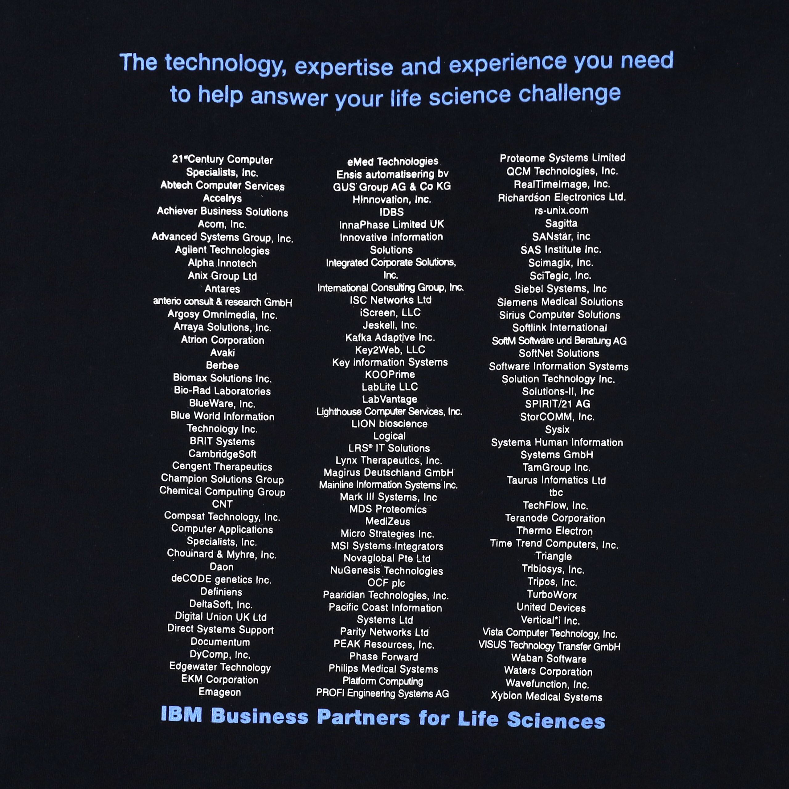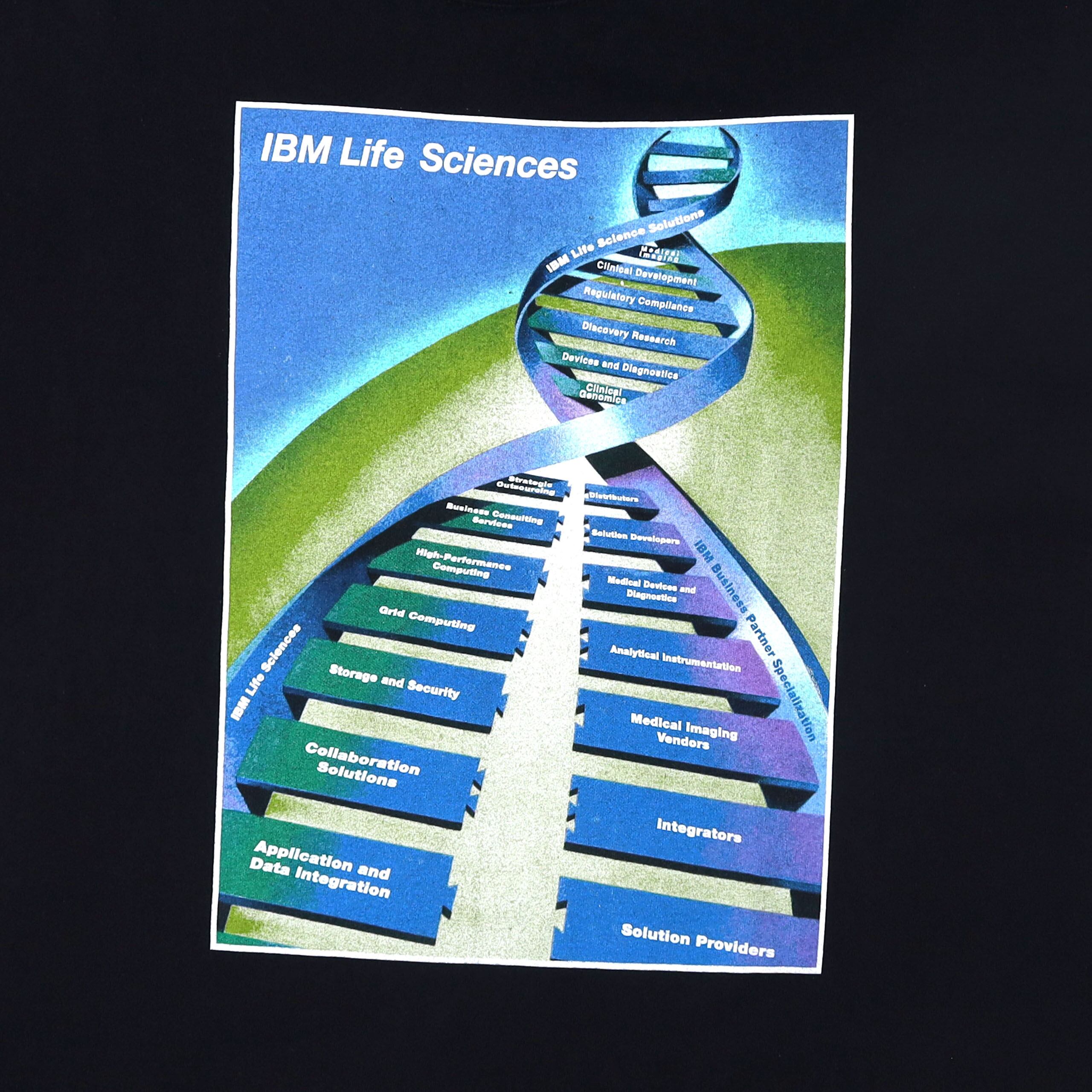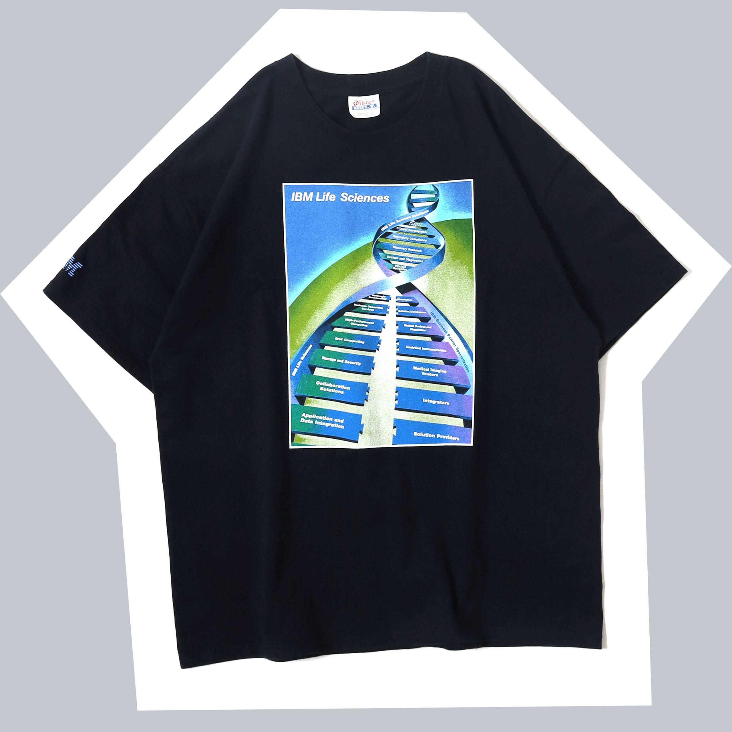 IBMのプロモTシャツです。Life Sciencesの文字とともに、DNAのようなグラフィックに落とし込まれたデザインがとても洒落ていて、存在感抜群です。バックの細かいプリントも素晴らしいバランスで、企業モノでここまで細かいプリントもかなり珍しいと思います。またIBMのこの手のデザインでブラックボディというのも珍しく、カラーリングもかっこいい1枚です。