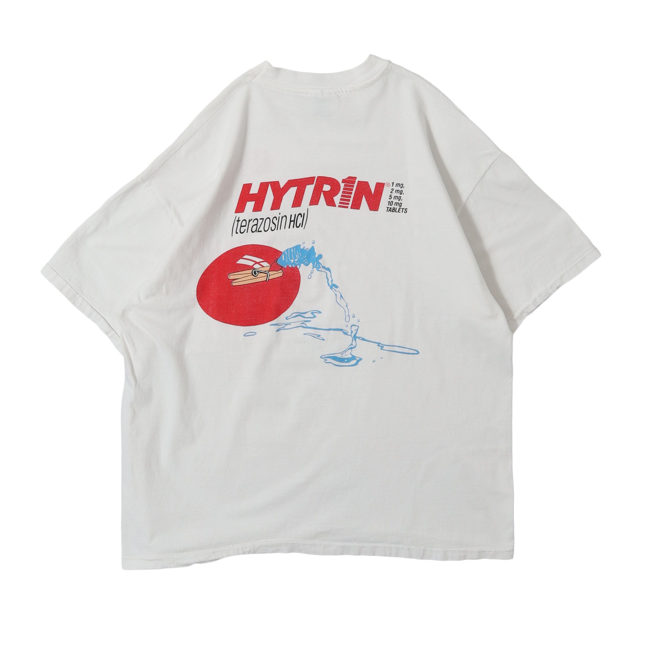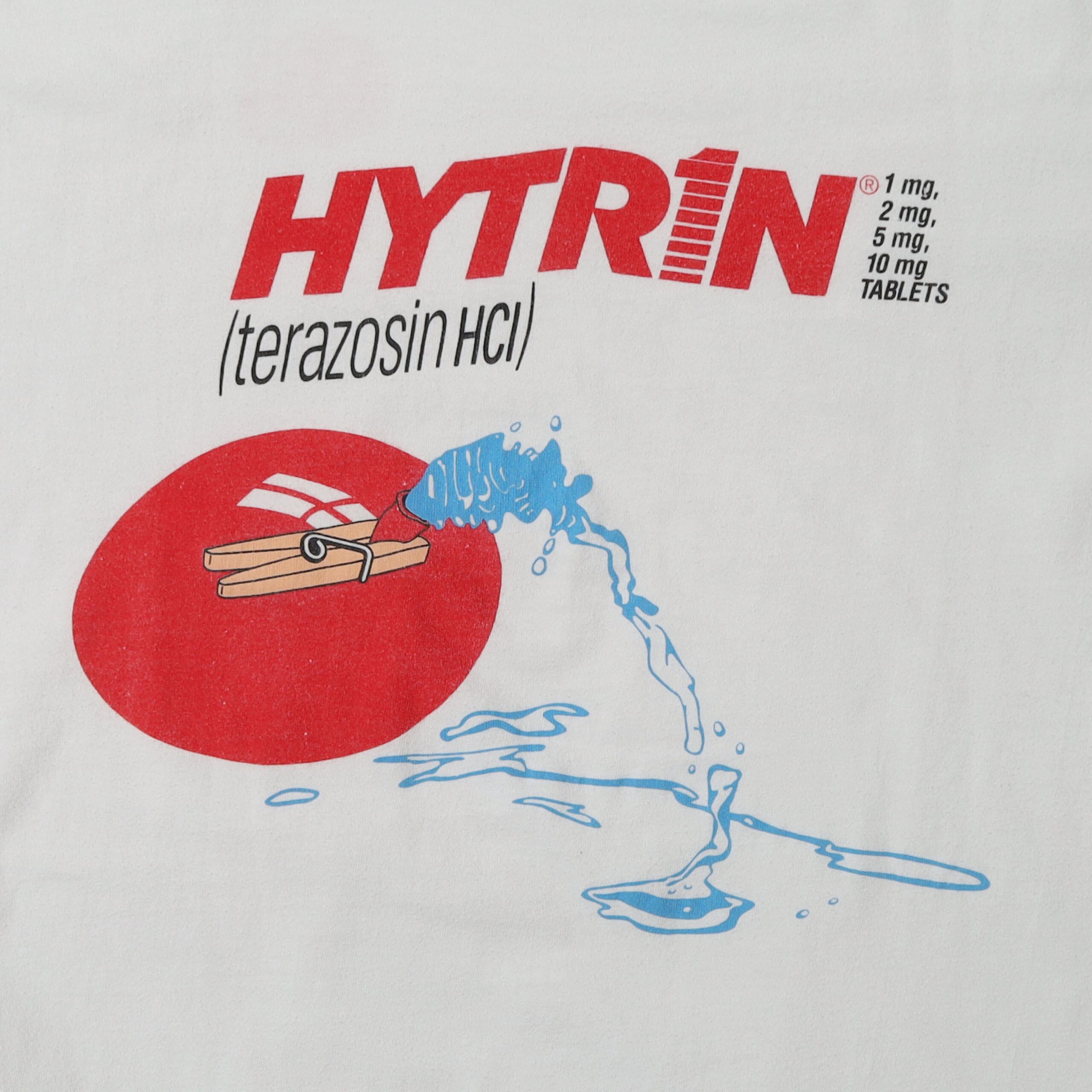 高血圧や前立腺肥大症に対して処方される "Hytrin" と呼ばれる薬のTシャツ。薬品系のTシャツはたまに出てきますが、このデザインは他のものと一線を画すデザインで、モダンでポップな雰囲気のグラフィックに、カラーリングも抜群です。かなり良いデザインではないでしょうか。プリントTとしても取っ付きやすく、企業モノ感も強すぎないので、多くの方が着やすい1枚かと思います。