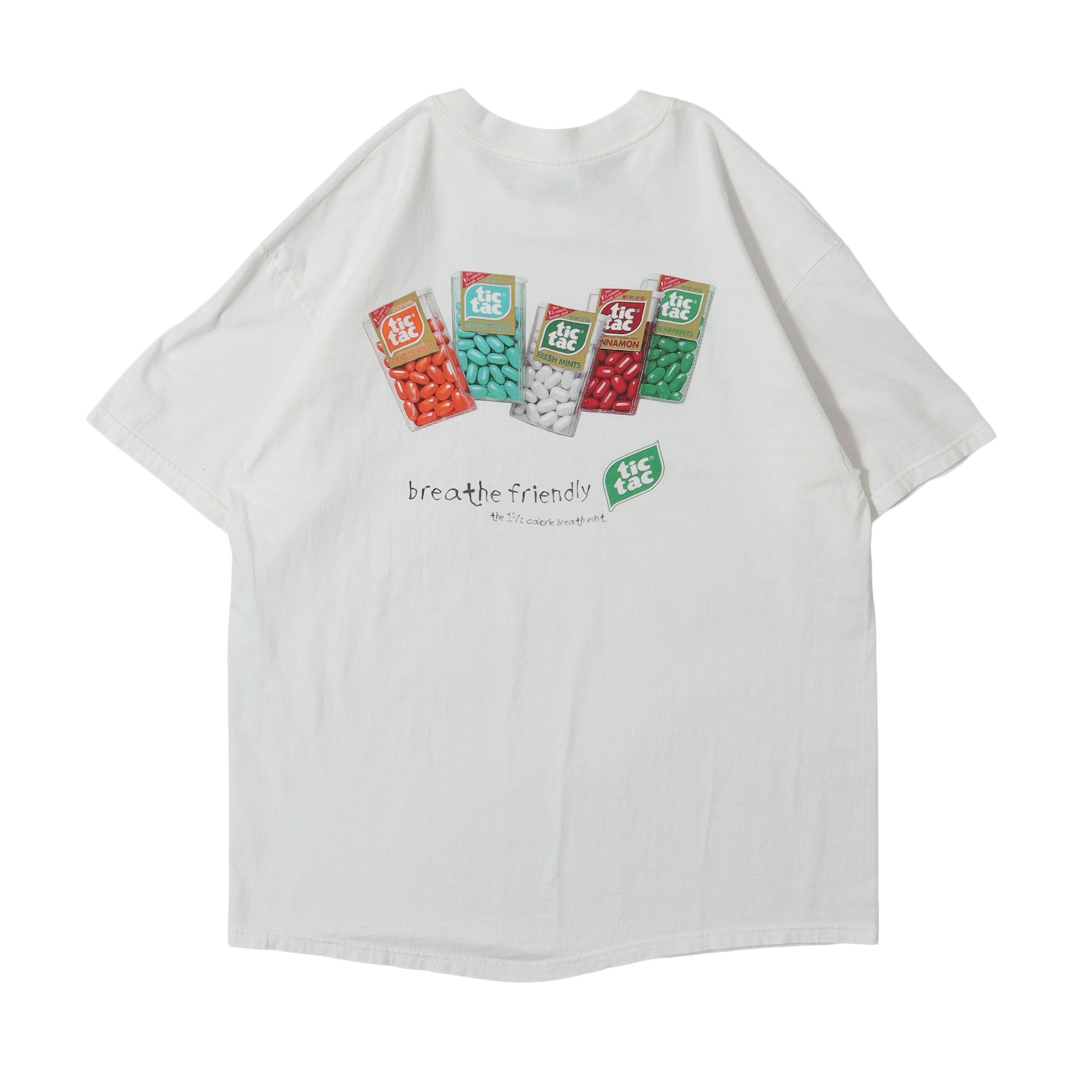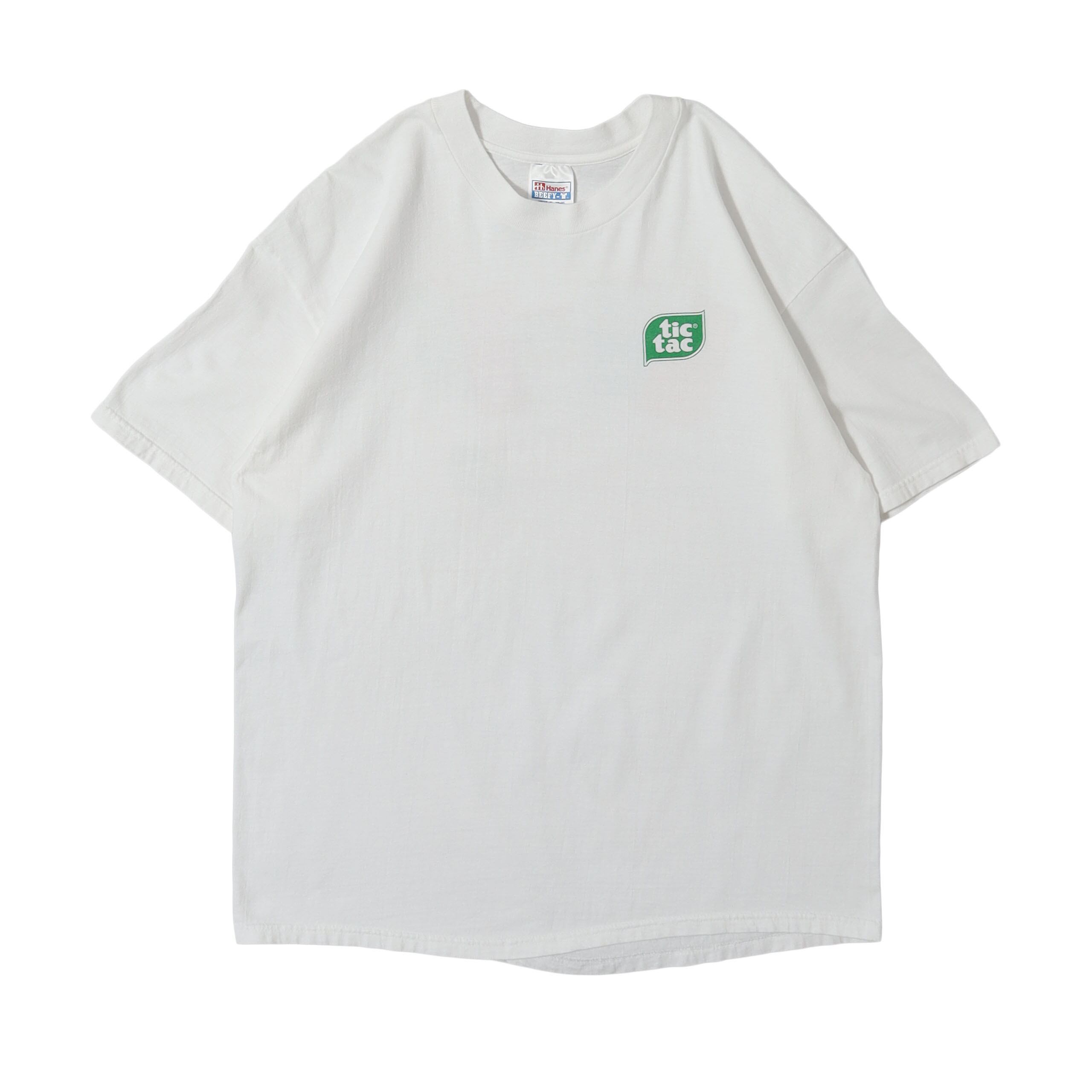 イタリア発のミントタブレット "tic tac" のプロモTシャツです。このデザインは2度目の入荷。tic tacのものは継続して探しているのですがなかなか巡り会えず、かなり久しぶりの入荷となりました。食品系のTシャツらしく、バックの製品のプリントがとても洒落ていて、カラーリングもピカイチです。企業ものらしいデザインと、テック系企業のTシャツにはない雰囲気が絶妙のバランスです。