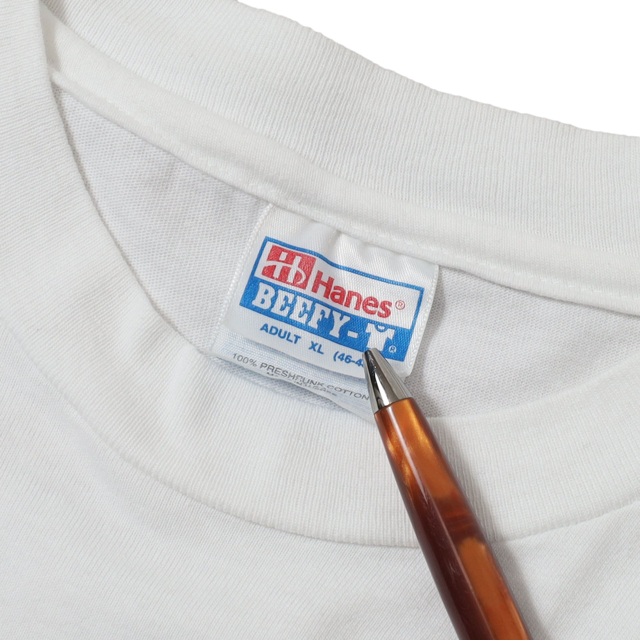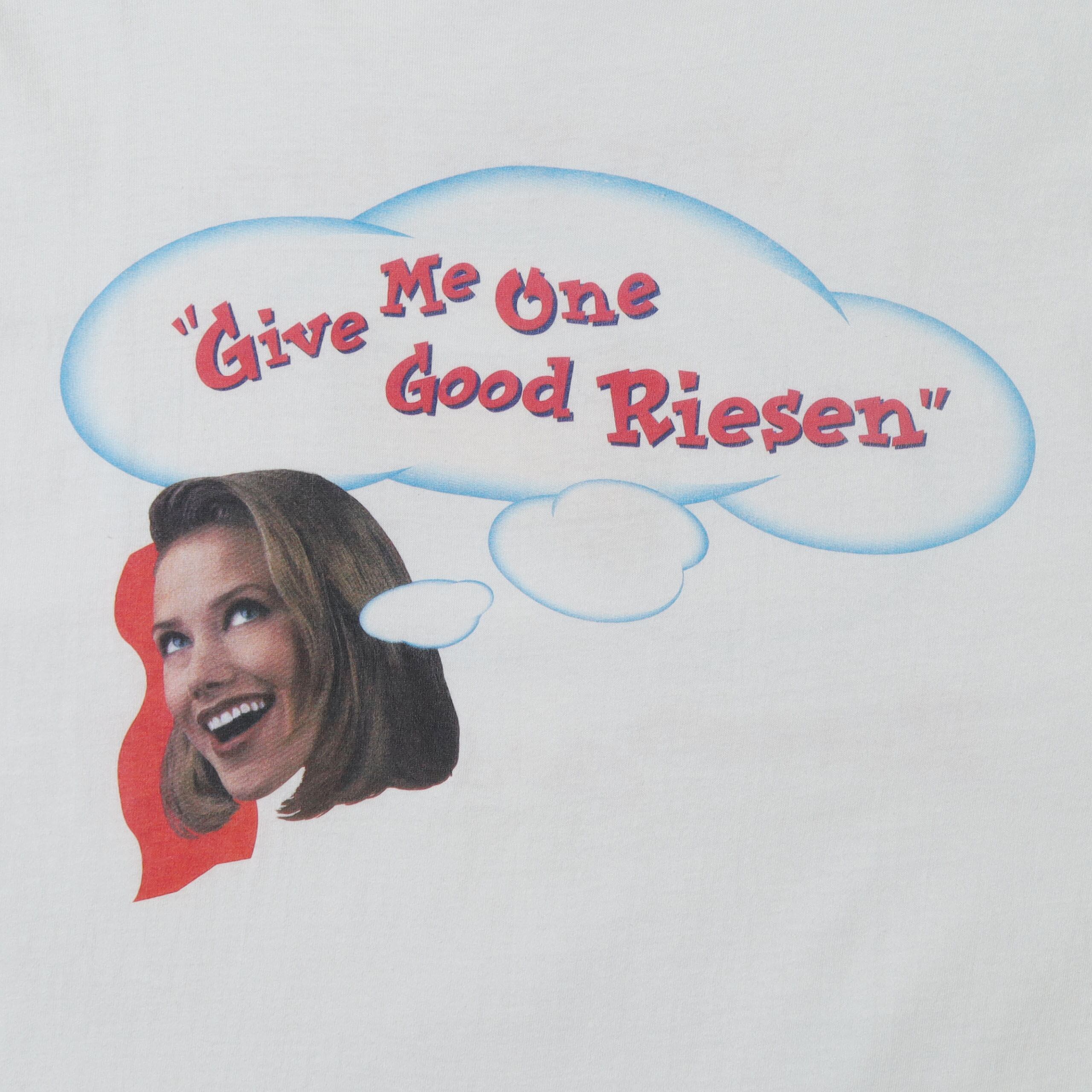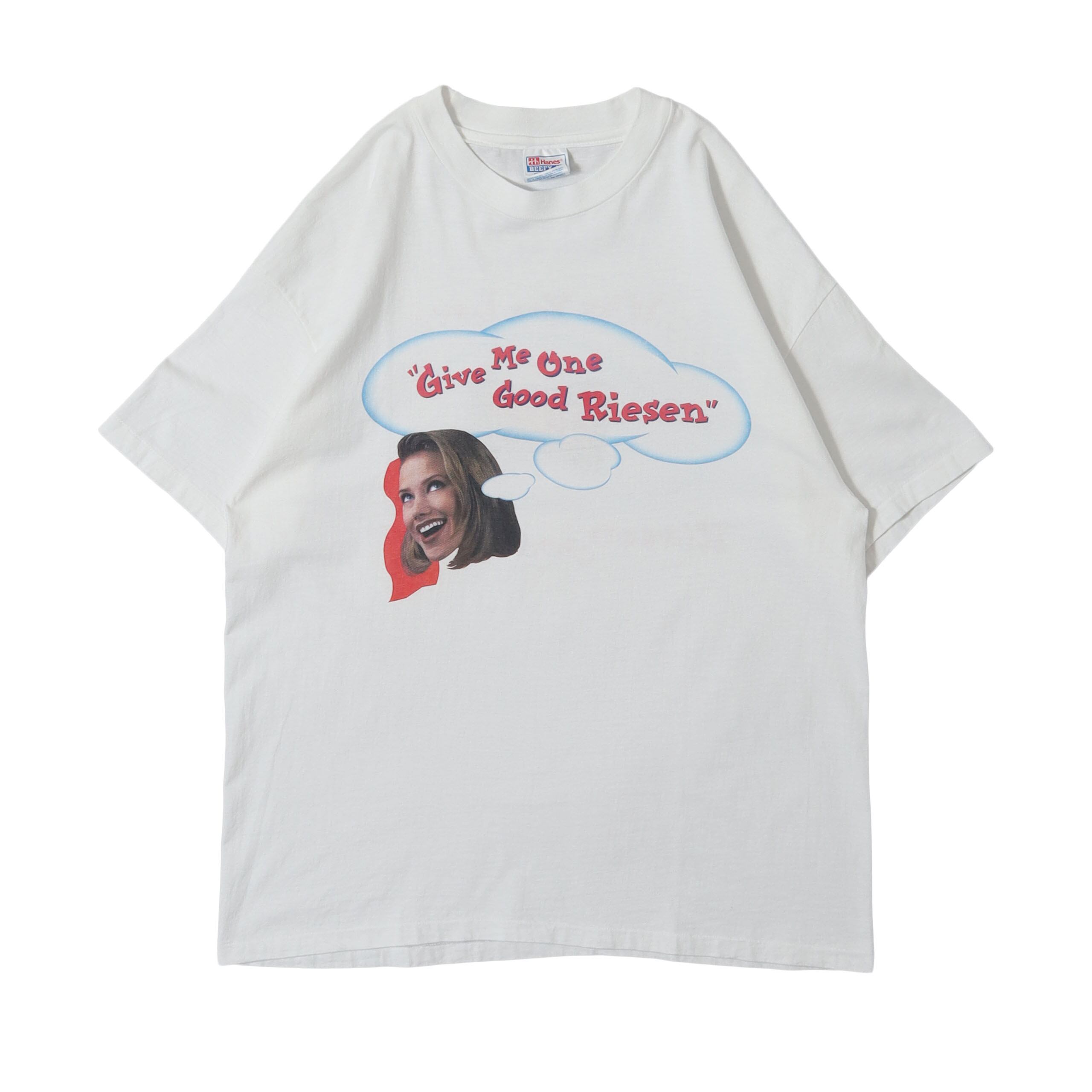 ドイツ発祥のチョコレート菓子 "RIESEN" のプロモTシャツです。チョコレート系のTシャツといえば大半はHERSHEY'Sの中、RIESENのものは非常に珍しいです。またRIESENが出てきてもロゴものしか見ないですが、こちらは企業モノらしいしっかりとしたグラフィックで、食品系ではレアな人のプリントにバックは製品のプリントと、とにかく最高のデザイン。前後のプリントですがクセなくポップな印象で、着やすい1枚かと思います。