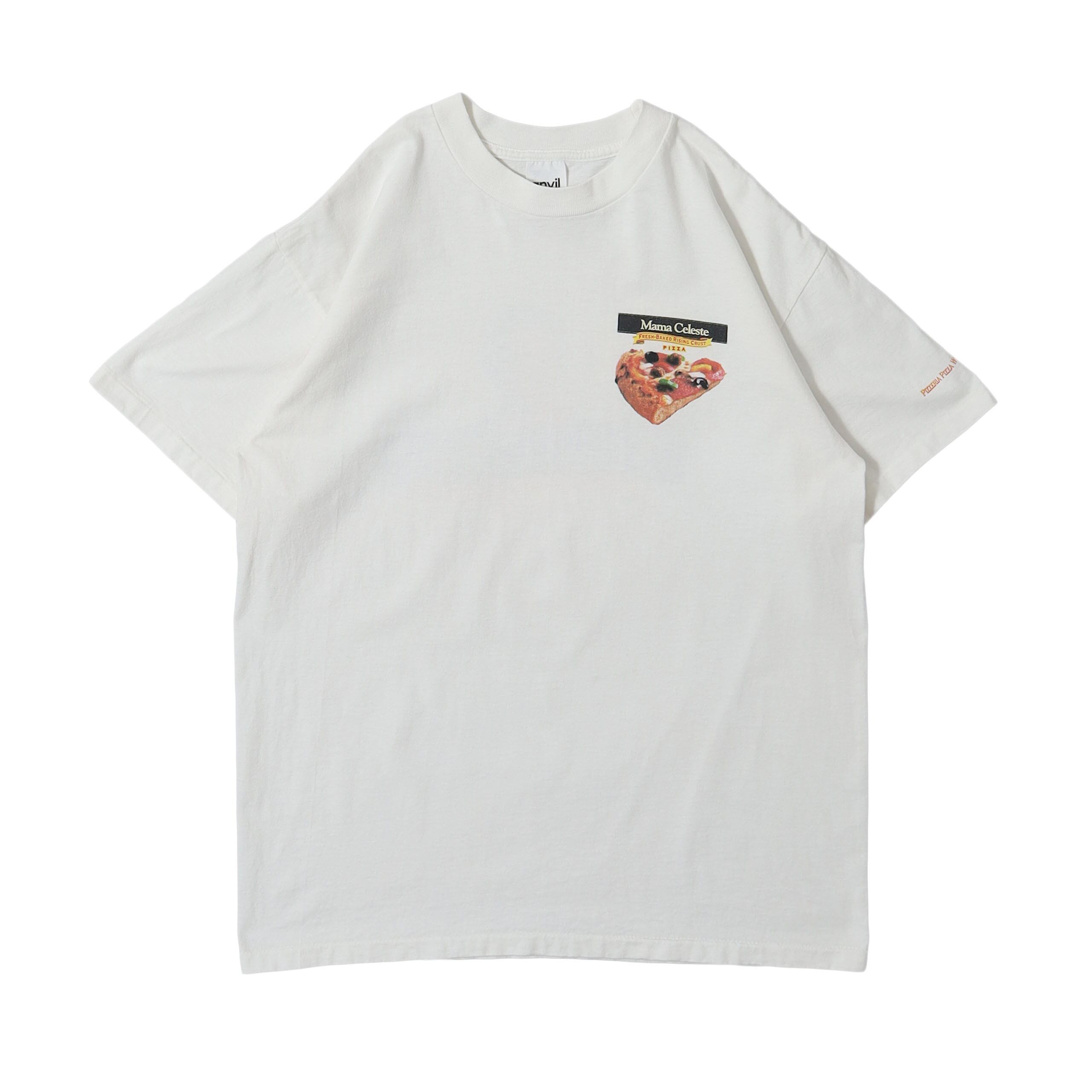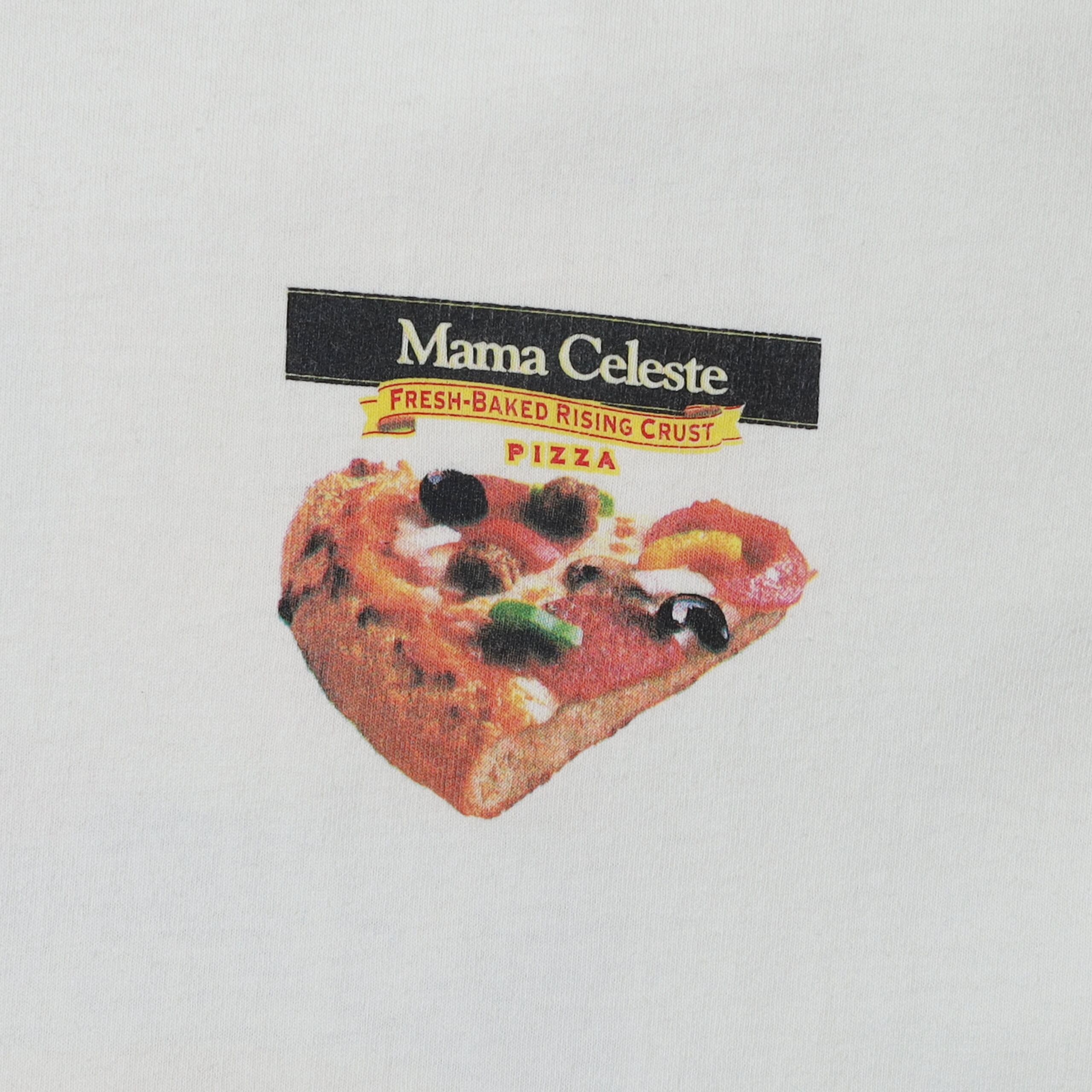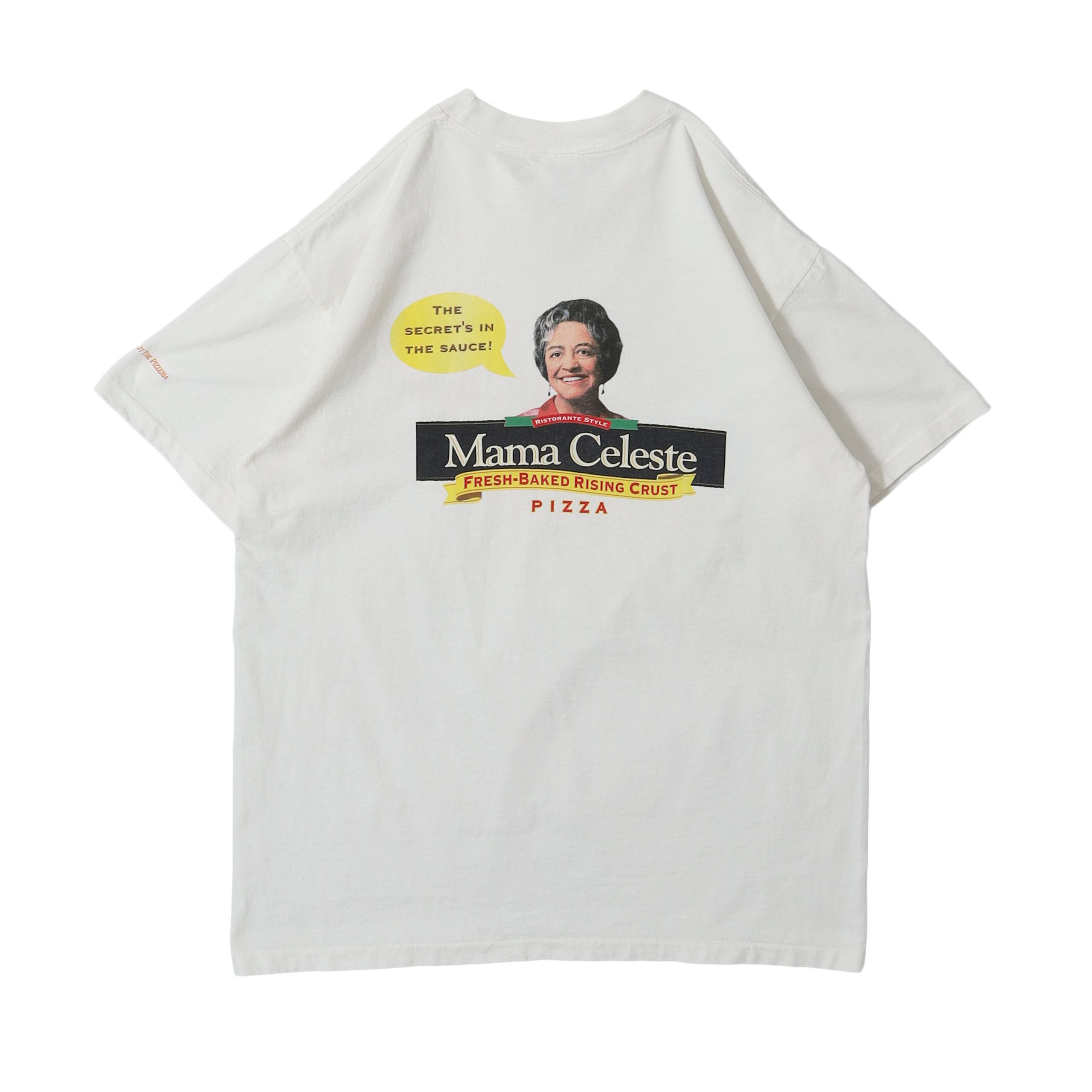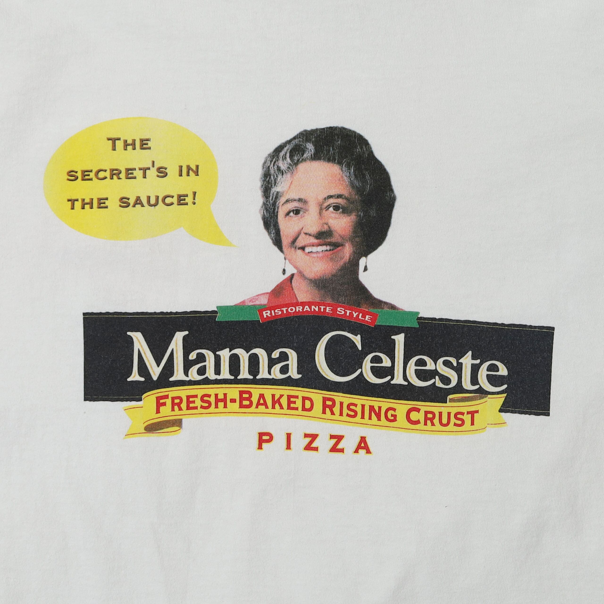 冷凍ピザのブランド "Mama Celeste" のプロモTシャツです。ピザのTシャツは初めて販売しますし、かなり珍しい1枚かと思います。バックにはパッケージにプリントされているロゴ、フロントにはピザのプリントと、デザインの雰囲気もカラーリングも抜群に良いです。可愛らしさも感じる雰囲気で、性別問わずおすすめしたい1枚です。