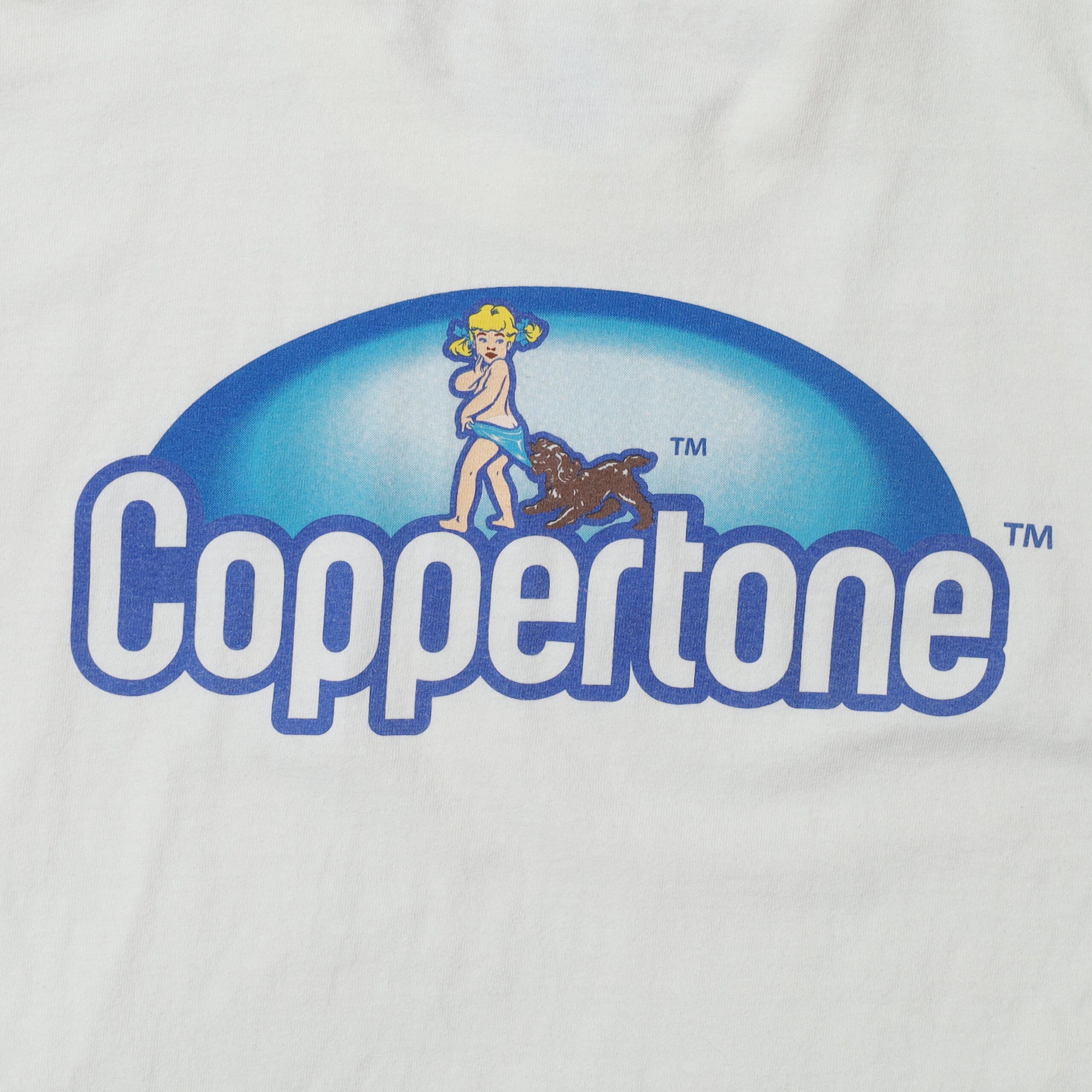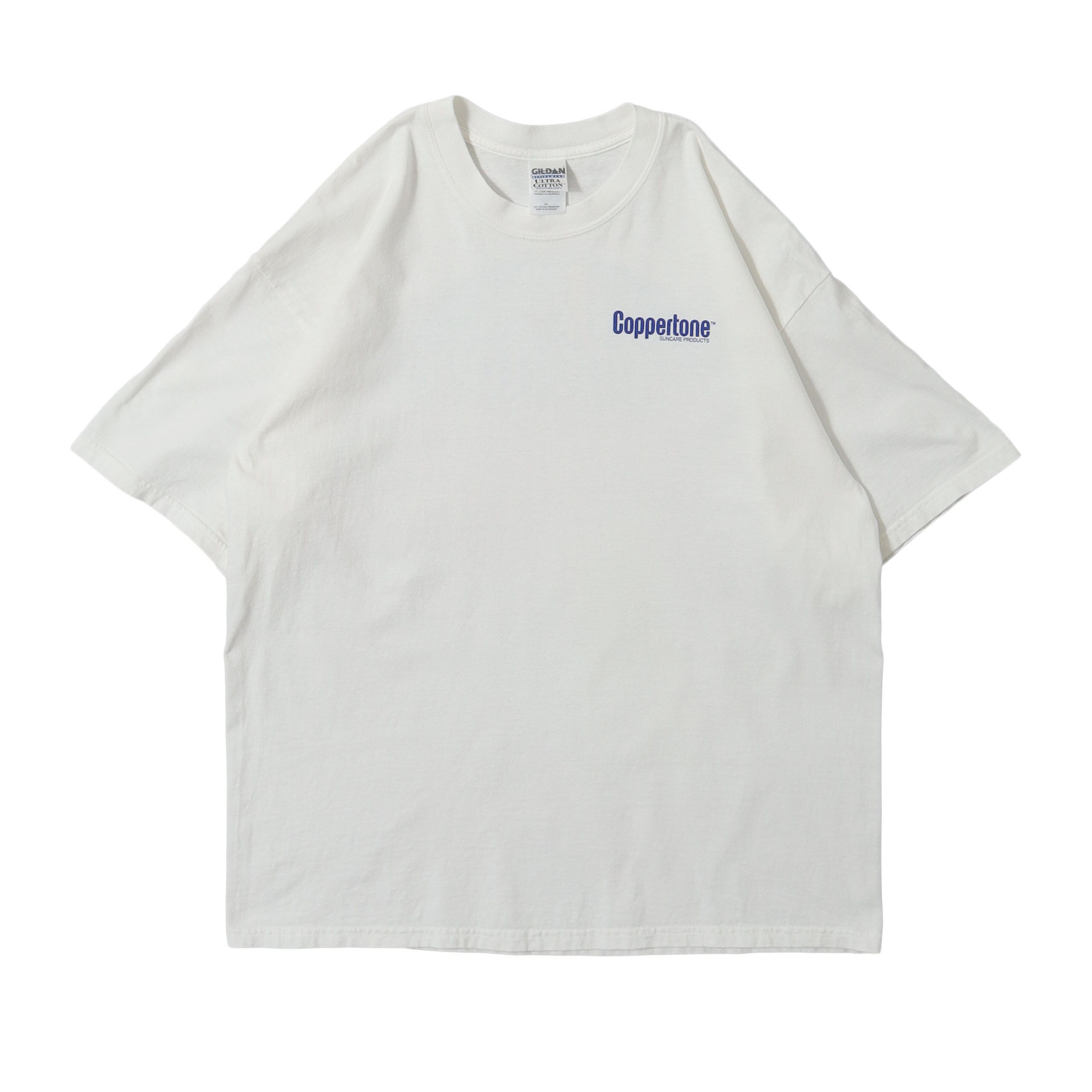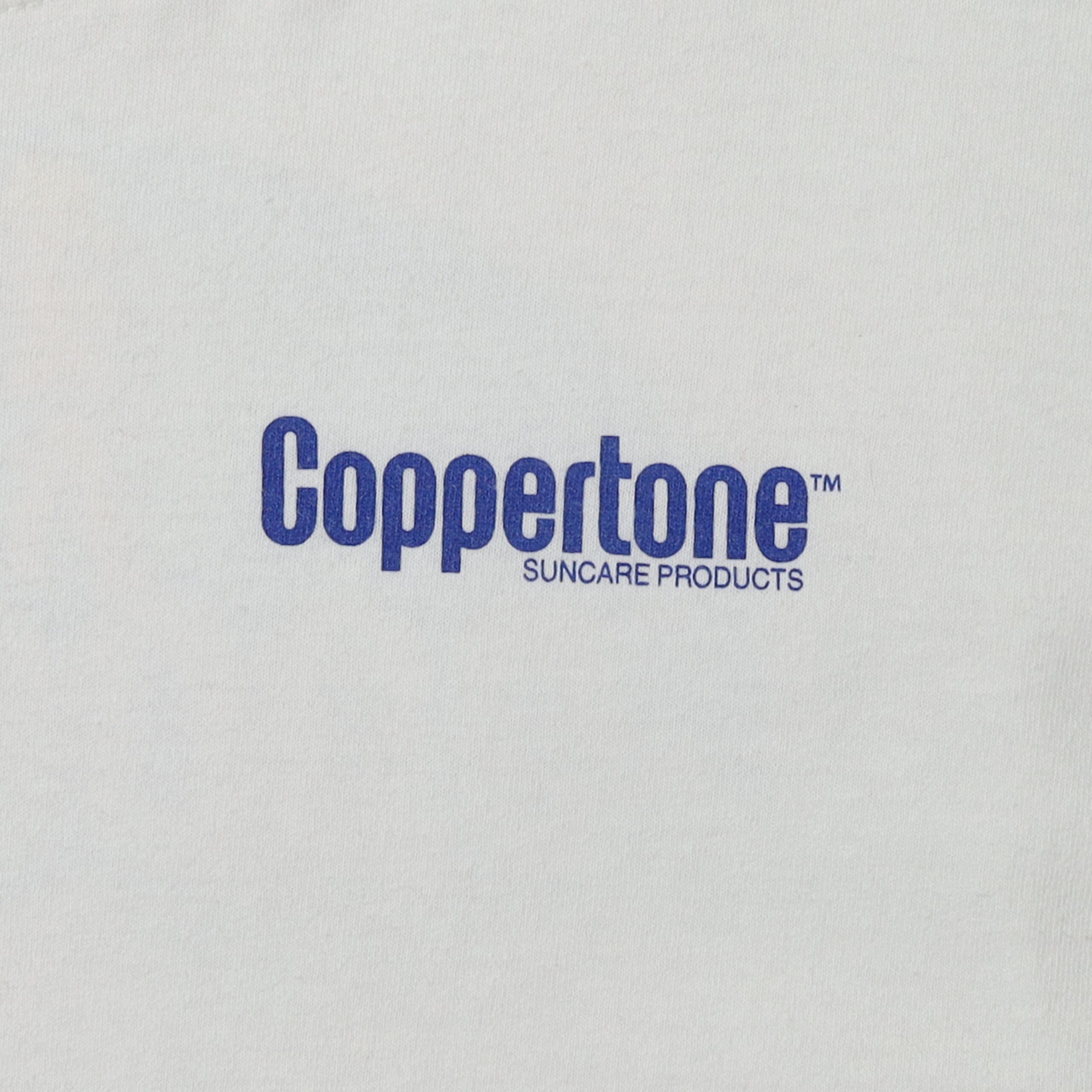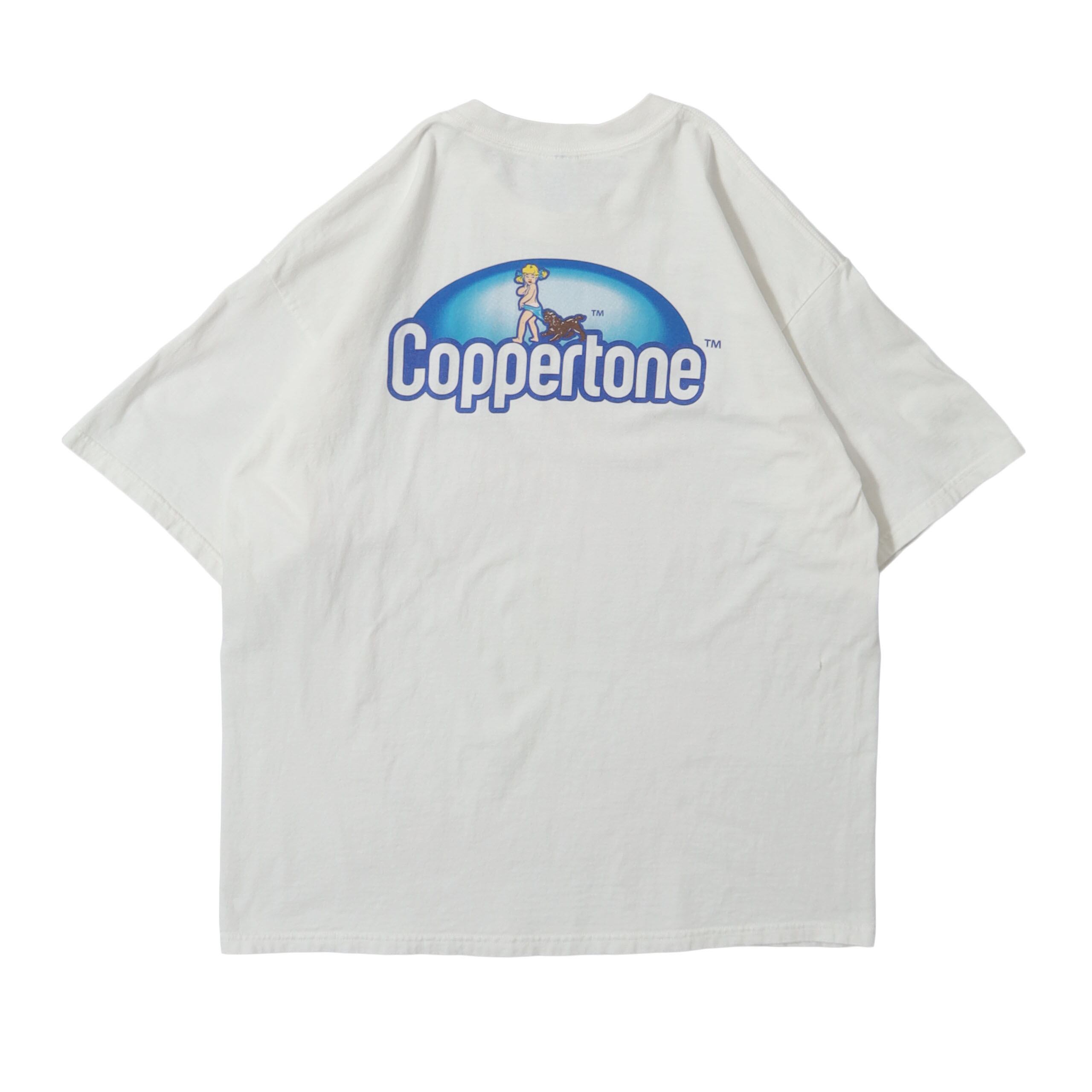 アメリカの日焼け止めブランド "Coppertone" のプロモTシャツです。この企業といえばの、ジョイス・バランタインが手掛けた犬に水着を引っ張られる女の子がメインにプリントされたデザインで、とても可愛らしい雰囲気の1枚です。フロントにもバックにもプリントがありながら、カラーリングもデザインもスッキリしていますし、キャッチーなデザインでクセがなく着やすい1枚かと思います。