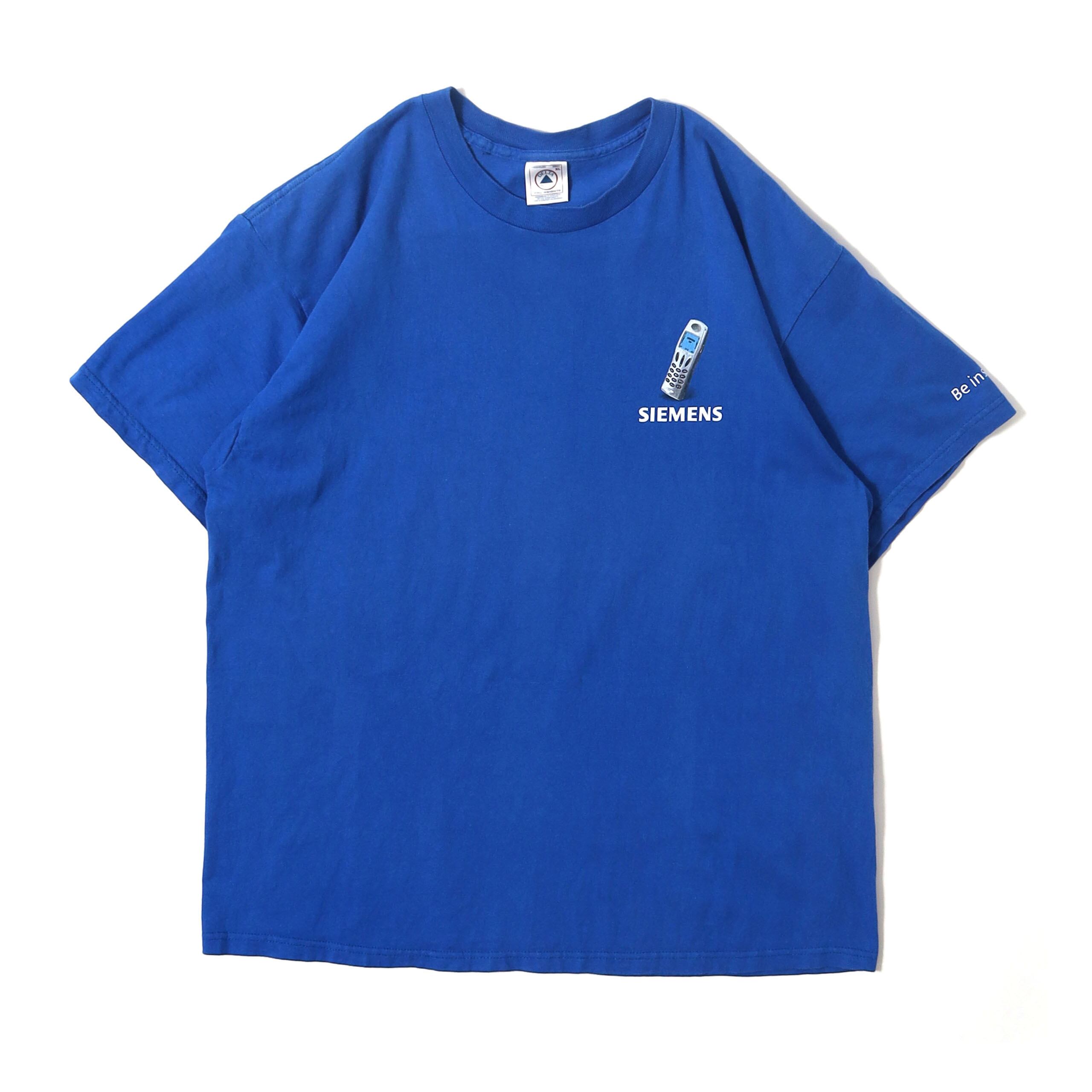 ドイツの電機メーカー "SIEMENS" のプロモTシャツです。企業モノといえばこれでしょって感じのバランスが最高で、ブルーボディも珍しいですし、ブルーに乗せた白やシルバーといった色味のプリントもすごく良い雰囲気です。個人的に胸元の携帯のプリントにロゴというバランスが絶妙で、とてもセンスを感じます。