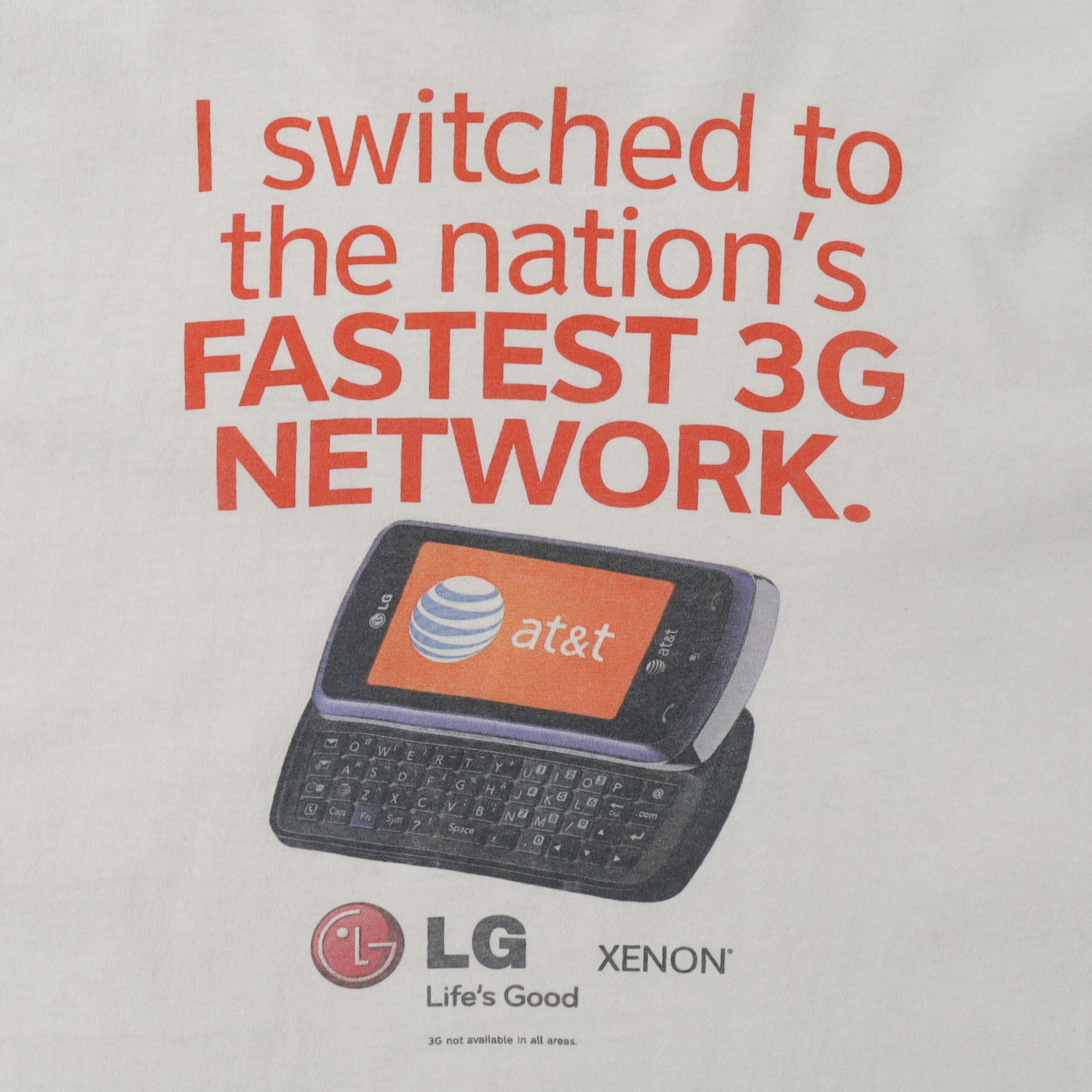 韓国の電機メーカー "LG" が2009年にリリースした、AT&Tの3Gネットワークを使用した携帯電話 "XENON" のプロモTシャツです。とても企業モノらしい製品がプリントされたデザインですが、文字と製品のバランスやカラーリングでポップさを感じる、あまり見ない雰囲気。比較的近年のものですが、しっかりと企業モノの良さが出ている1枚です。