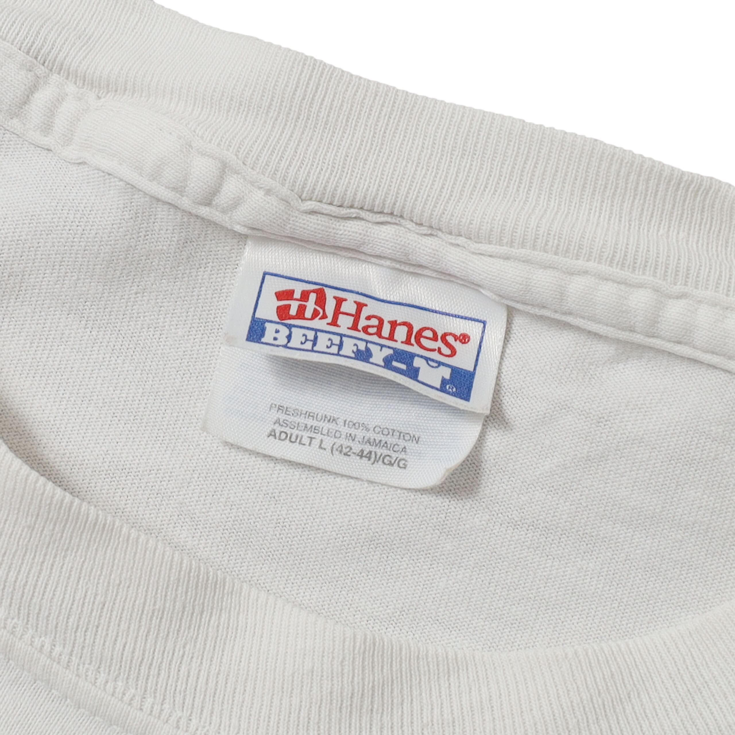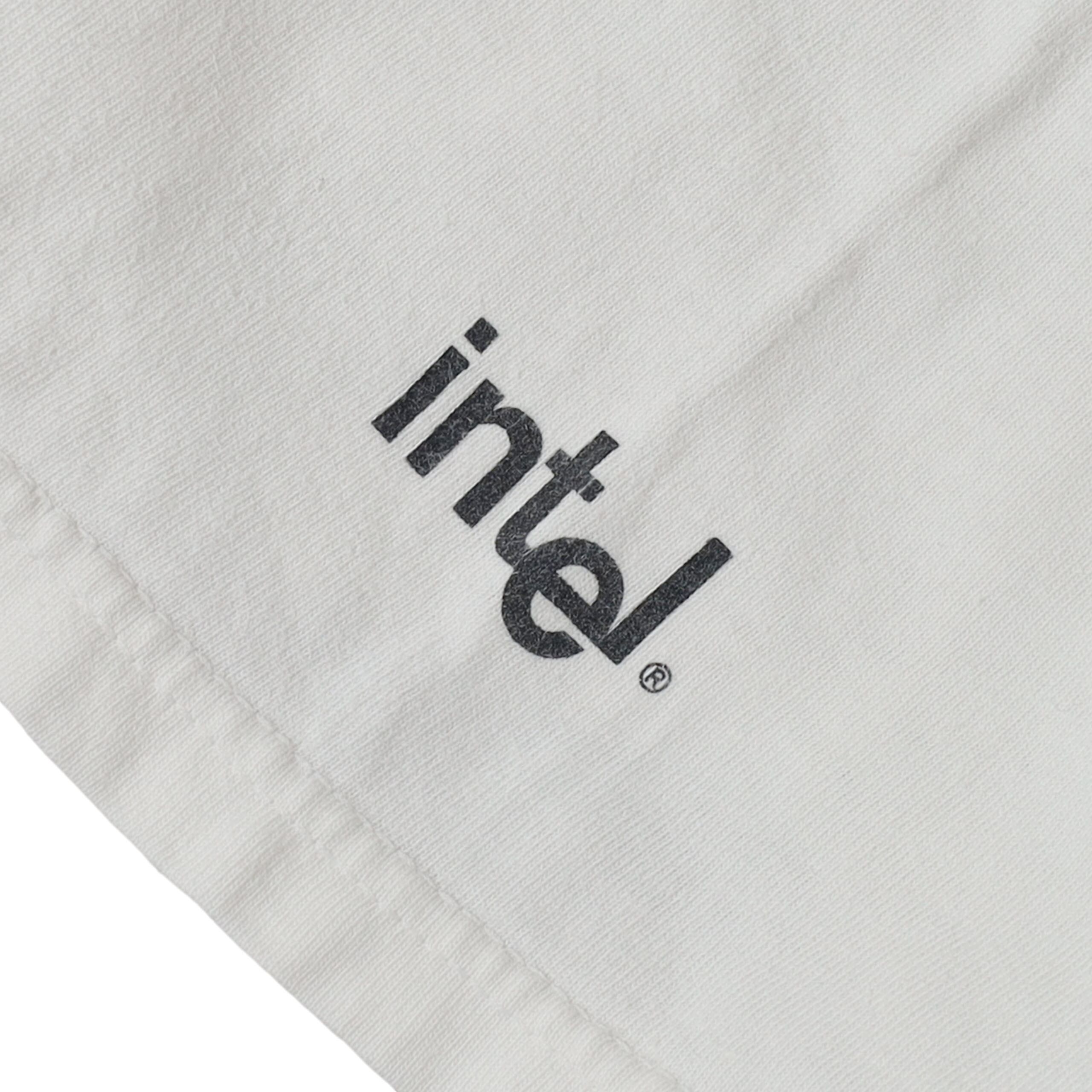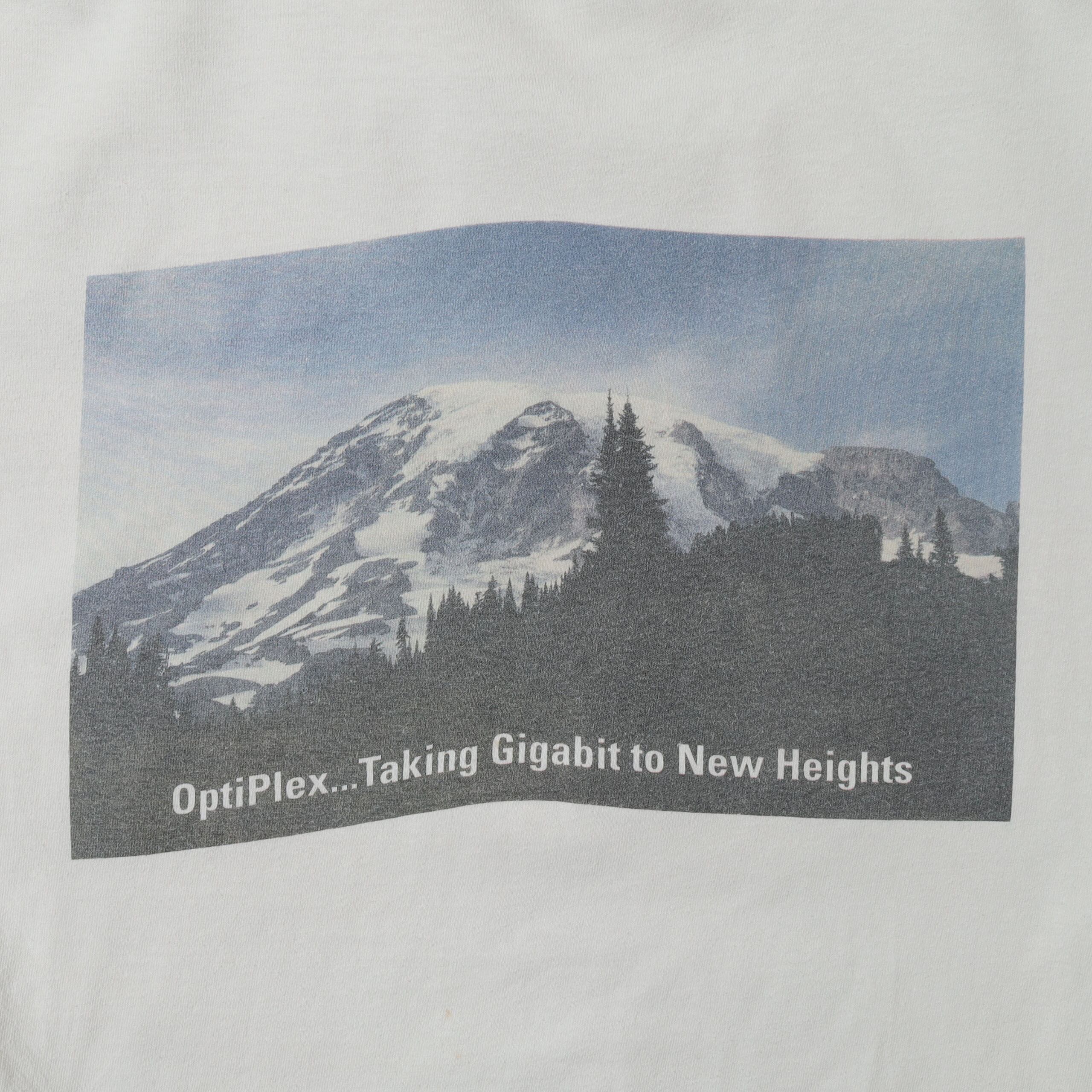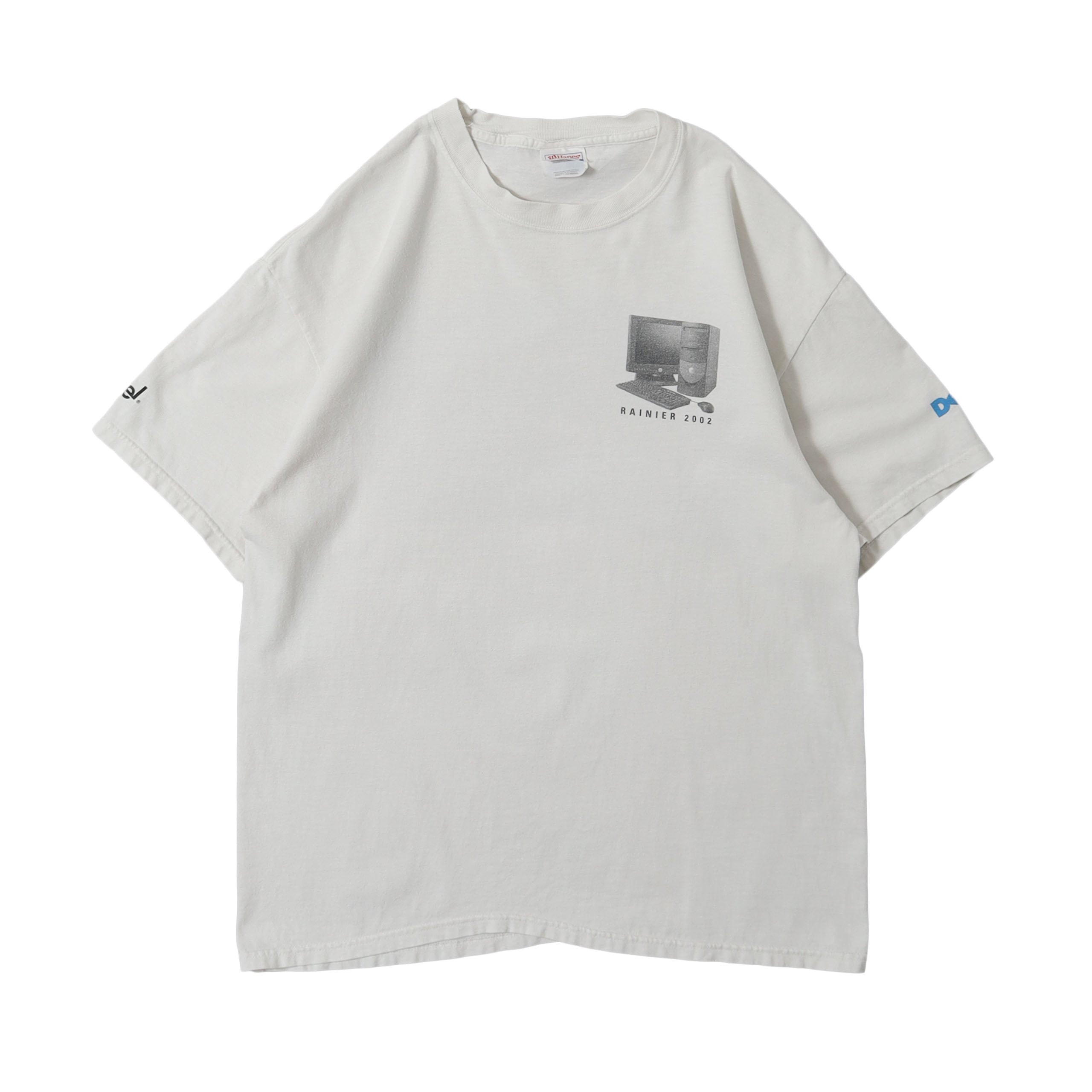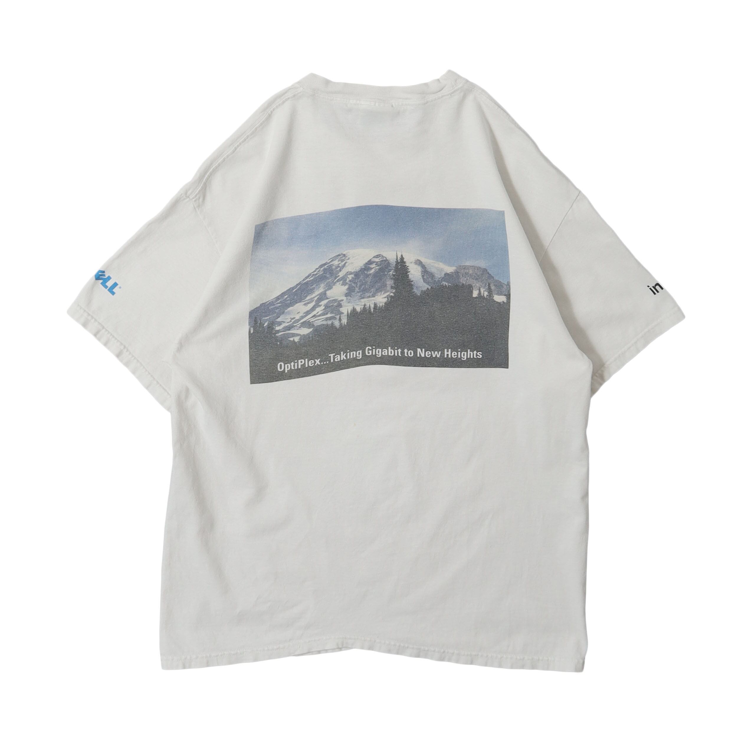 DELL製のRAINIERというコンピューターのプロモTシャツです。プロセッサーにはIntelのコアプロセッサーを採用しているため、袖にはIntelのロゴも入ります。胸元プリントサイズの製品プリントが個人的に大好きなのですが、あんまりパターンってないんですよね。バックにはこの製品のパワーを表したフォトTのようなグラフィックがプリントされていて、フロントは製品、バックには写真、袖にロゴというかなり珍しいバランスが魅力的です。全体的なカラーリングも落ち着いているので、しっかりプリントはありながらまとまった雰囲気の1枚です。