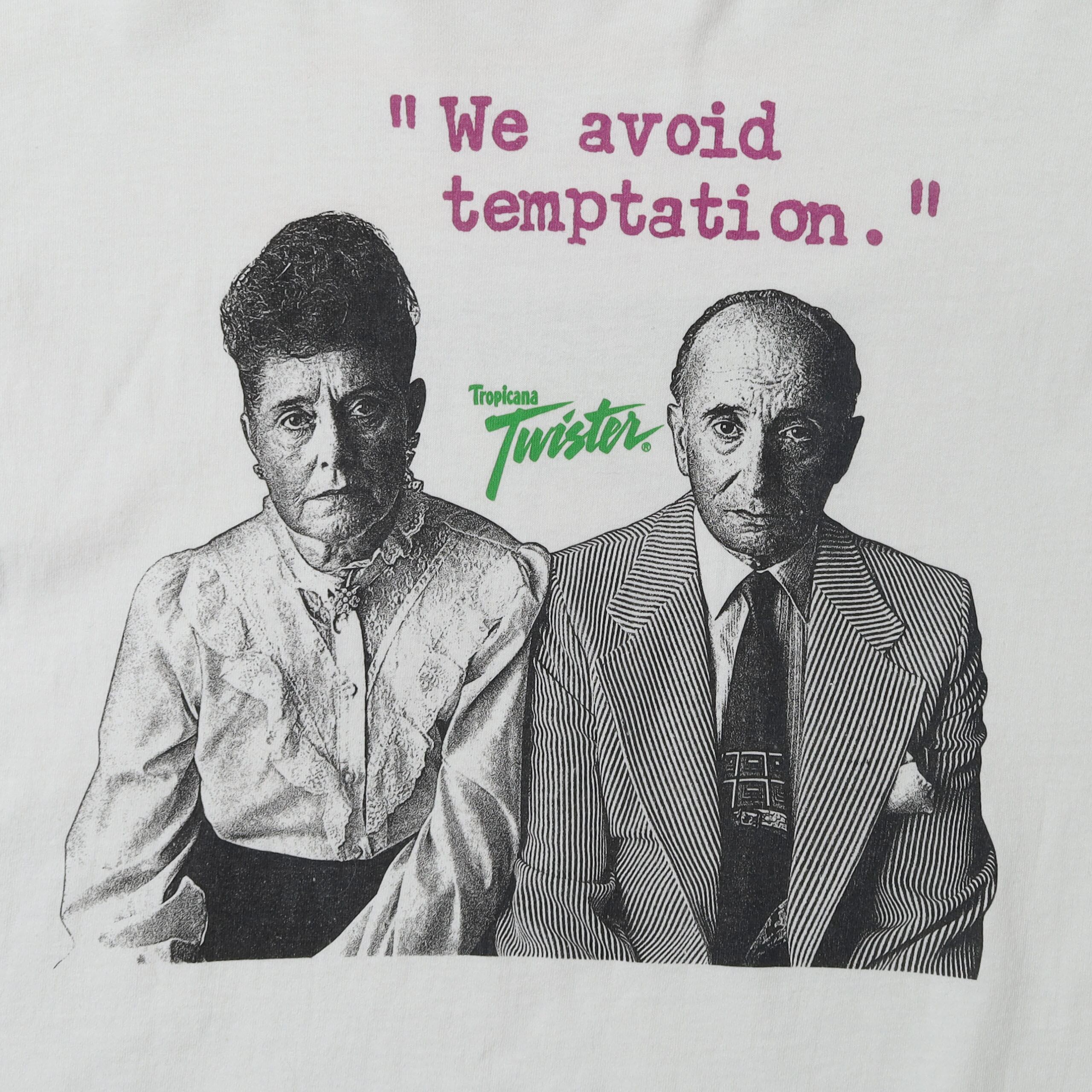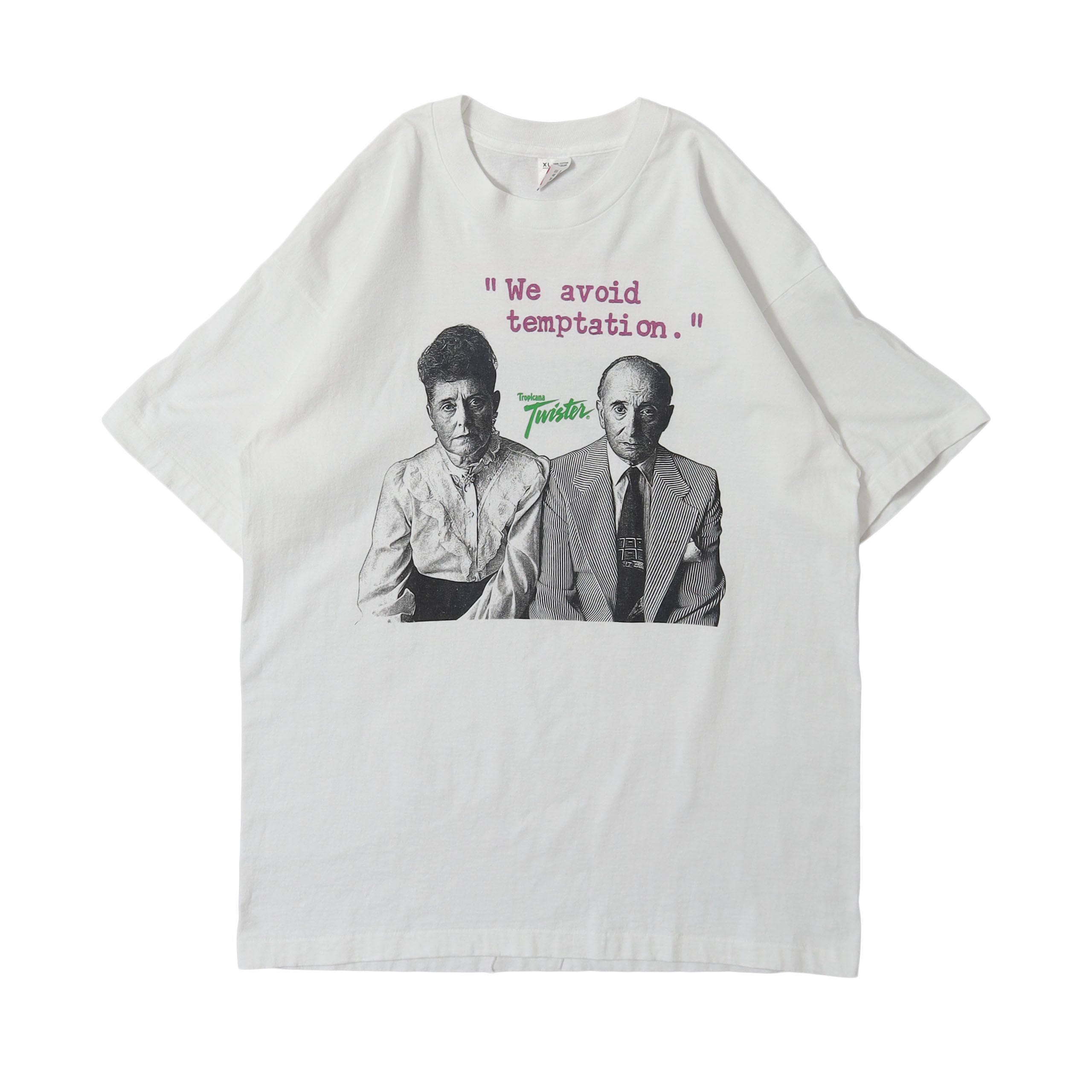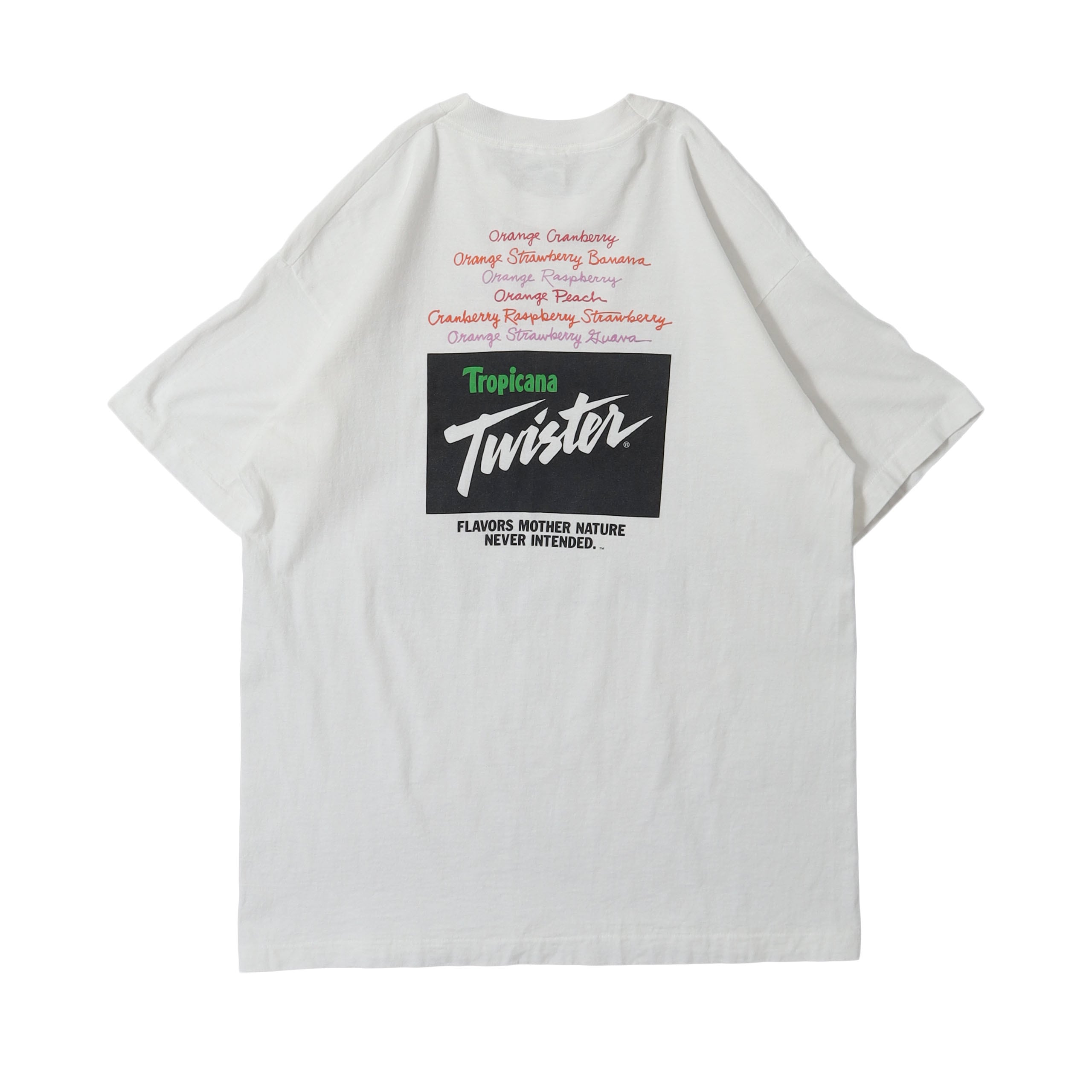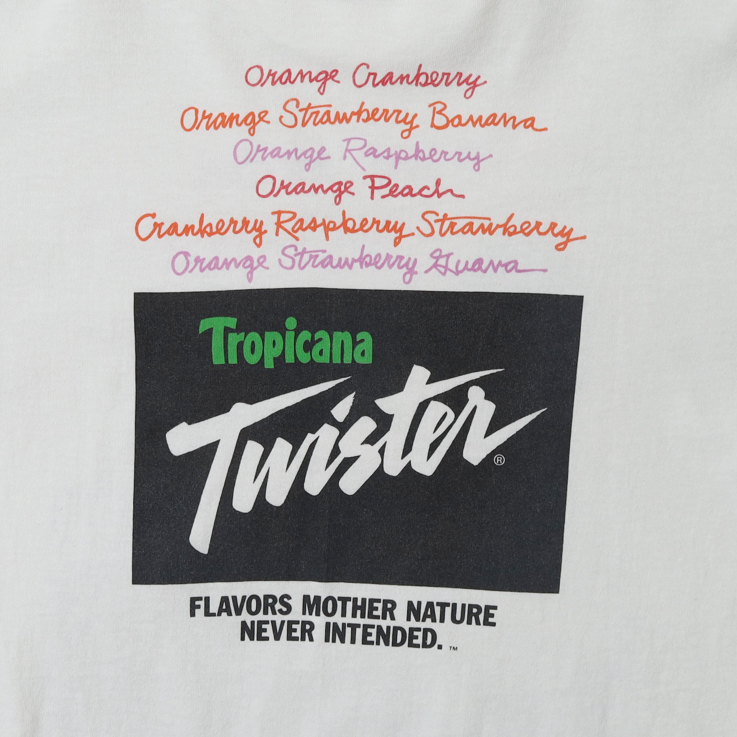 Tropicanaが販売していた100%ジュースではない、フルーツ風味のドリンク "Twister" のプロモTシャツです。TropicanaのTシャツの中でも他のものとは一線を画すデザインで、今回はタイプ違いで2枚買い付けることが出来ました。。フロントにもバックにも主張のあるプリントがありながらうるさくない絶妙なバランスで、デザイン・カラーリングともに最高にかっこいい1枚です。