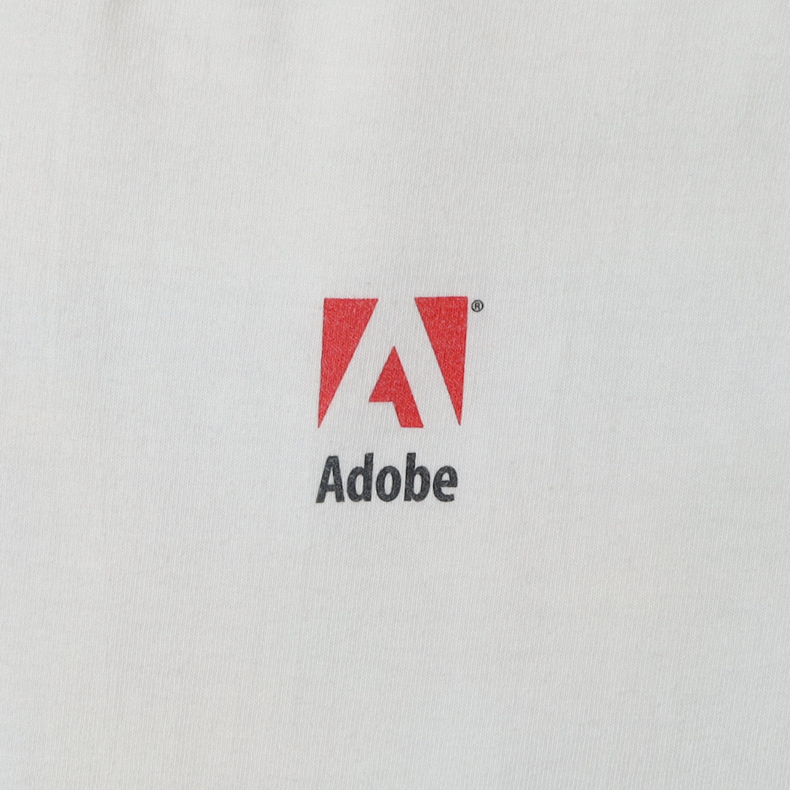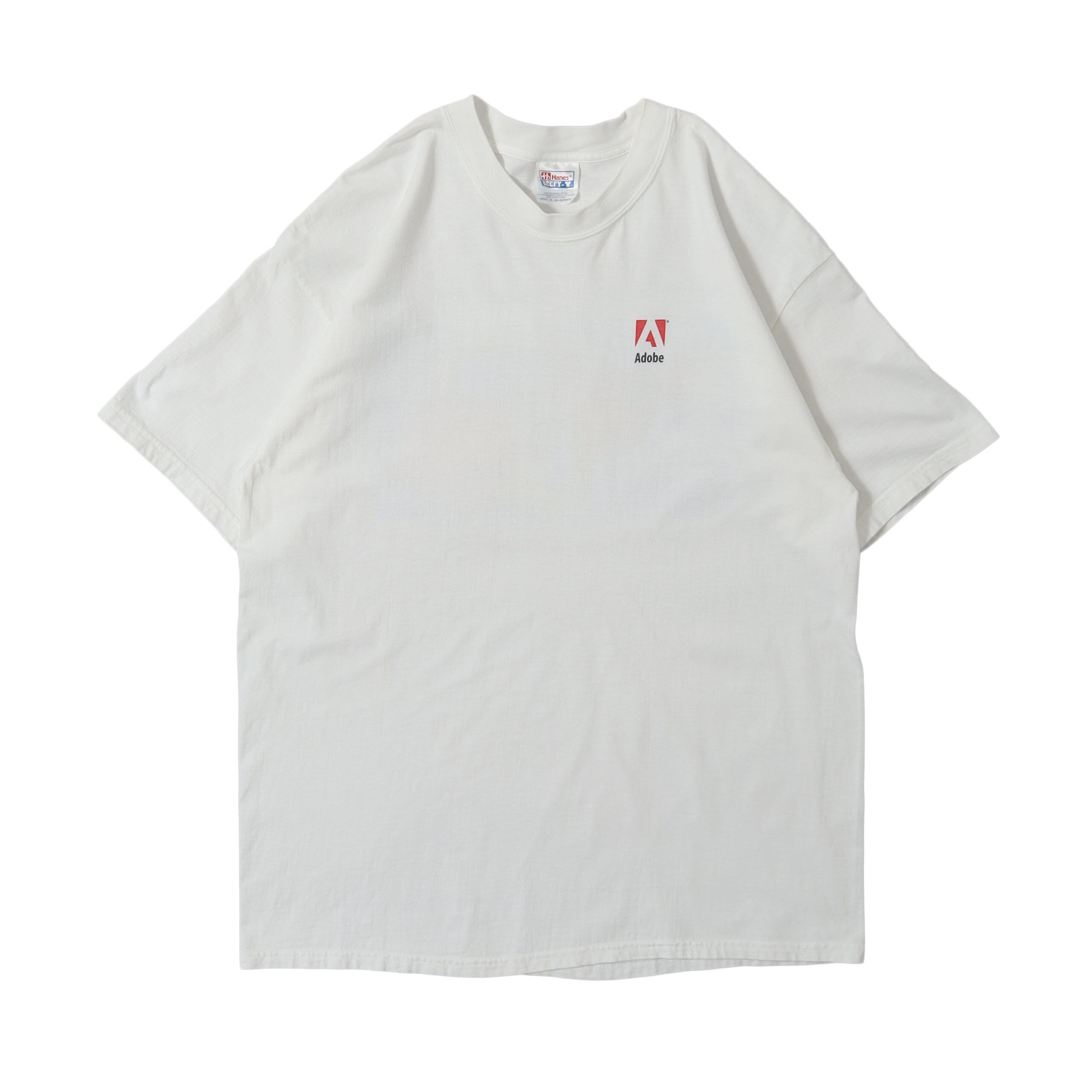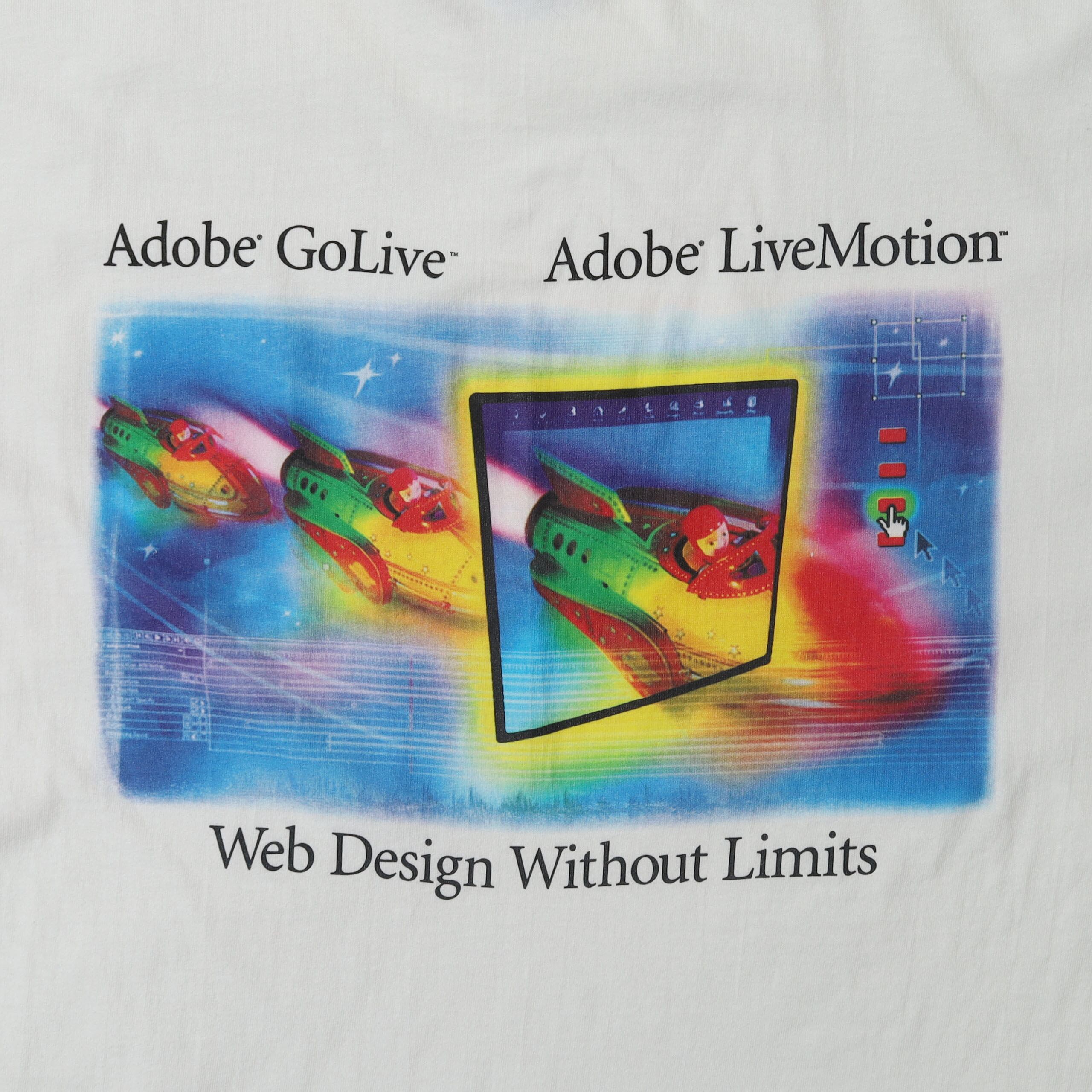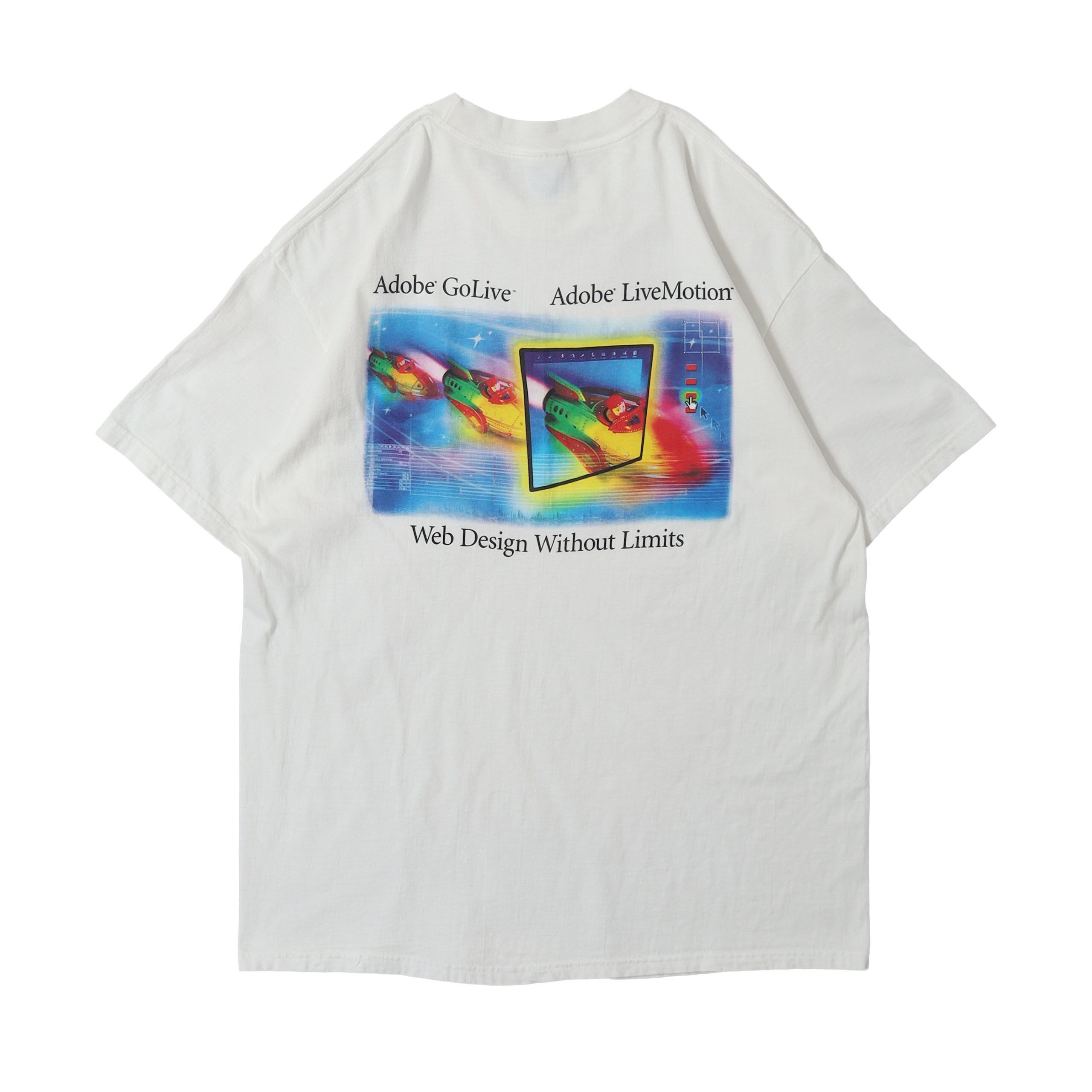 Adobeがかつて販売していたWebページ作成のためのソフト "GoLive" と、Webコンテンツやアニメーション作成のTシャツです。以前も販売しましたが、テック関連らしいバックのプリントのデザインが素晴らしく、胸元のシンプルなロゴのバランスもとてもかっこいい仕上がりです。状態もサイズも言うことなしの個体です。