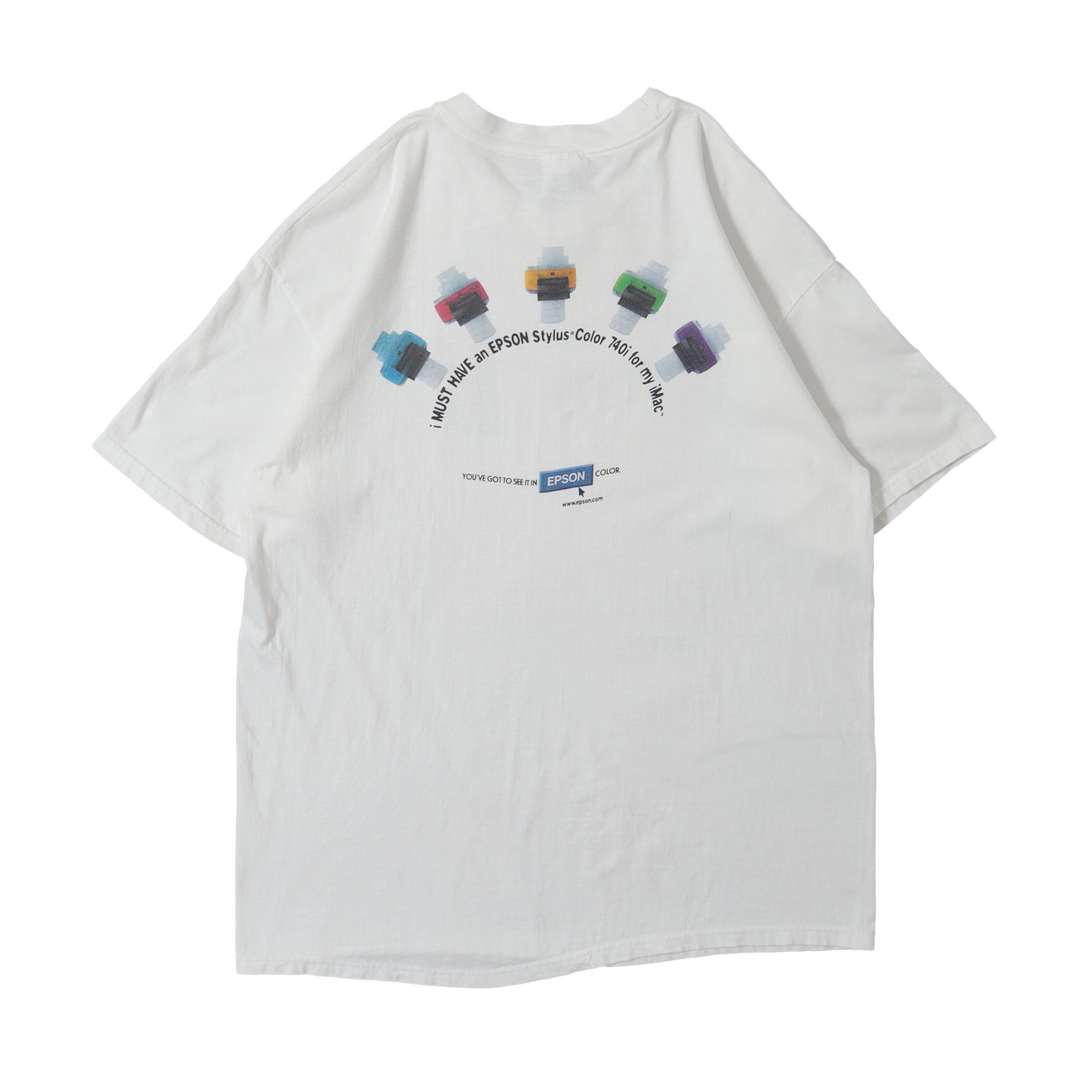 EPSONのiMac向けのプリンターのプロモTシャツです。こちらはデザインがとにかく良い1枚で、バックの広告らしいスッキリとしたセンスの感じるプリントと、個人的にはフロント胸のプリントデザインがすごく洒落てると思います。プリントのデザインに加え、カラーリングもセンス抜群の、なかなか出会えない希少性の高いTシャツ。こちらは状態も良くサイズもXLということなしの個体です。