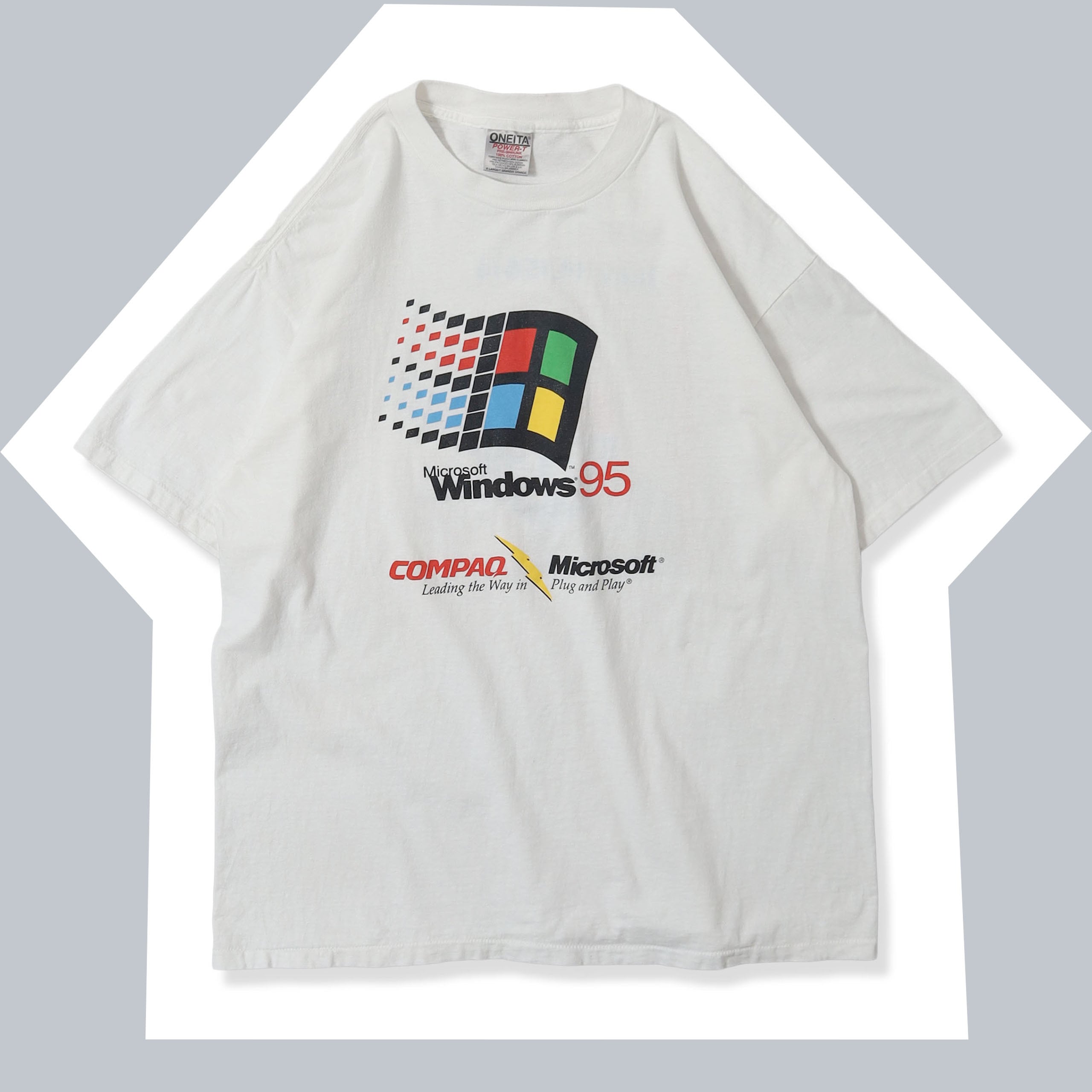 恐らくMicrosoftとCOMPAQが共同で開催したWindows関連のイベントのTシャツです。フロントに大きくWindowsの旧ロゴがプリントされたTシャツは、数パターン当ショップでも販売してきましたが、こちらは初入荷のデザイン。フロントもバックも存在感のあるプリントに、やはりWindowsロゴのインパクトと2社のロゴプリントがとてもかっこいいデザイン。なかなか見かけることのない希少な1枚です。