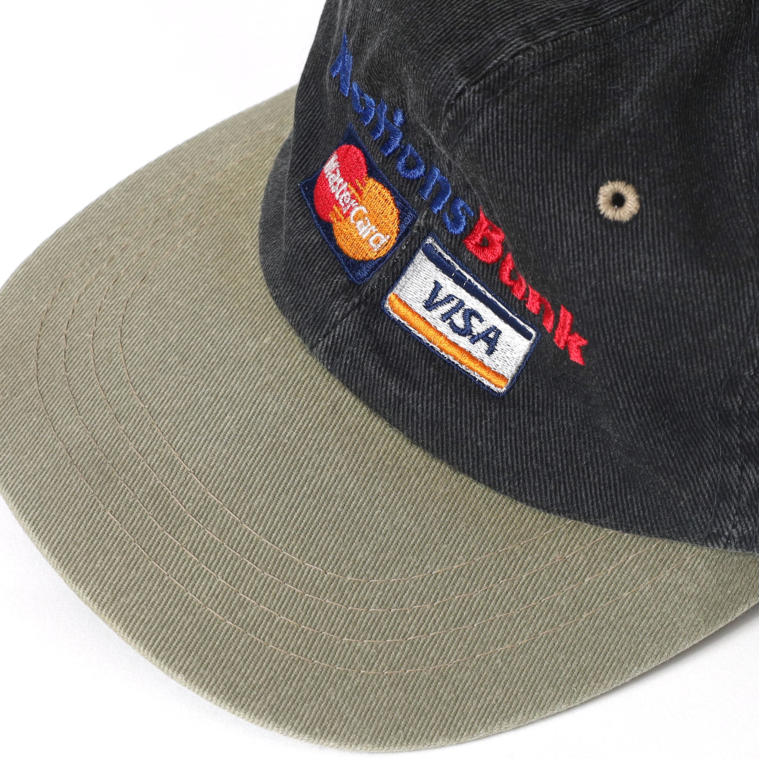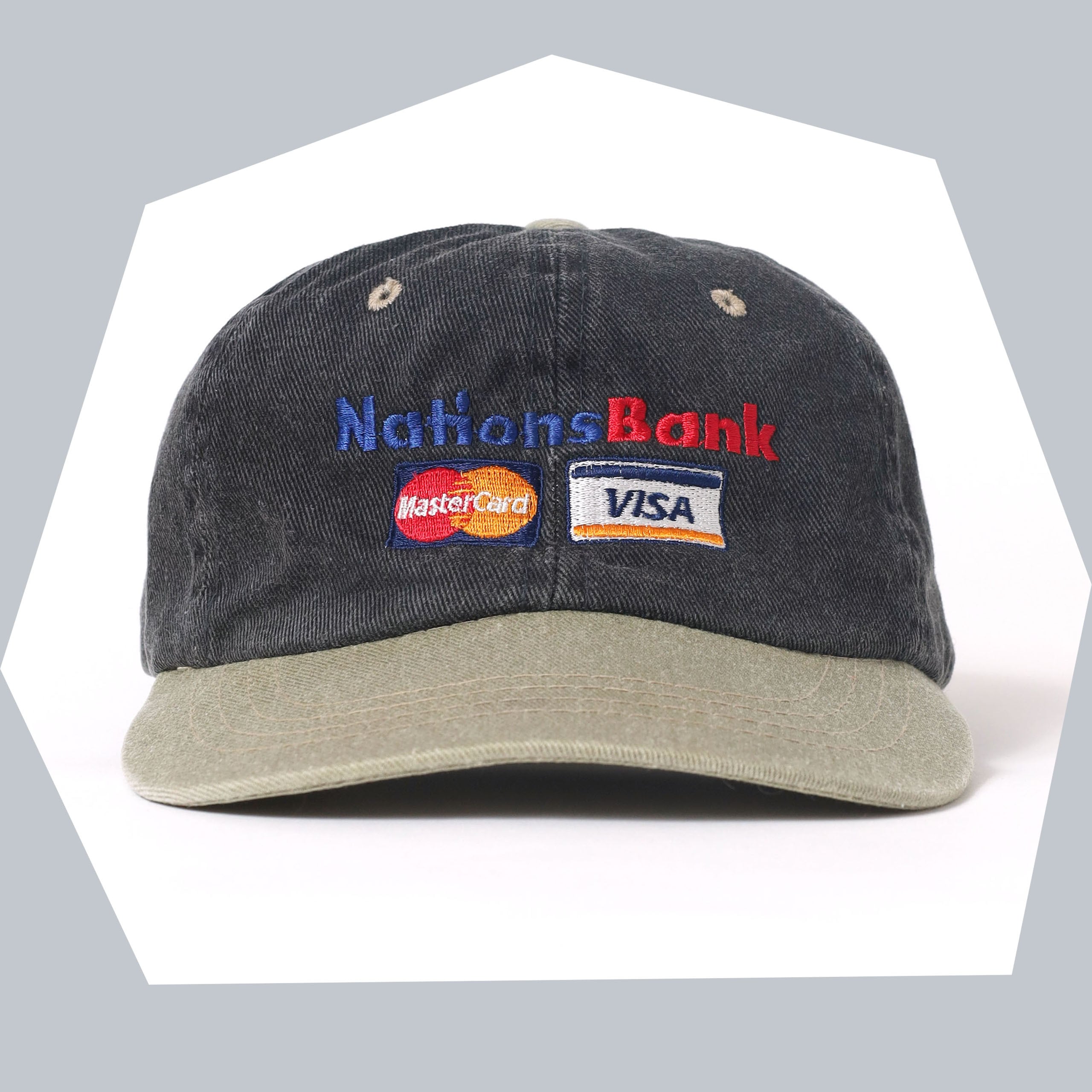 現在はBank of Americaに吸収合併された、アメリカ最大級の銀行 "Nations Bank" のプロモキャップです。Nations Bankの2トーンのロゴに加え、Master CardとVISAのロゴがとてもかっこいいデザインです。カードブランドのロゴ系のキャップって探すと本当にないんですよね。ボディのカラーリングもいいですし、とてもわかりやすいデザインですのでハズしにももってこいのキャップです。