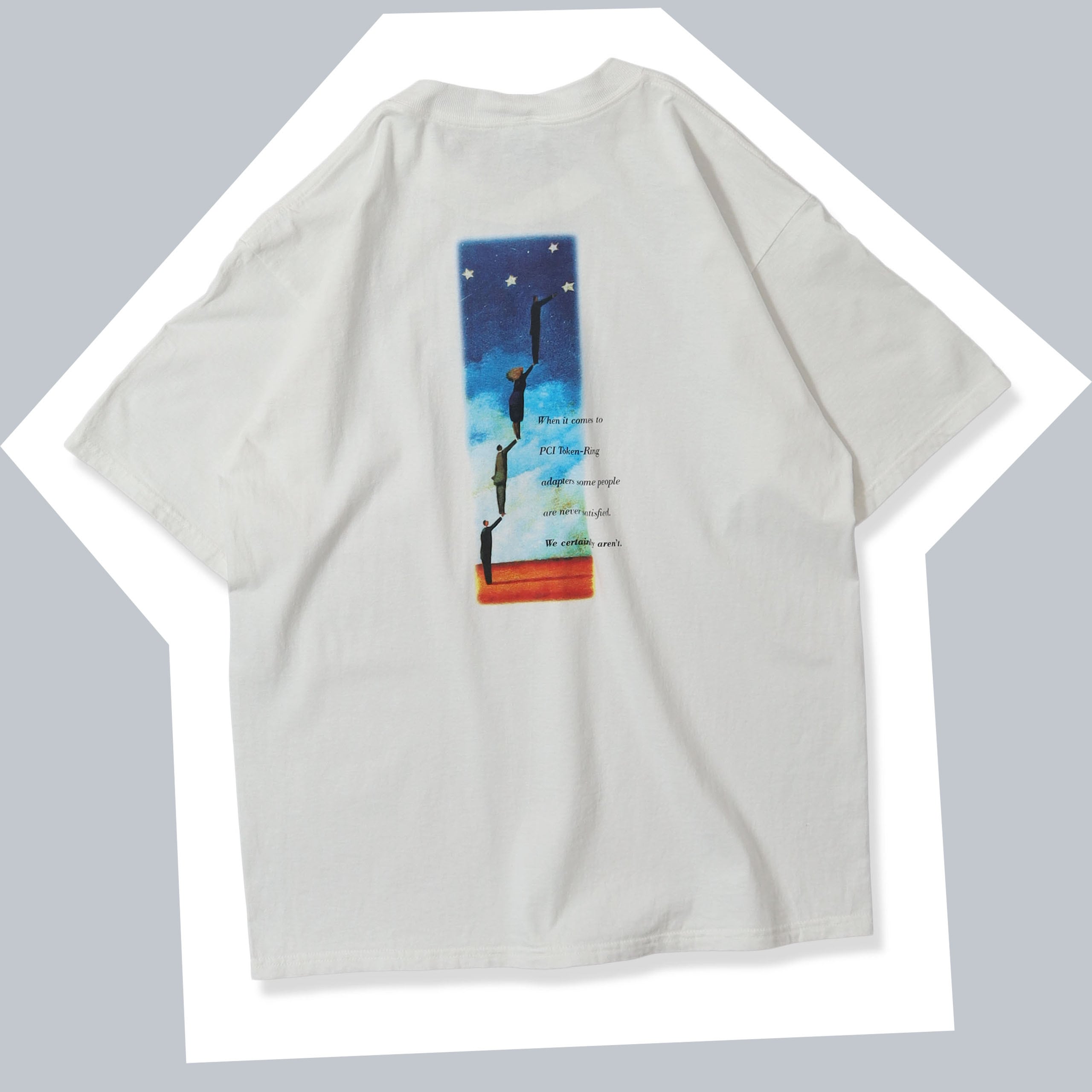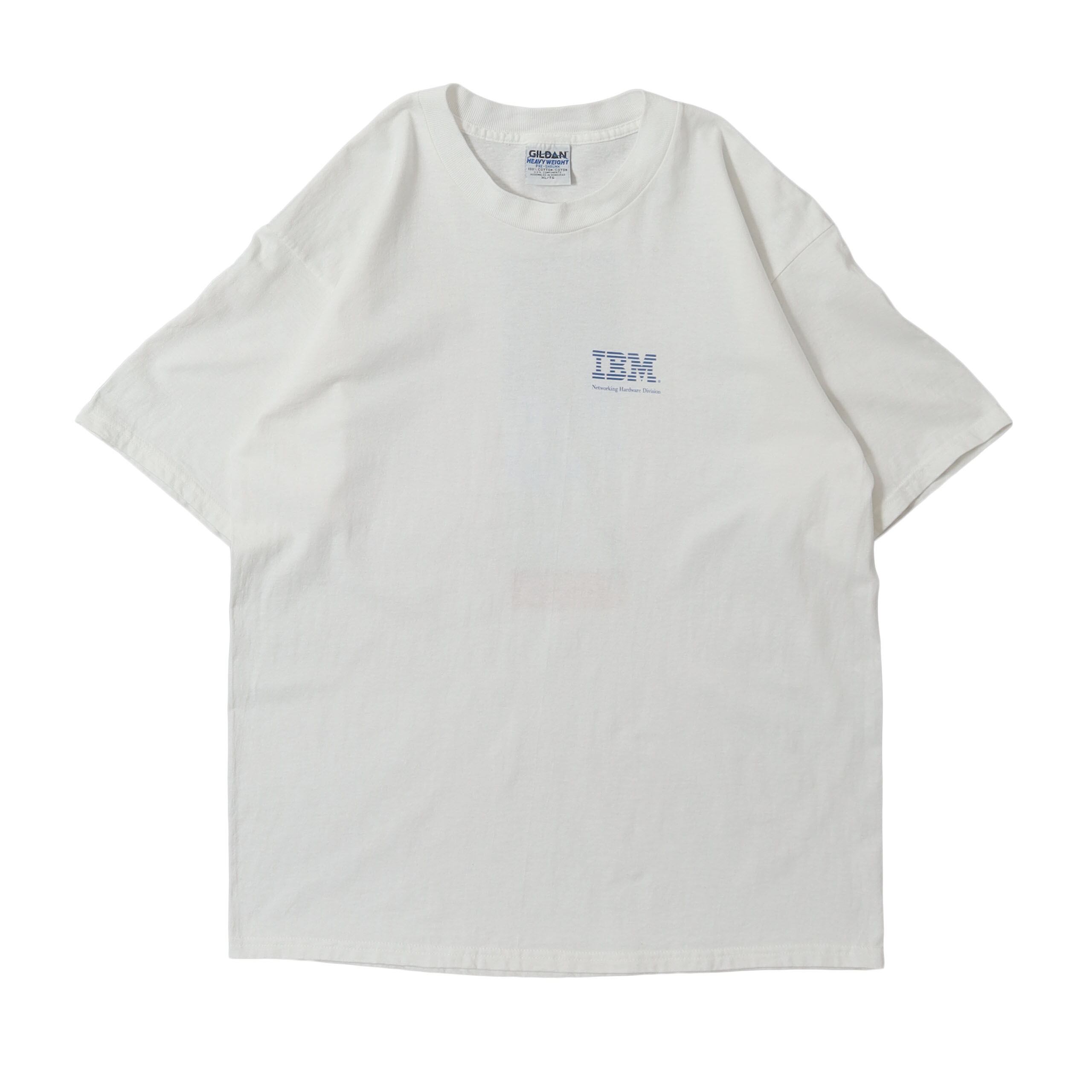IBMのプロモTシャツです。このデザインはおそらく初めての入荷だったかと思います。フロントの胸元にロゴとバックに象徴的なプリントの、企業Tでは定番のバランスですが、アートTのようなバックプリントのデザインがとてもいい雰囲気の1枚。この企業らしいブルー基調のカラーリングも嬉しいポイントで、サイズも状態もバッチリです。