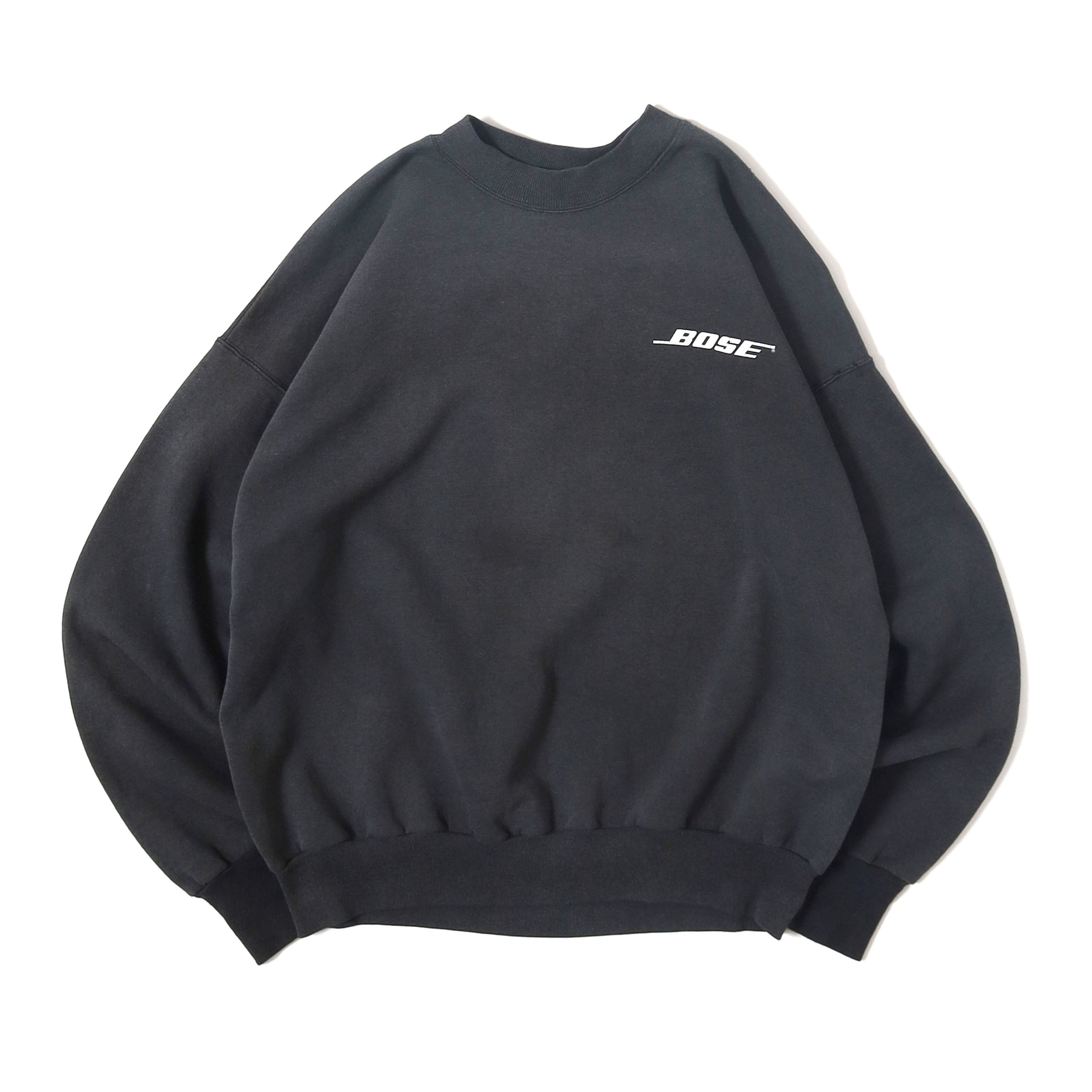 BOSEのスウェットです。BOSEのプロモアイテムといえばTシャツがほとんどで、皆様もそのイメージが強いかと思います。そんな中こちらはなかなか見かけないスウェットで、胸元のさりげないBOSEのロゴがニクいバランスで、とても企業モノっぽい雰囲気です。またフェードしたブラックのカラーも雰囲気抜群で、古いスウェットならではの身幅広めのボックスシルエットもとてもかっこいいです。