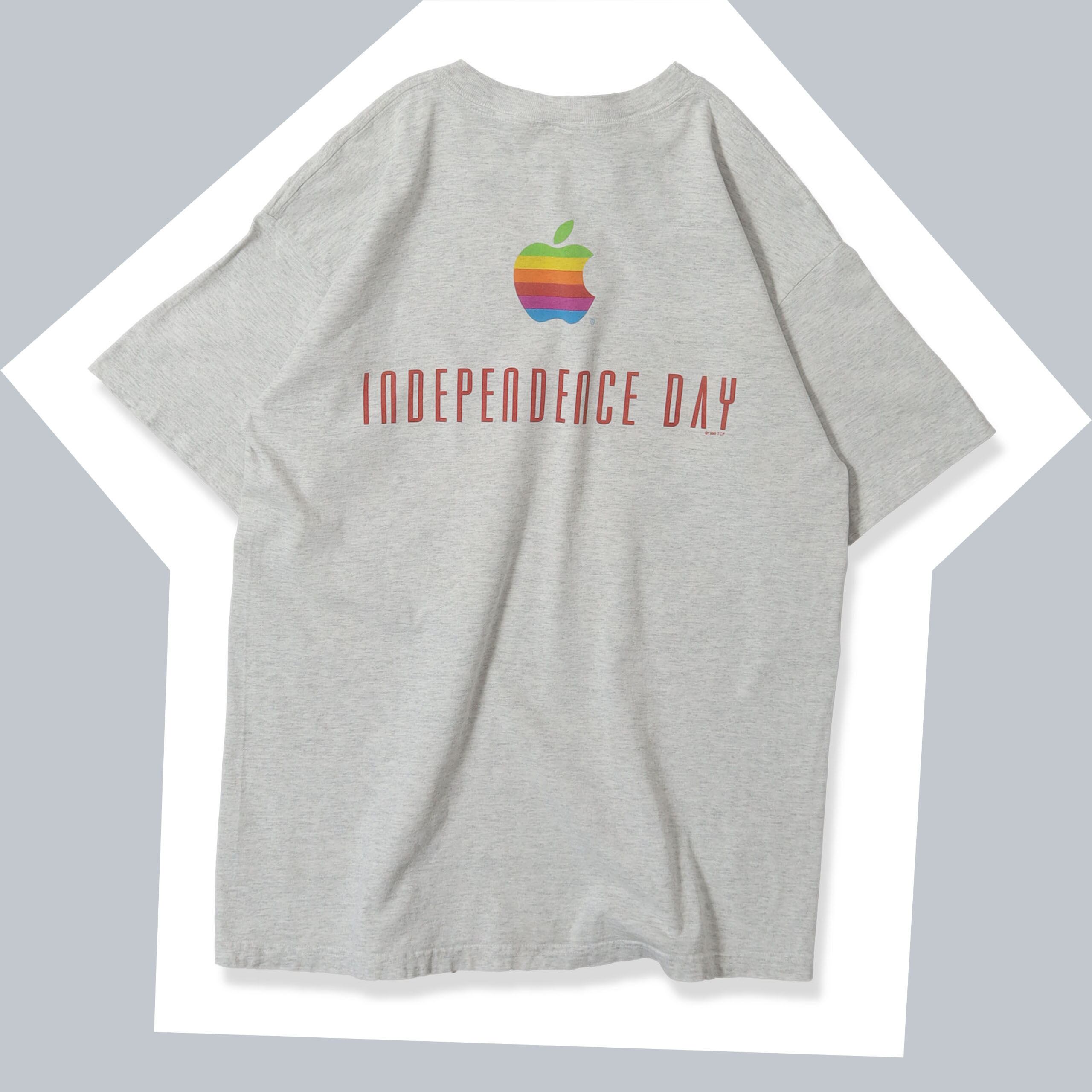 映画インディペンデンスデイとおそらく主要スポンサーであるAppleのプロモTシャツ。入荷のたびに注目度の高いこちら。フロントの iD4はプロモーション用の略記で、 "4" はアメリカの独立記念日(7月4日)に由来して付けられています。ムービー系のプロモTシャツでApple関連というかなり珍しい1枚で、グレーボディにレインボーのAppleマークがとてもいい雰囲気のデザイン。存在感はありながら、スッキリとまとまったバランスもとてもかっこいいです。
