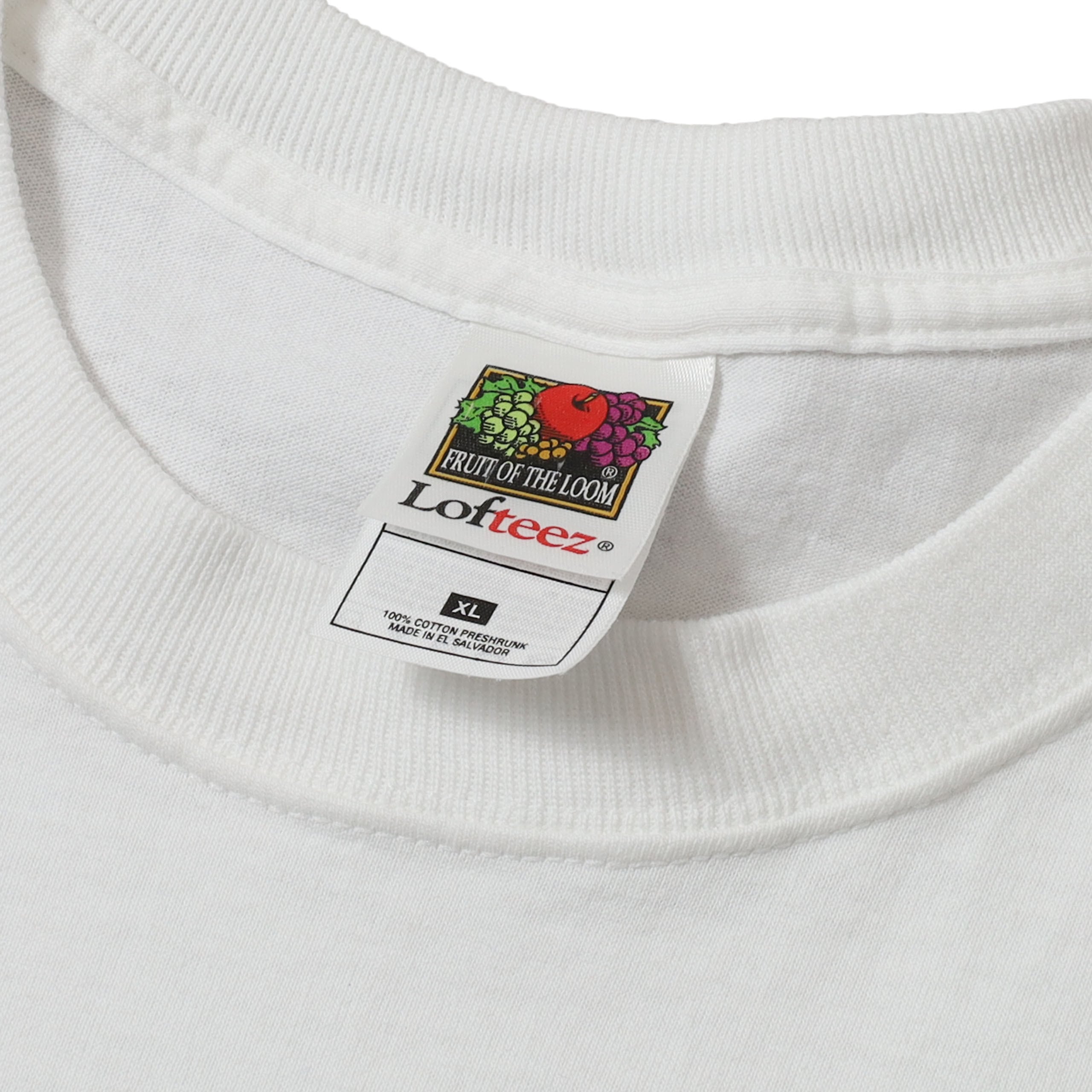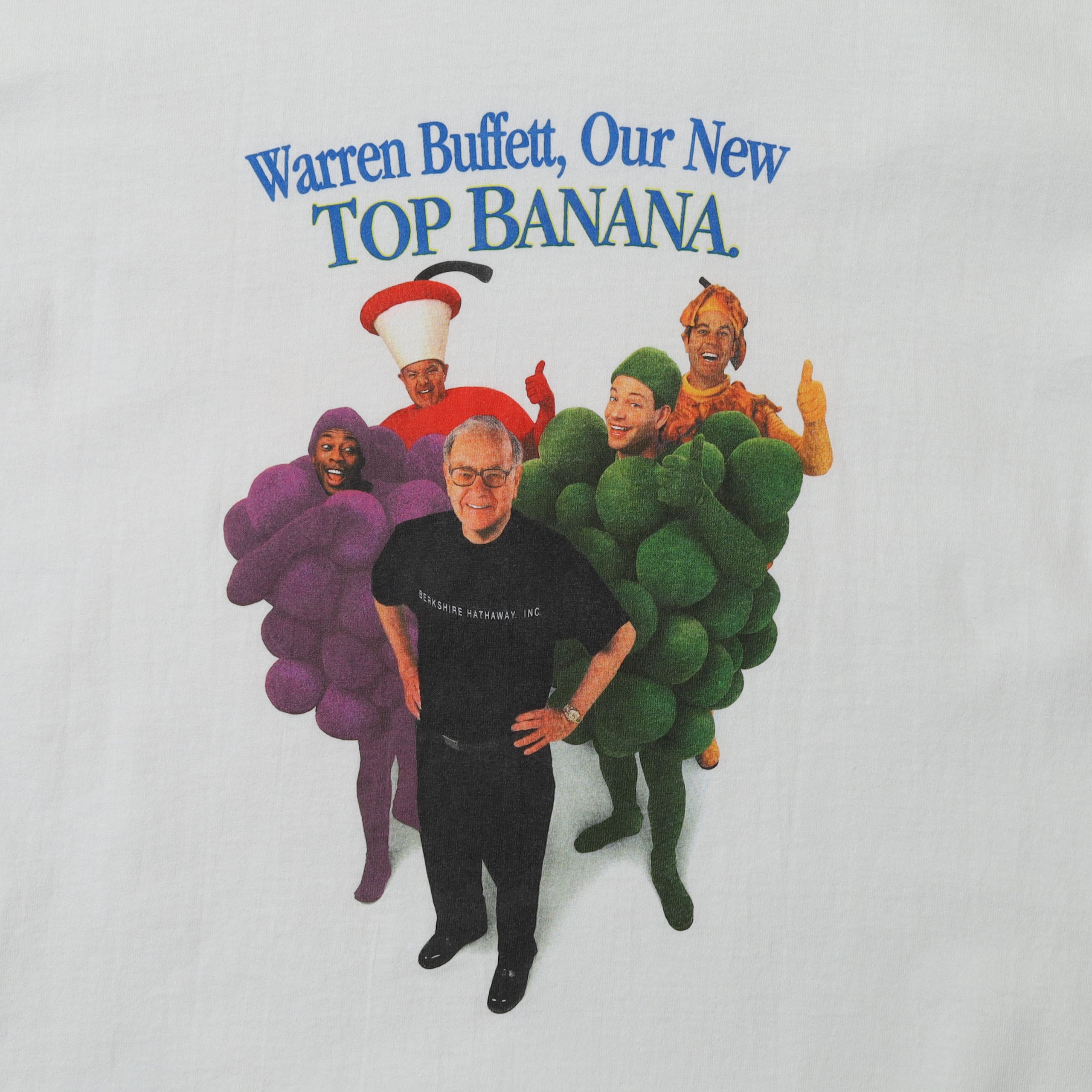 Warren BuffettのプロモTシャツです。このTシャツは当ショップでも人気が高いのですが、なかなか出てこない希少な1枚。Top Bananaというのは重要人物やリーダーを表す言葉ですので、この企業(恐らくバークシャー・ハサウェイ?)のキーマンたちがプリントされているのだと思います。広告で使われるモデルのようなプリントではなく、こういったしっかり本人や関連した人物がプリントされたデザインというのは、企業Tの中でもかなり珍しいです。そんな少しの違和感と、デザイン・カラーリングが最高の1枚です。このデザインはLサイズをよく見かけますが、XLというのもポイントです。