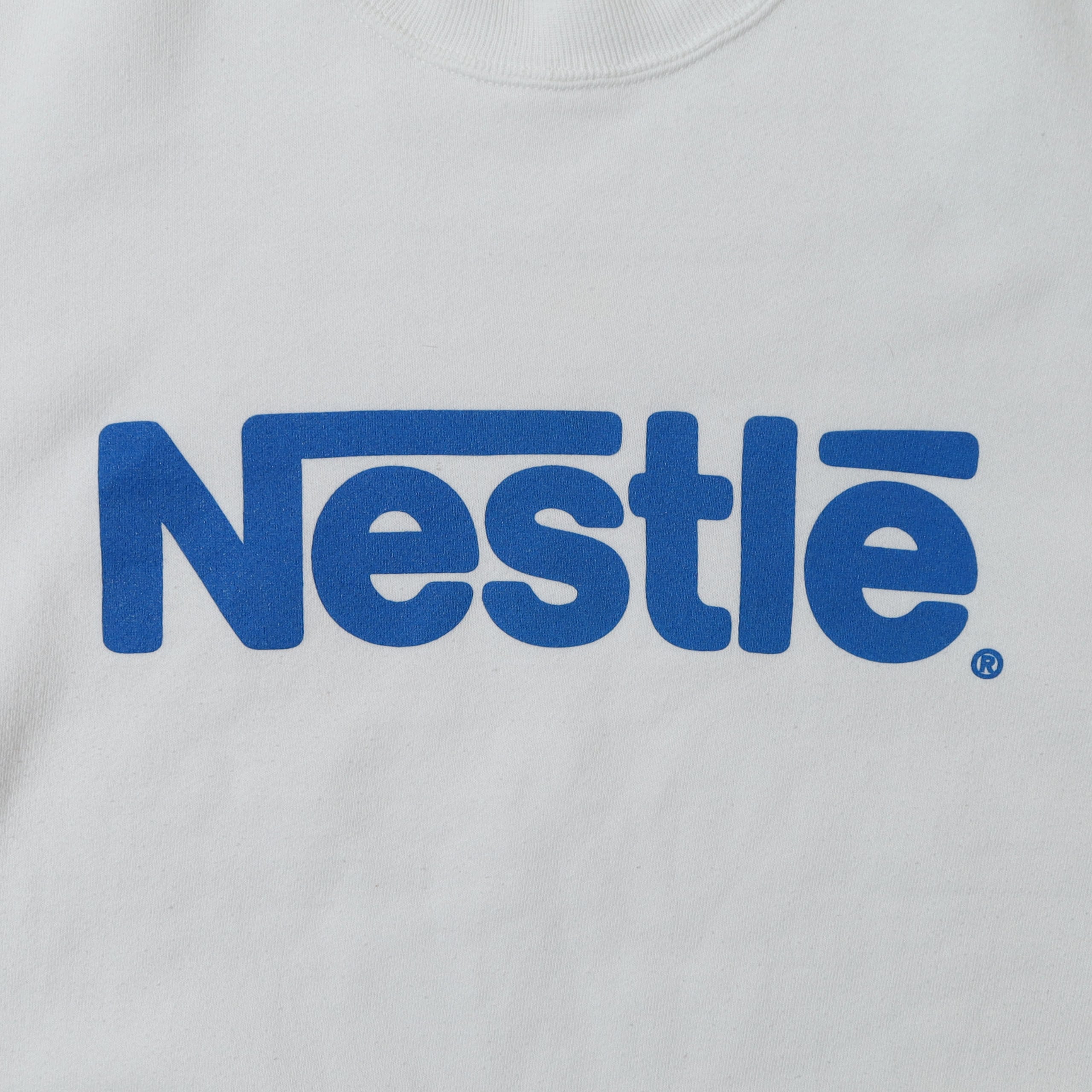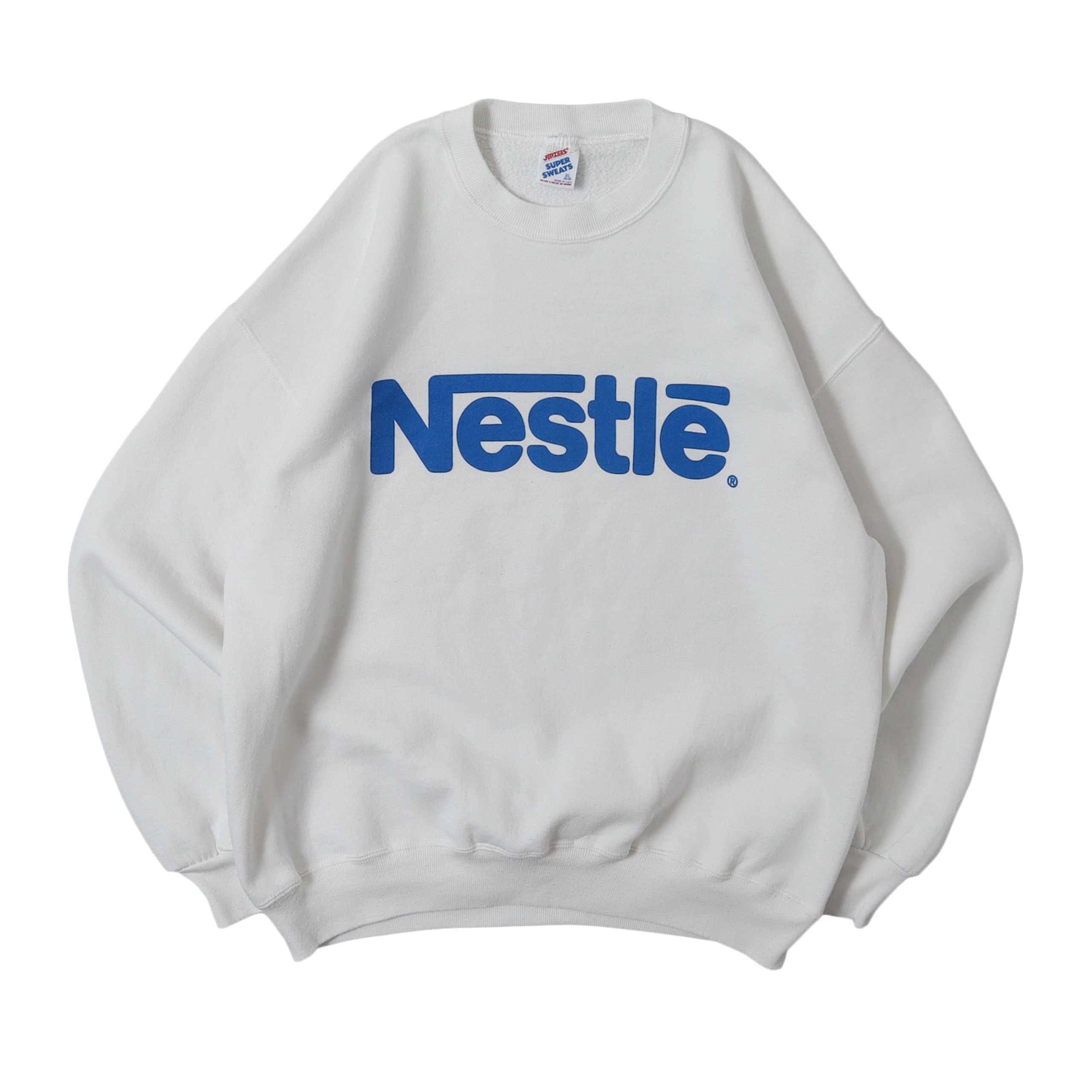 Nestleのプロモスウェットです。こういったフロントにロゴが分かりやすく入るデザインのものは、バックプリントがないものが多いですが、こちらは両面にプリントが入るのがポイント。白ボディに爽やかなブルーのプリントのカラーリングもとても良いですし、どこか可愛らしさも感じる雰囲気はこの企業ロゴだからこそかと思います。ここまで分かりやすいデザインで、クセのないものもなかなかありません。広くオススメ出来る1着です。