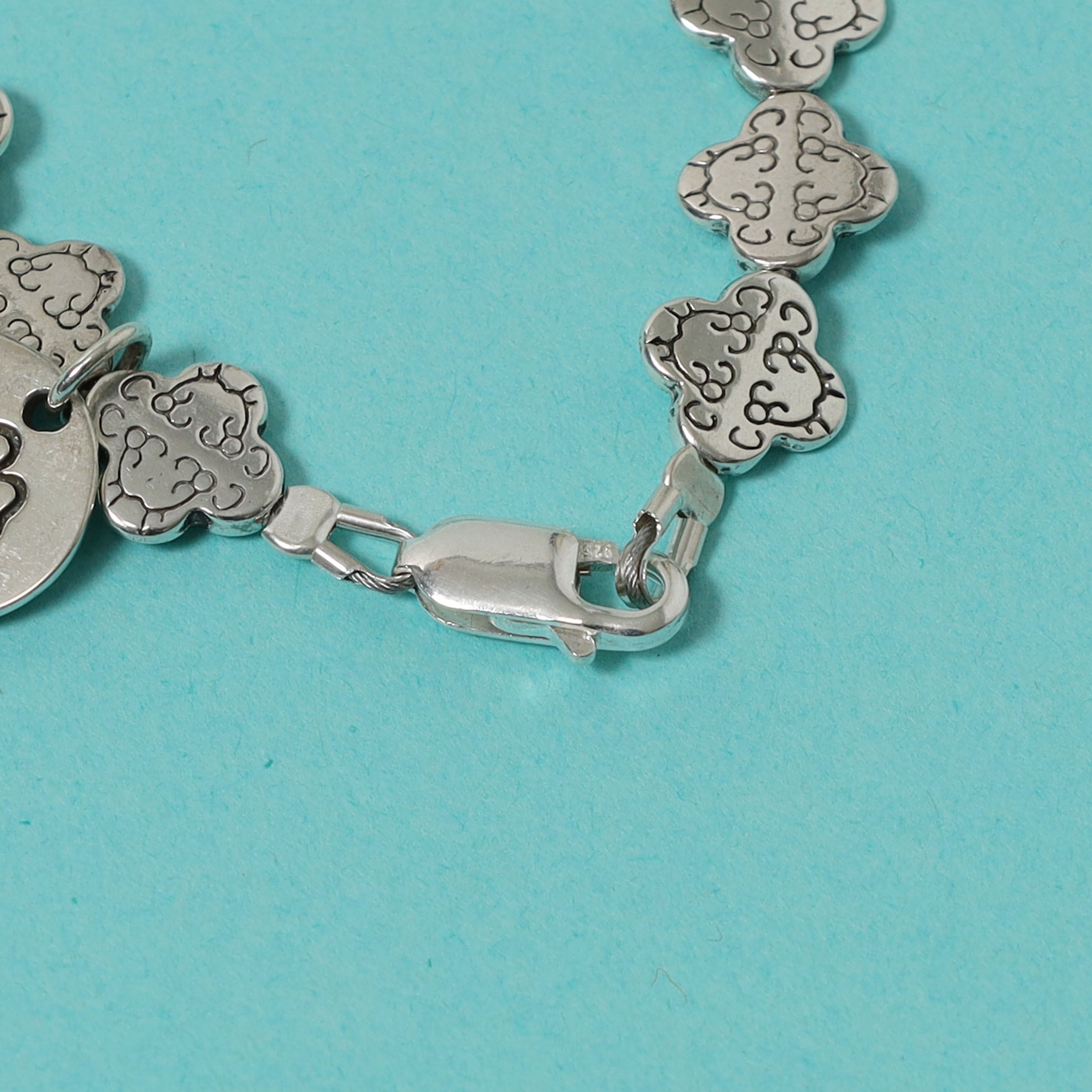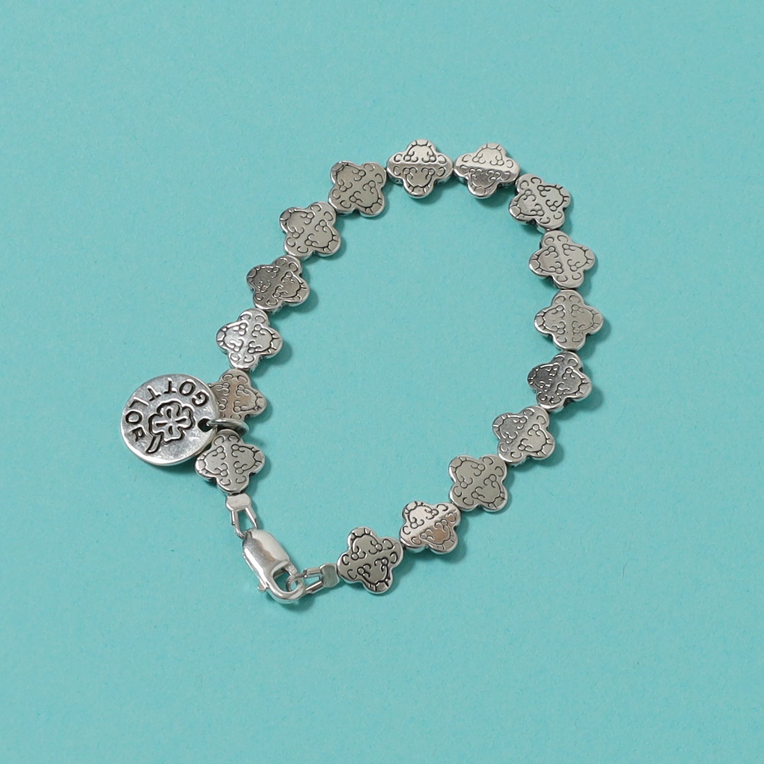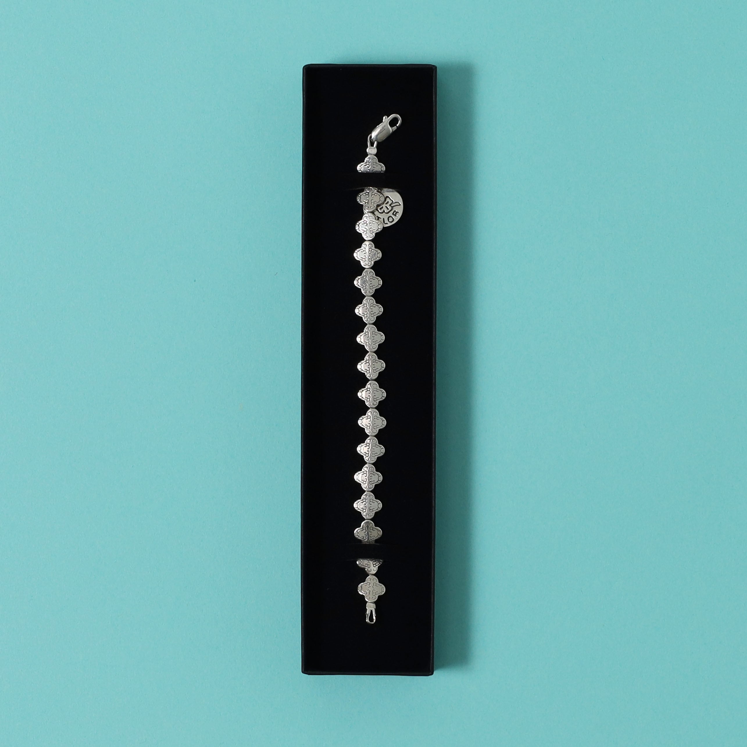 このブランドを象徴するクローバーをモチーフにしたデザインが印象的なシグネチャーモデル。シルバー925を使用した、このブランドの中でも一番ハイエンドなモデルです。こちらは他のブレスレットと違い、留め具で留めて着用する仕様です。