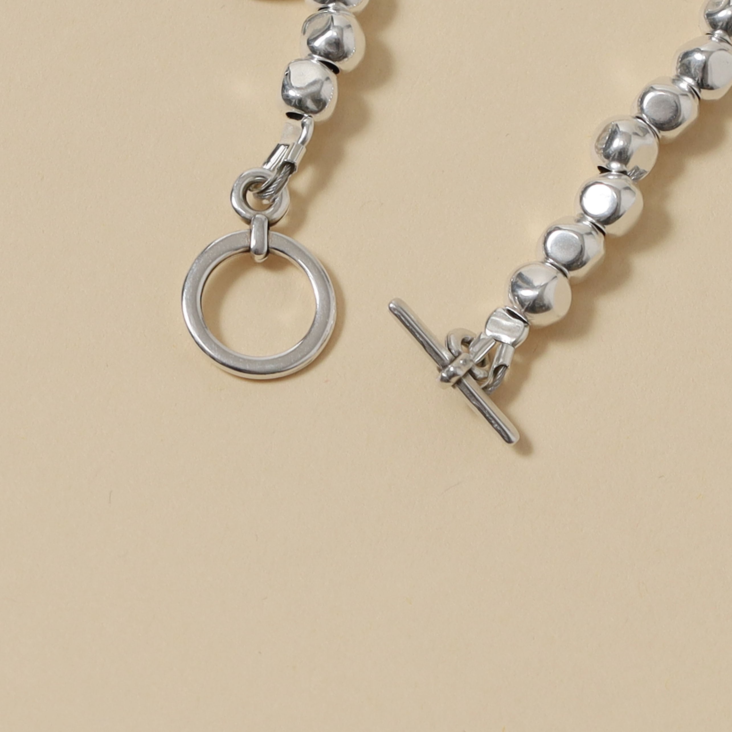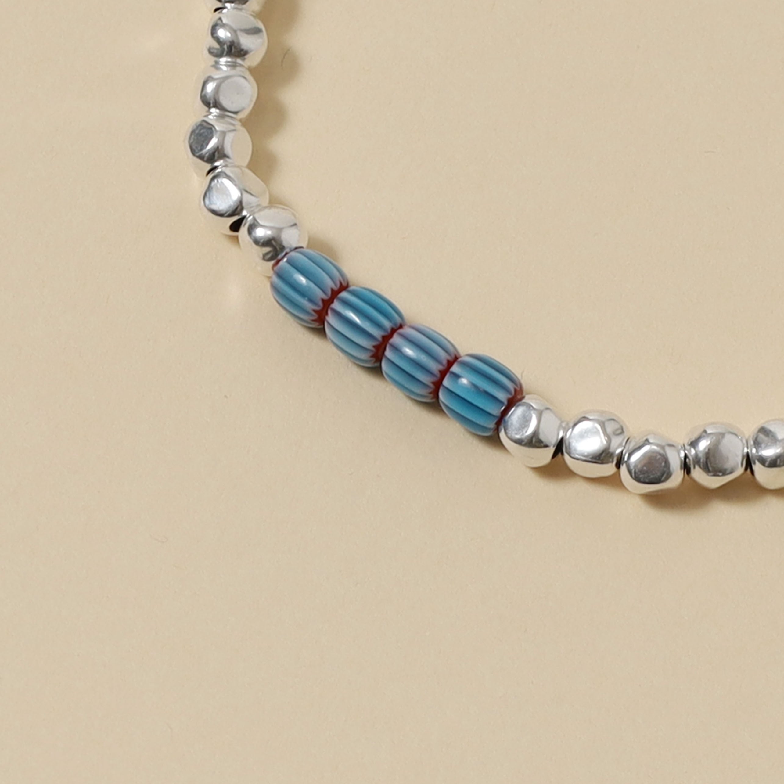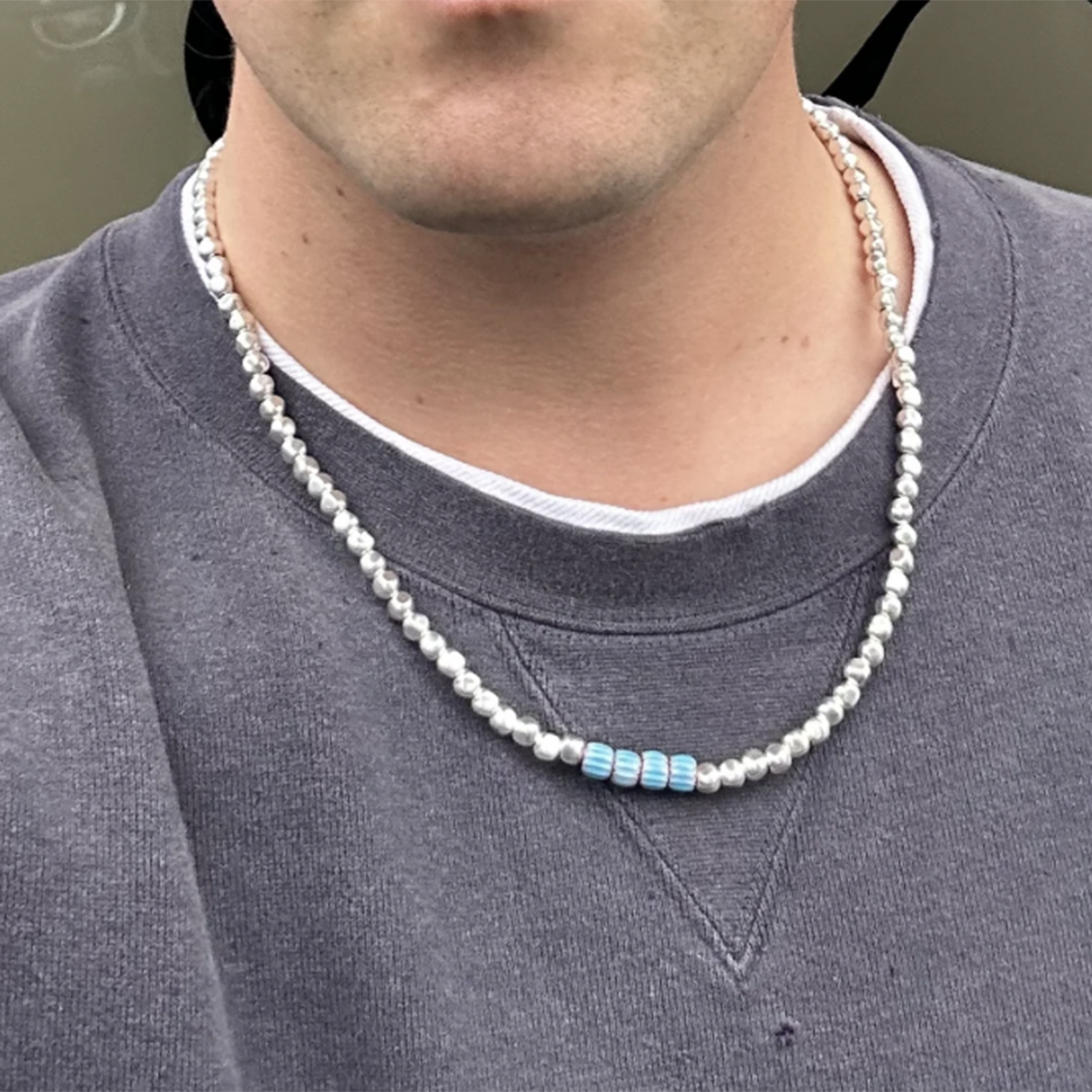 形が微妙に異なるビーズを使用したネックレス。4つの鮮やかなカラーのビーズが印象的で、色々なカラーがあるなか今回はターコイズをセレクトしました。付けてみるとターコイズが非常に映えます。ネックレス特有のいやらしさがなく、さまざまなスタイルにハマるネックレスです。