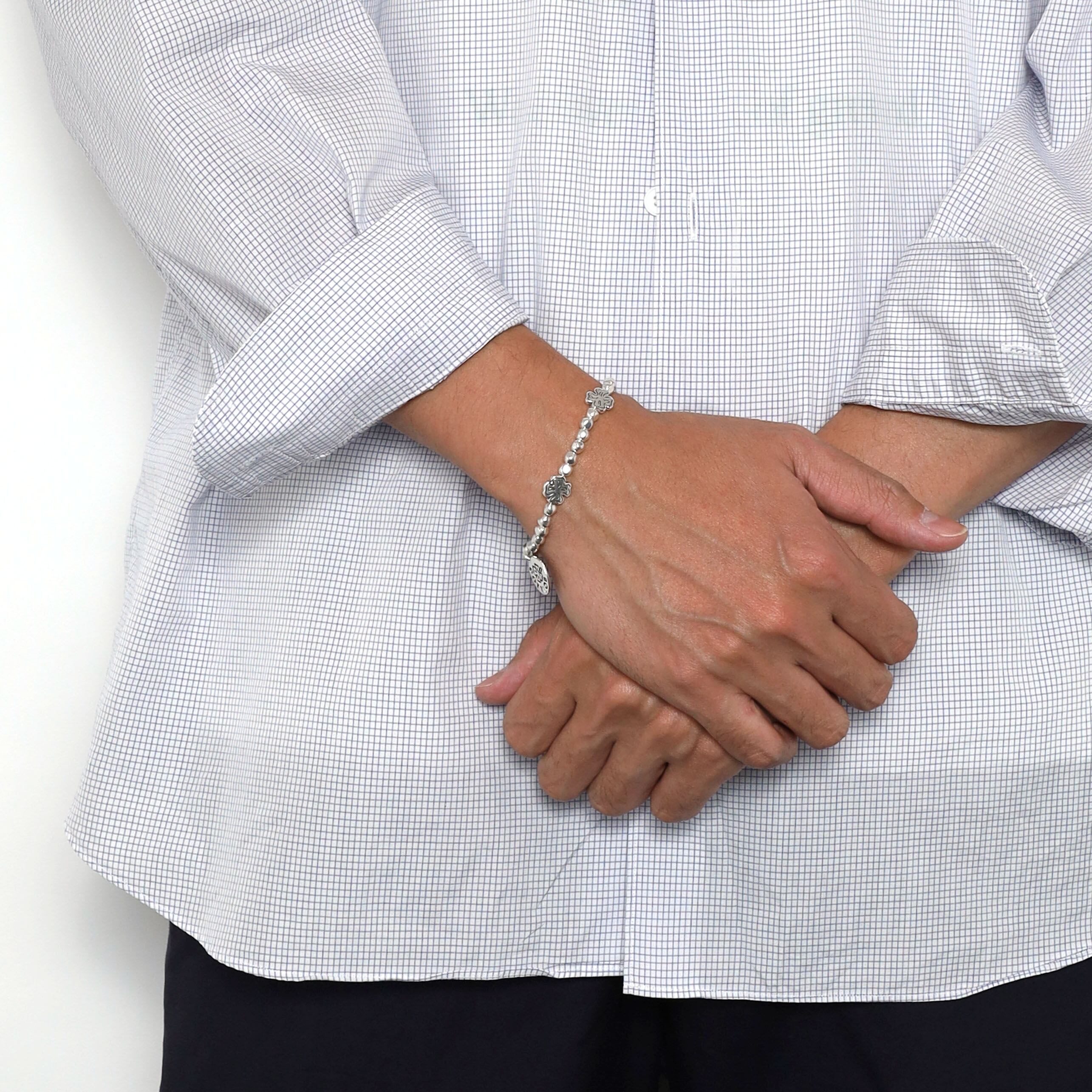 Edition No.1で使用されたクローバーに比べ、より本物のクローバーに近いデザインのチャームと、イレギュラーなビーズを使用した、このブランドの良いとこどりの仕様。程よい存在感とシンプルさが共存したブレスレットです。