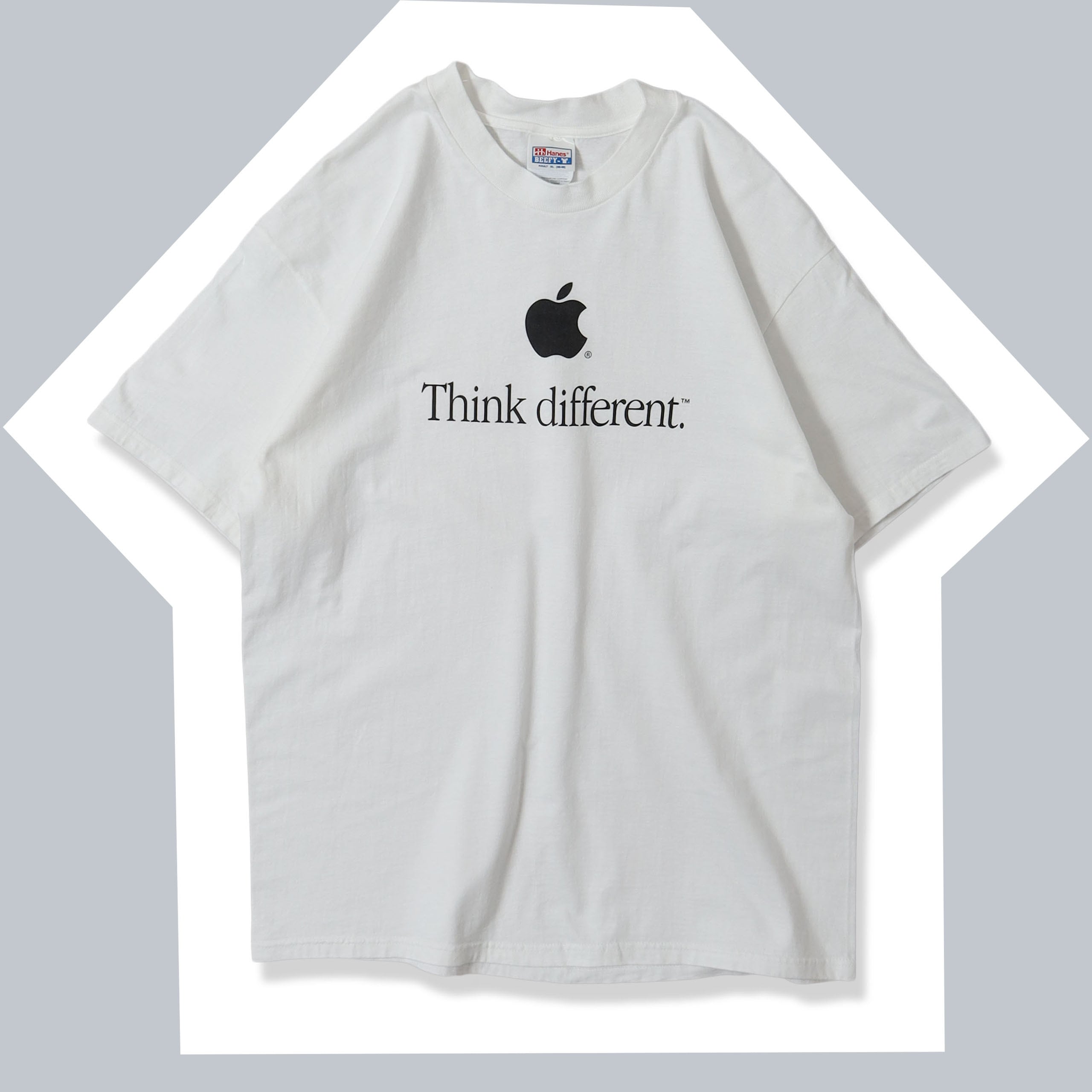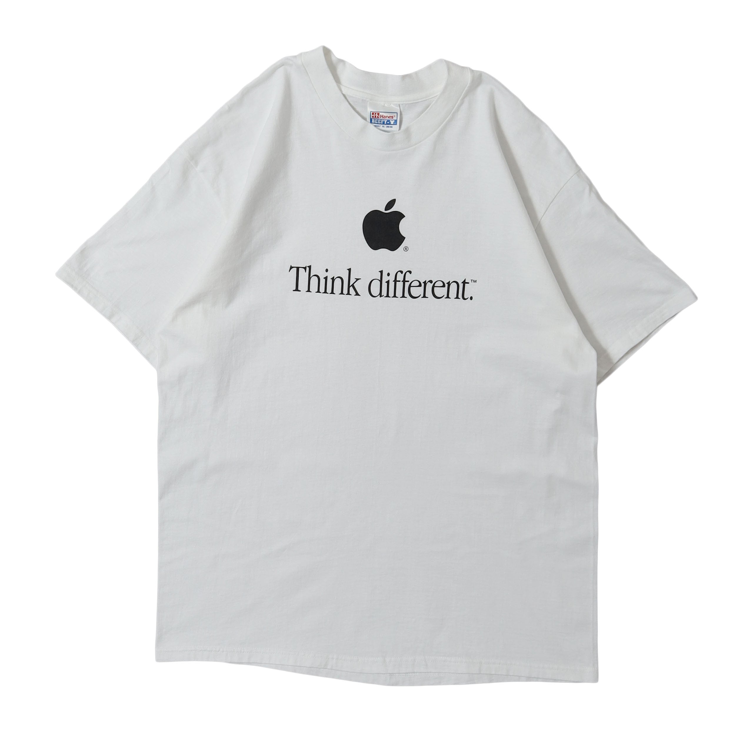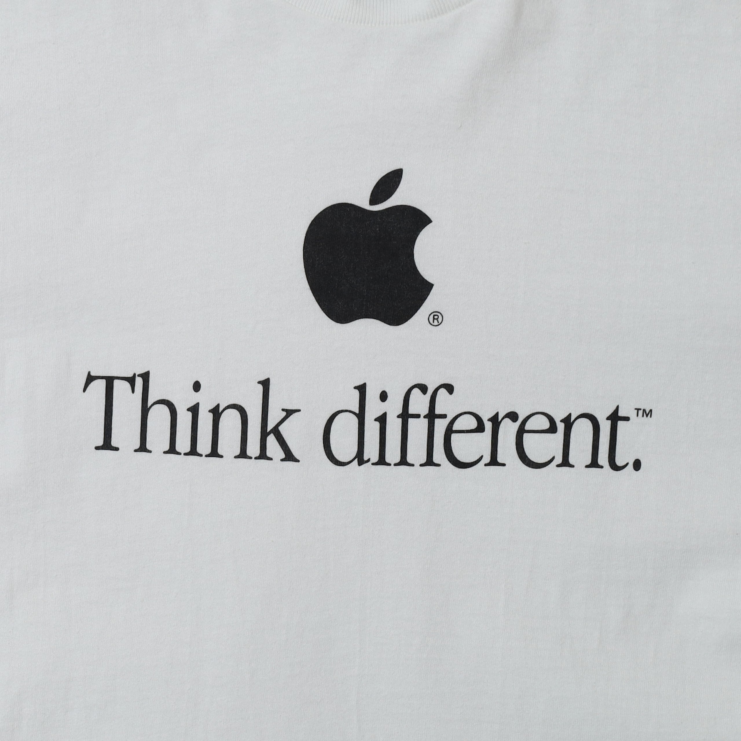 2026年企業TEEの入荷一発目に相応しいスペシャルな1枚が入荷しました。Appleの中ではレインボースペルに並ぶトップピースで、最近は一番価値の高いデザインです。 1997年から使用されたAppleの広告の象徴的なスローガンである "Think different" の文字とりんごのアイコンがシンプルにプリントされたデザインが非常にかっこよく洗練されていて、レインボースペルなんかに比べるとクセなく着用出来る1枚です。分かりやすいデザインでありながら、ここまでソリッドな雰囲気になるのは、やはりアイコンの強さとAppleのセンスあってこそ。状態もサイズもいうことなしの個体です。Tシャツにしては高価ですが、なかなかこの状態では出てこない希少な1枚ですので、是非この機会に!