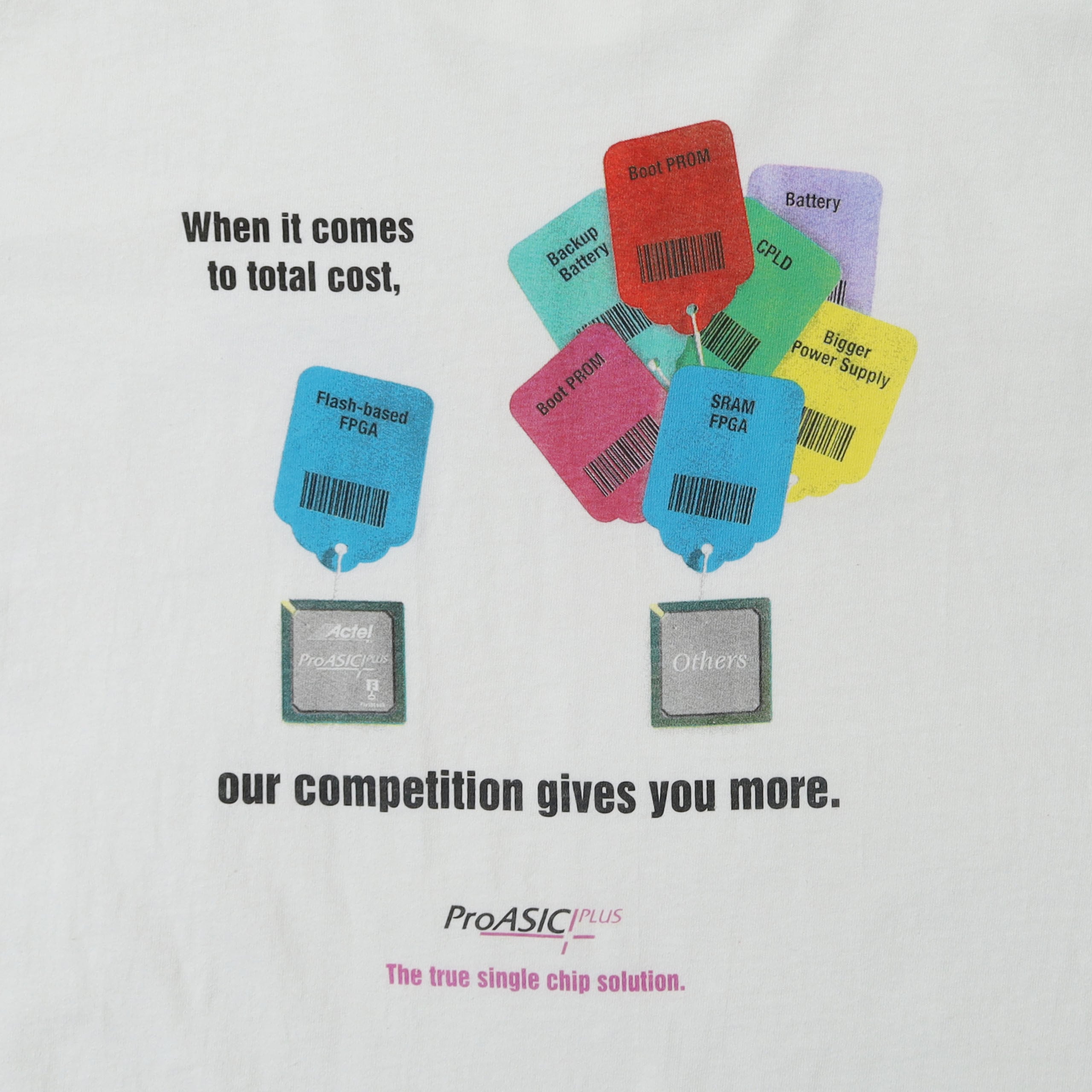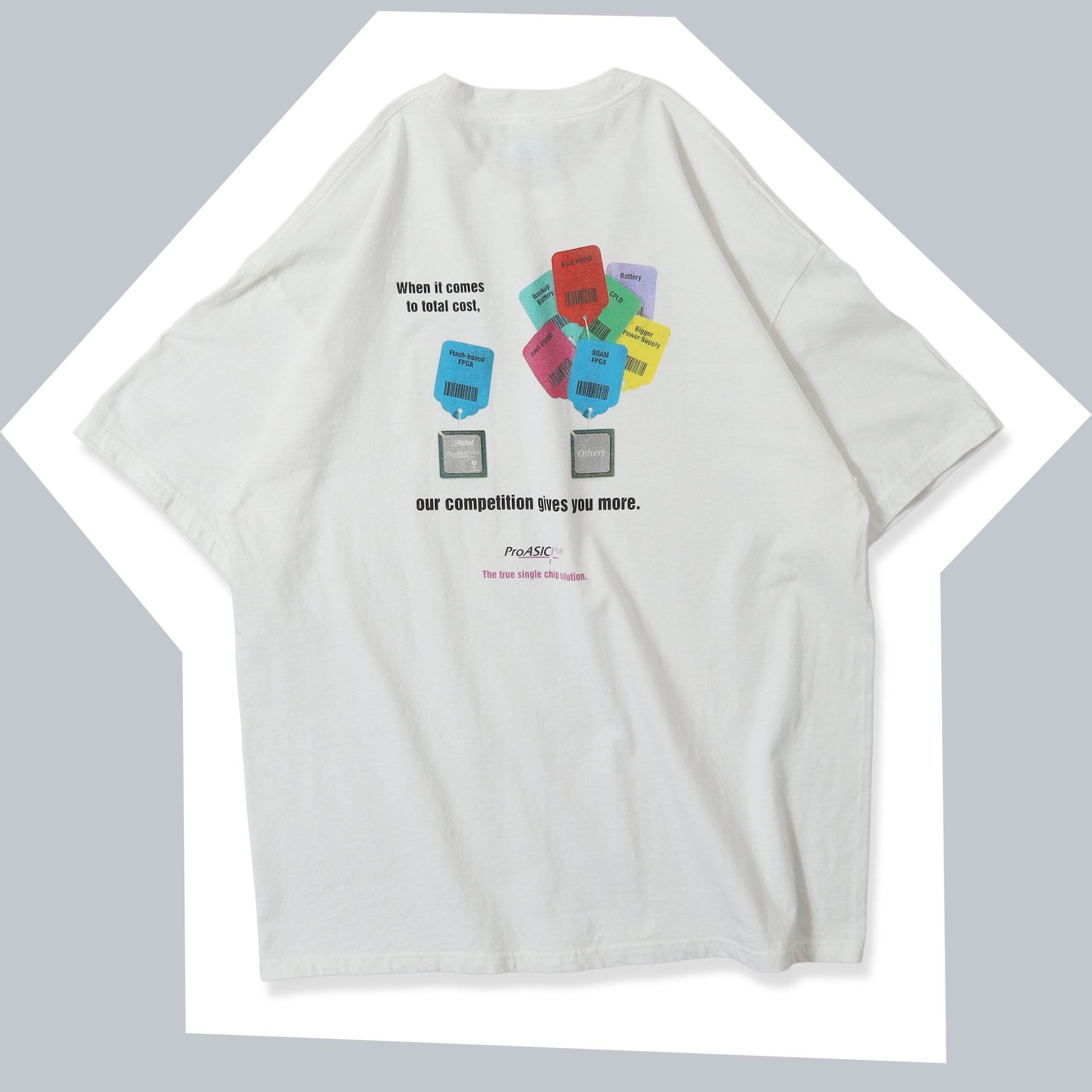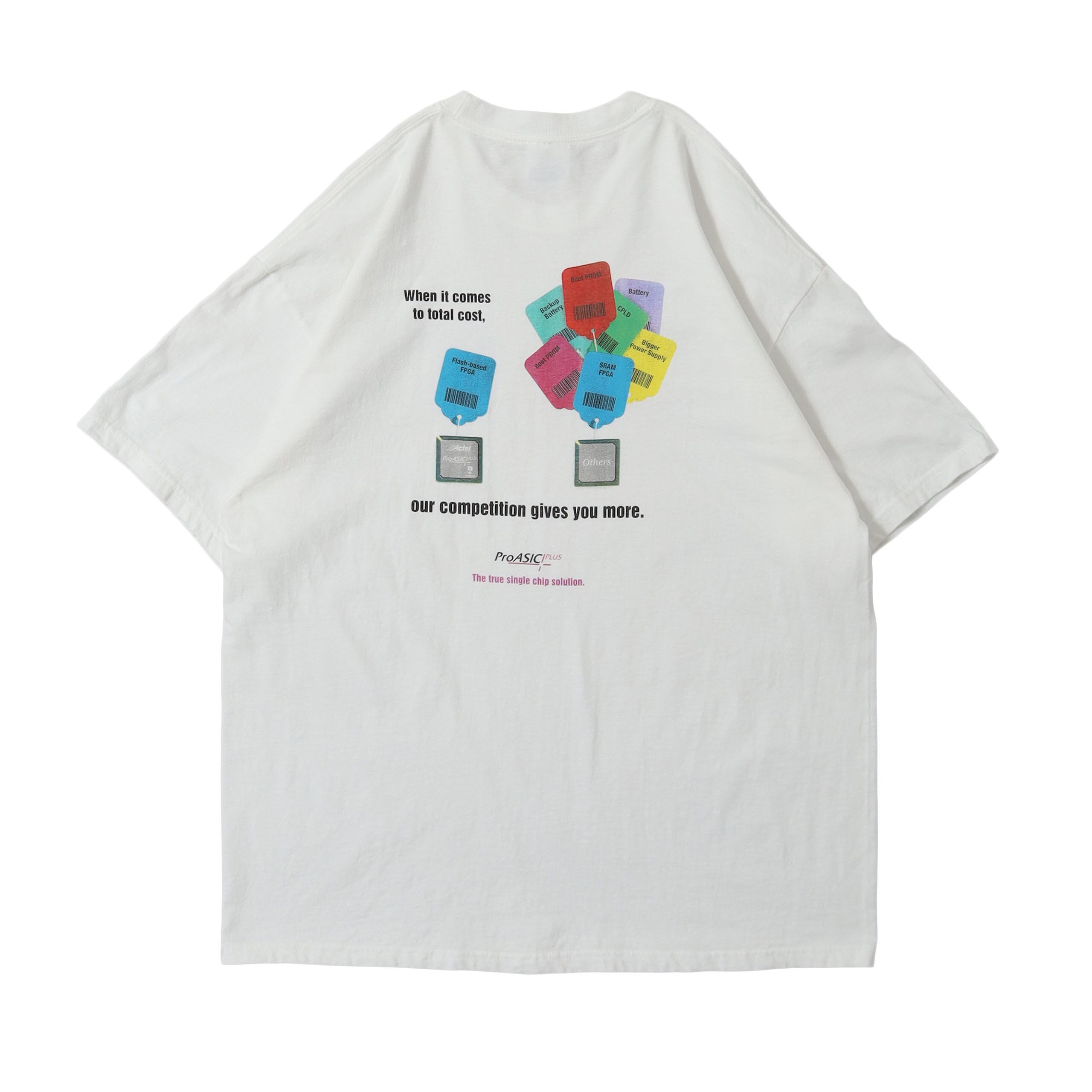 ProASICという名前の集積回路のプロモTシャツです。馴染みのない企業・製品のTシャツですが、製品のプリントにプラスされたグラフィックやメッセージ、カラーリングがとてもセンスの良い1枚です。企業T感も程よく抑えられていて、着やすい1枚かと思います。