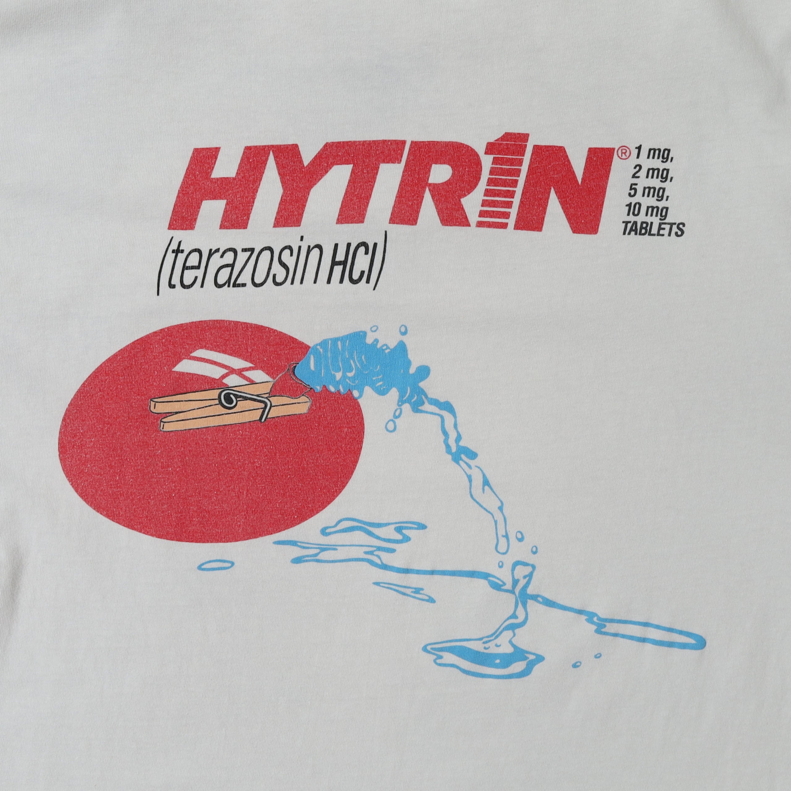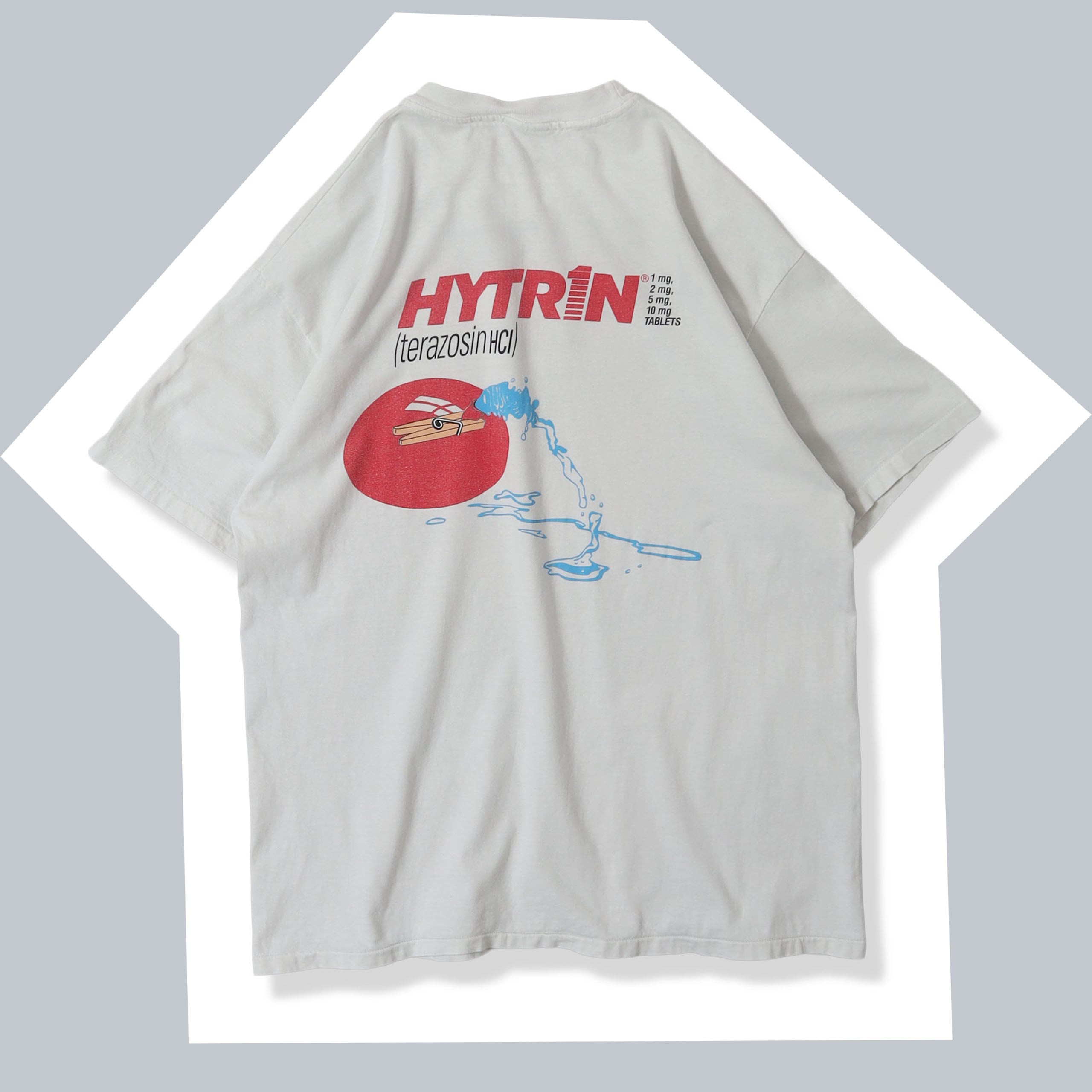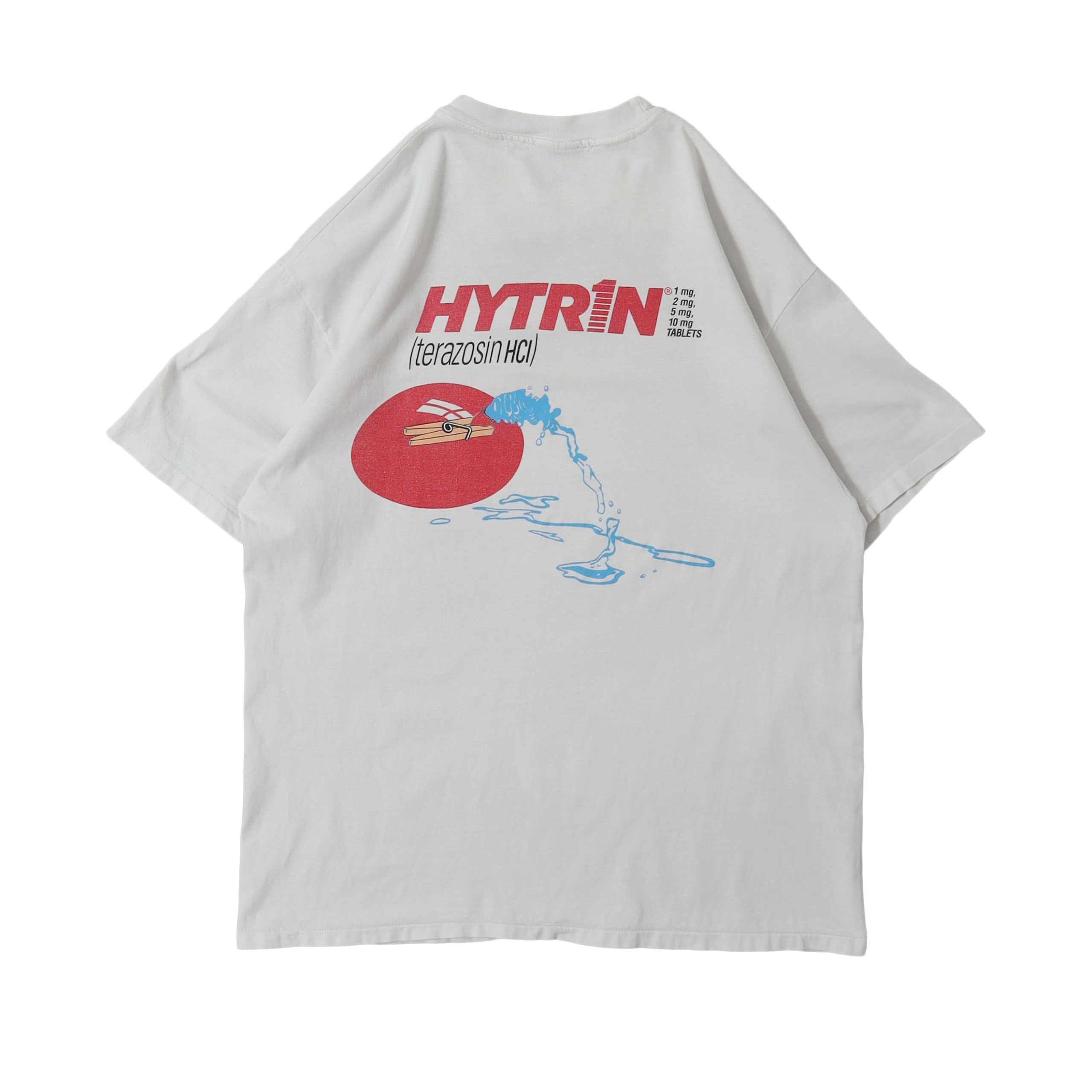 高血圧や前立腺肥大症に対して処方される "Hytrin" と呼ばれる薬のTシャツ。薬品系のTシャツはたまに出てきますが、このデザインは他のものと一線を画すデザインで、モダンでポップな雰囲気のグラフィックに、カラーリングも抜群です。かなり良いデザインではないでしょうか。プリントTとしても取っ付きやすく、企業モノ感も強すぎないので、多くの方が着やすい1枚かと思います。