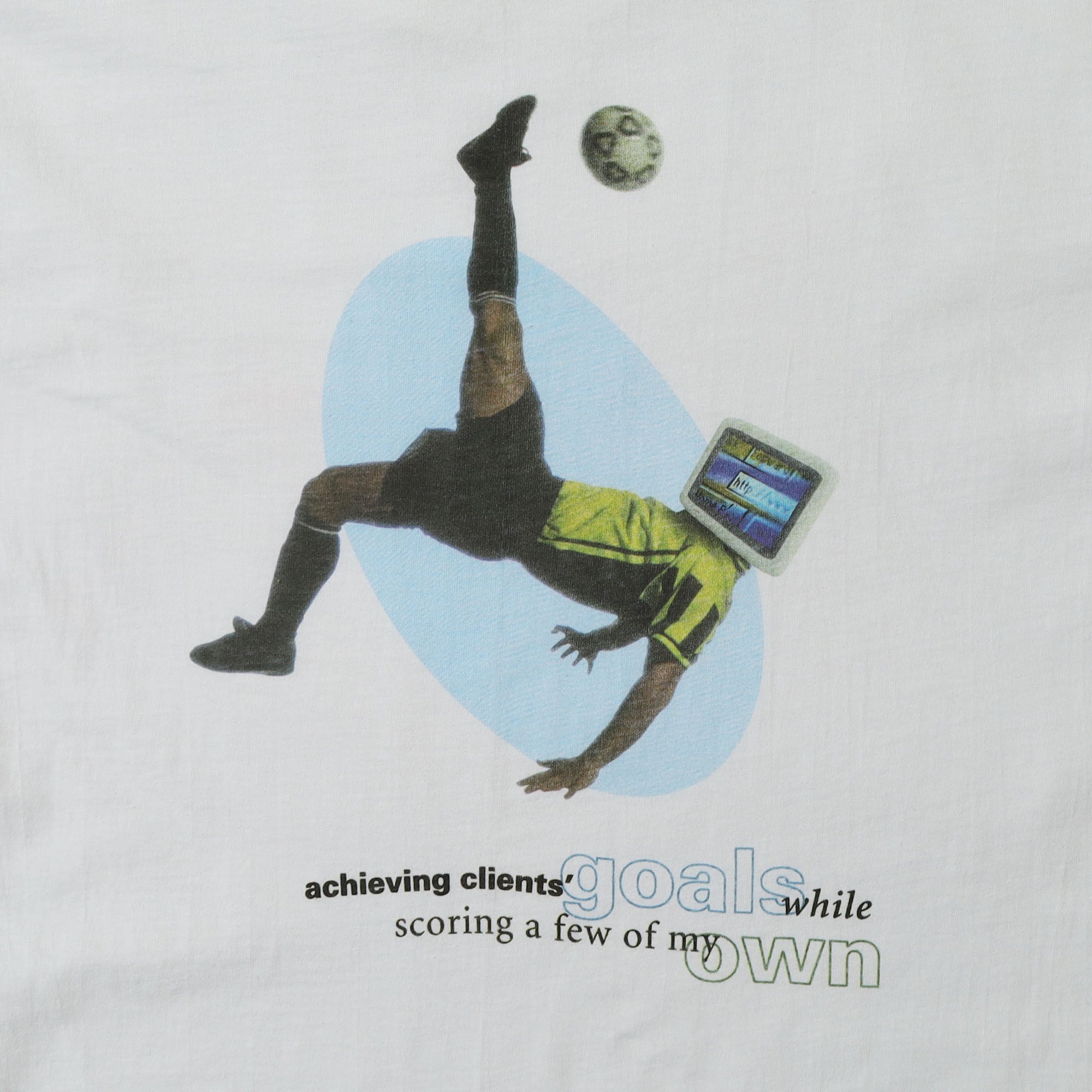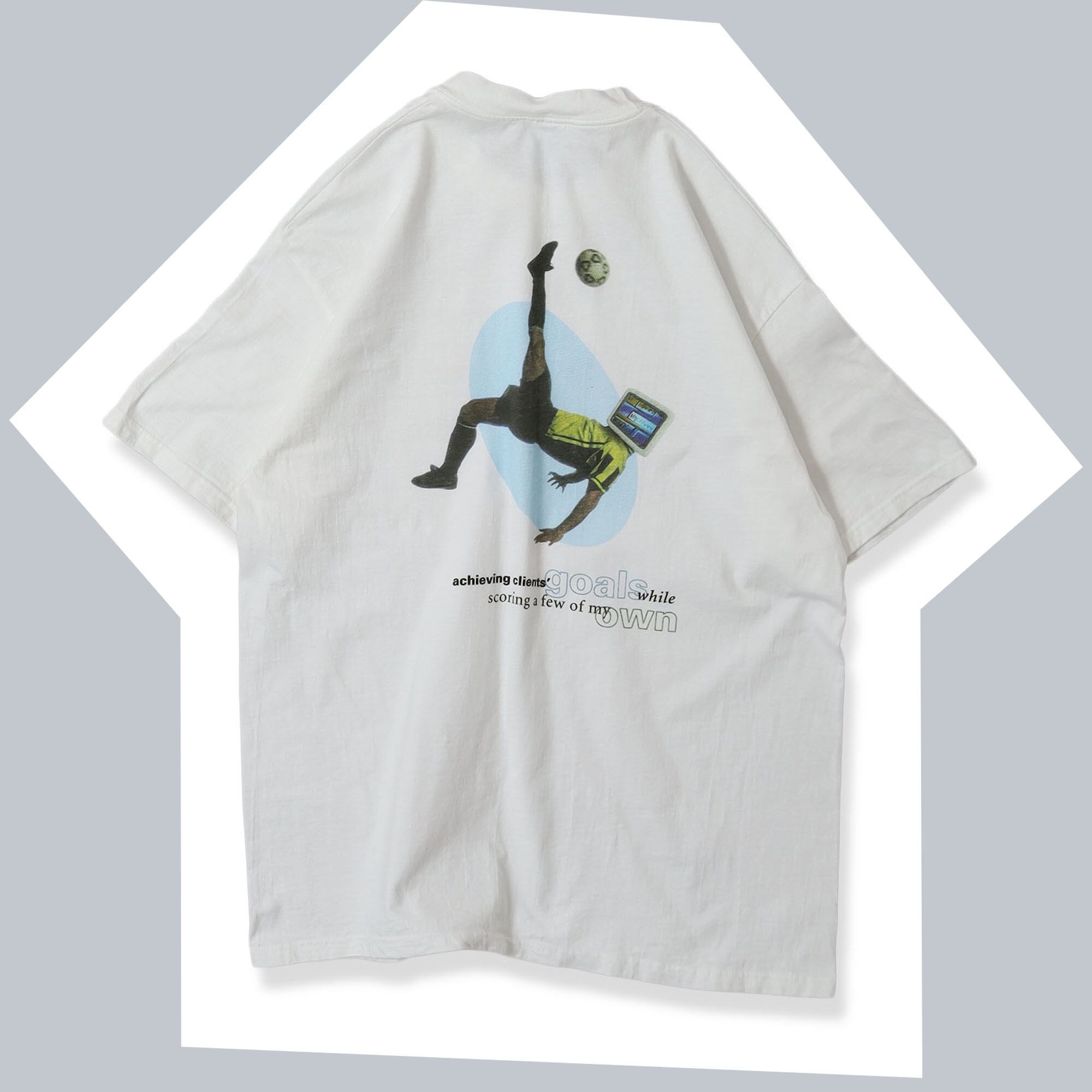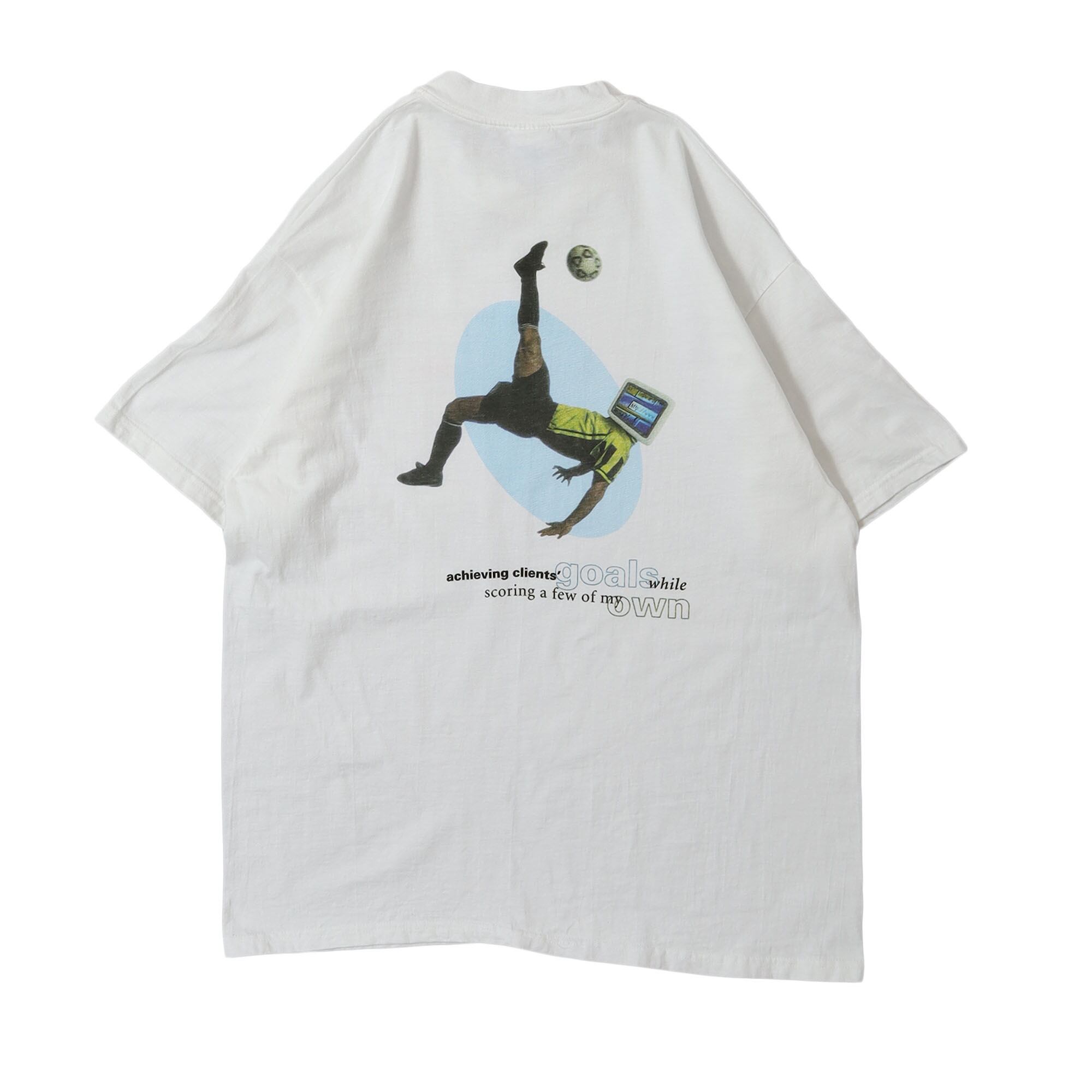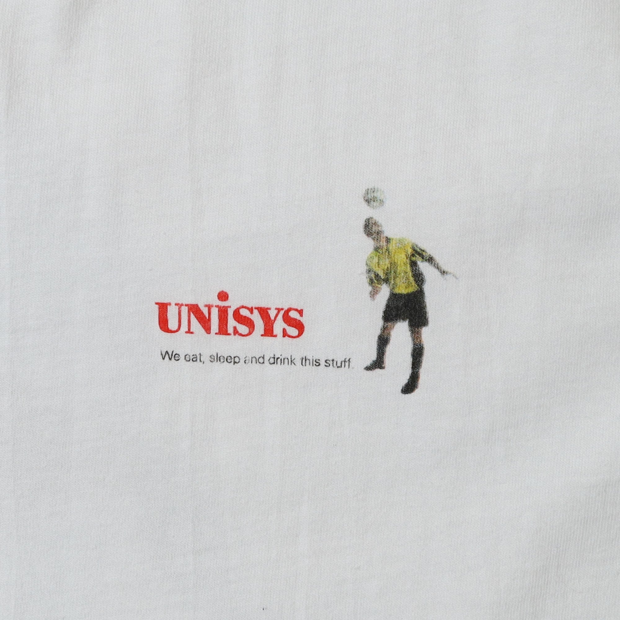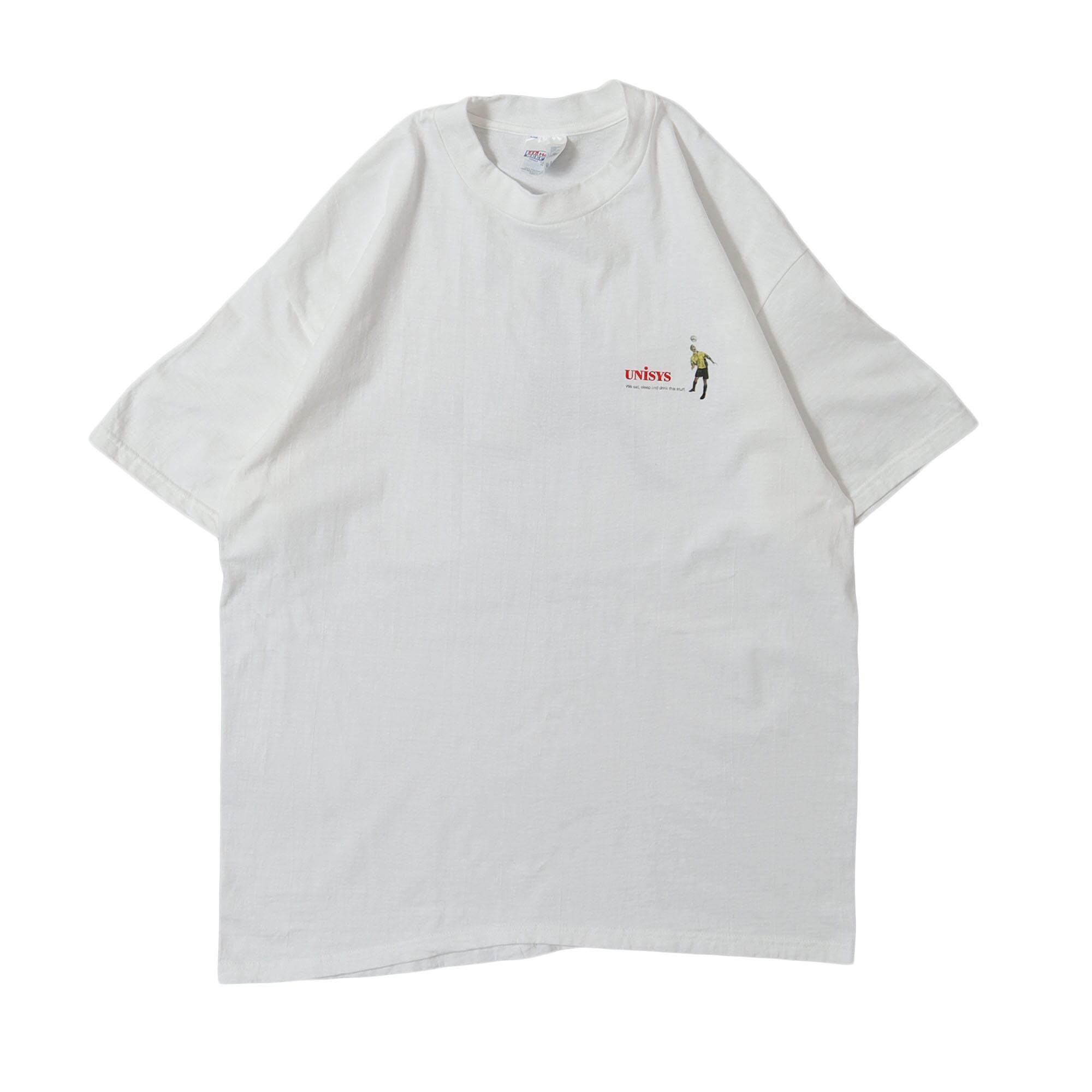 アメリカのITサービスを提供する国際的な企業 "UNISYS" のプロモTシャツです。UNISYSのものは少し変わった面白いデザインのものが多いのですが、こちらもサッカーのプレイヤーの顔がディスプレイになった、他の企業のものとは一線を画すデザイン。またバックプリントがメインですが、胸元のプリントも控えめながら非常に良いバランスです。企業TEEにしかない雰囲気のデザインですが、ロゴが前に出過ぎてないので、取り入れやすい1枚かと思います。