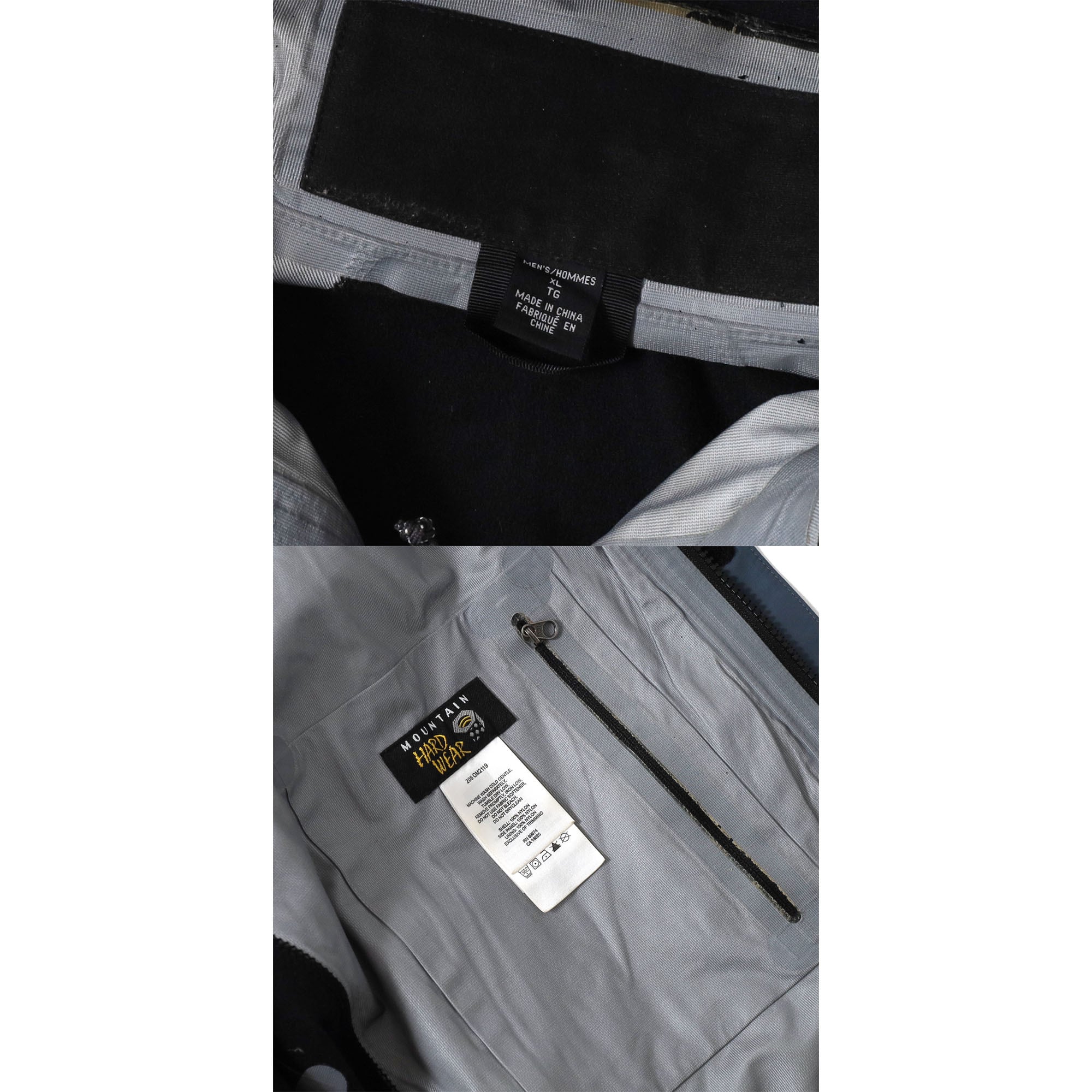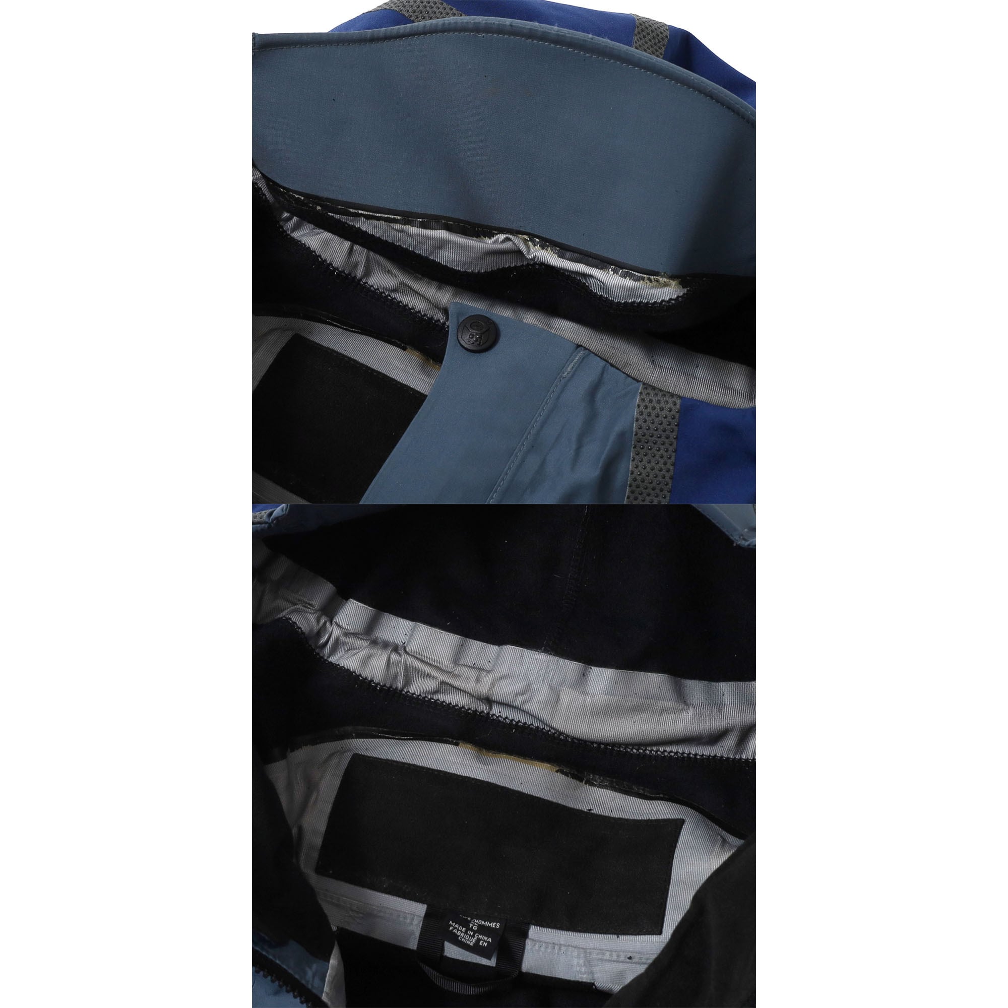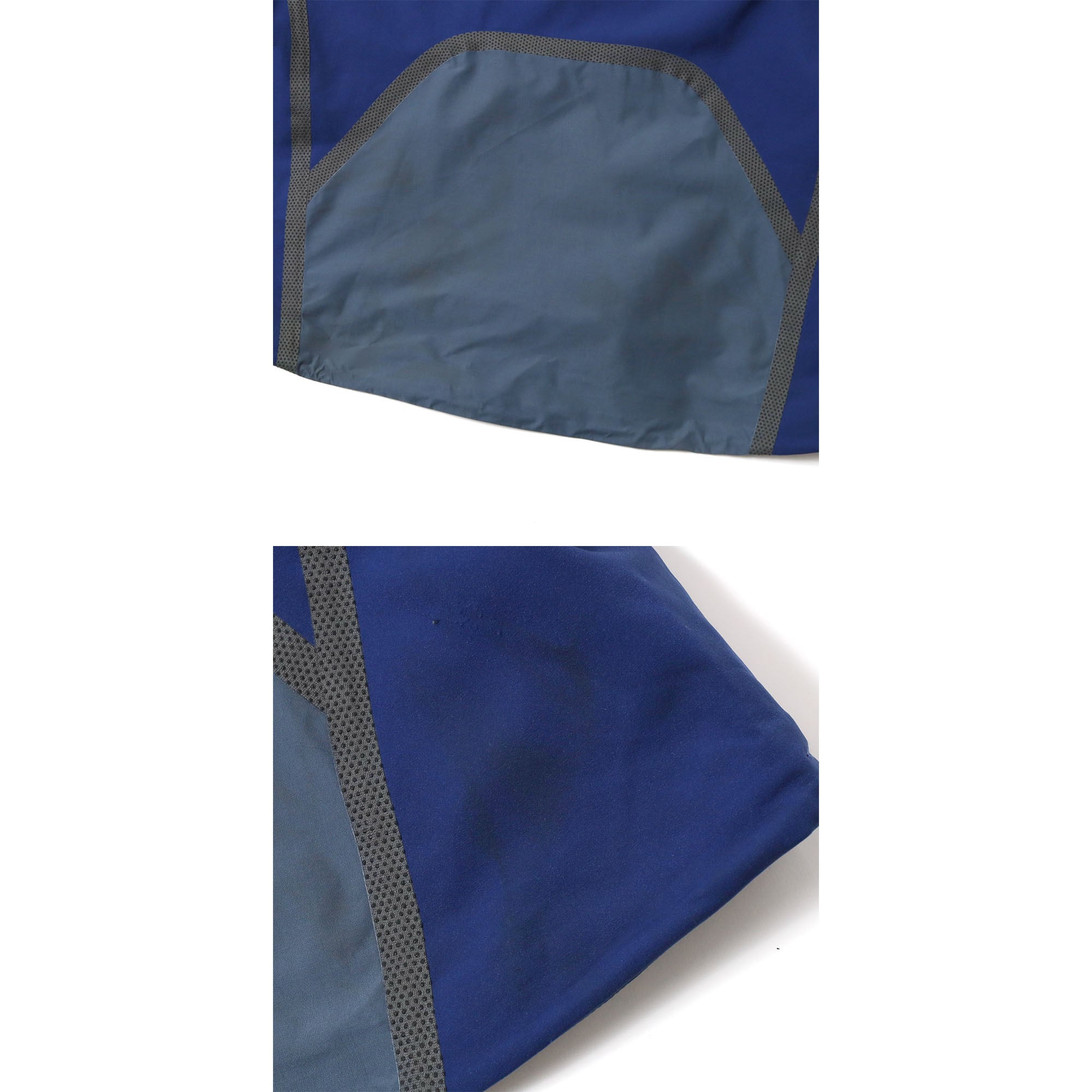 ジップ止水加工の剥がれ(画像4枚目)、フード裏にややテープの剥がれ(画像15枚目)、後身頃に薄汚れ(画像16枚目)、左袖と後身頃に薄汚れ(画像17枚目)、後身頃に多少の毛羽立ち(画像18枚目)、裏地に小さな汚れ(画像19枚目)あり。