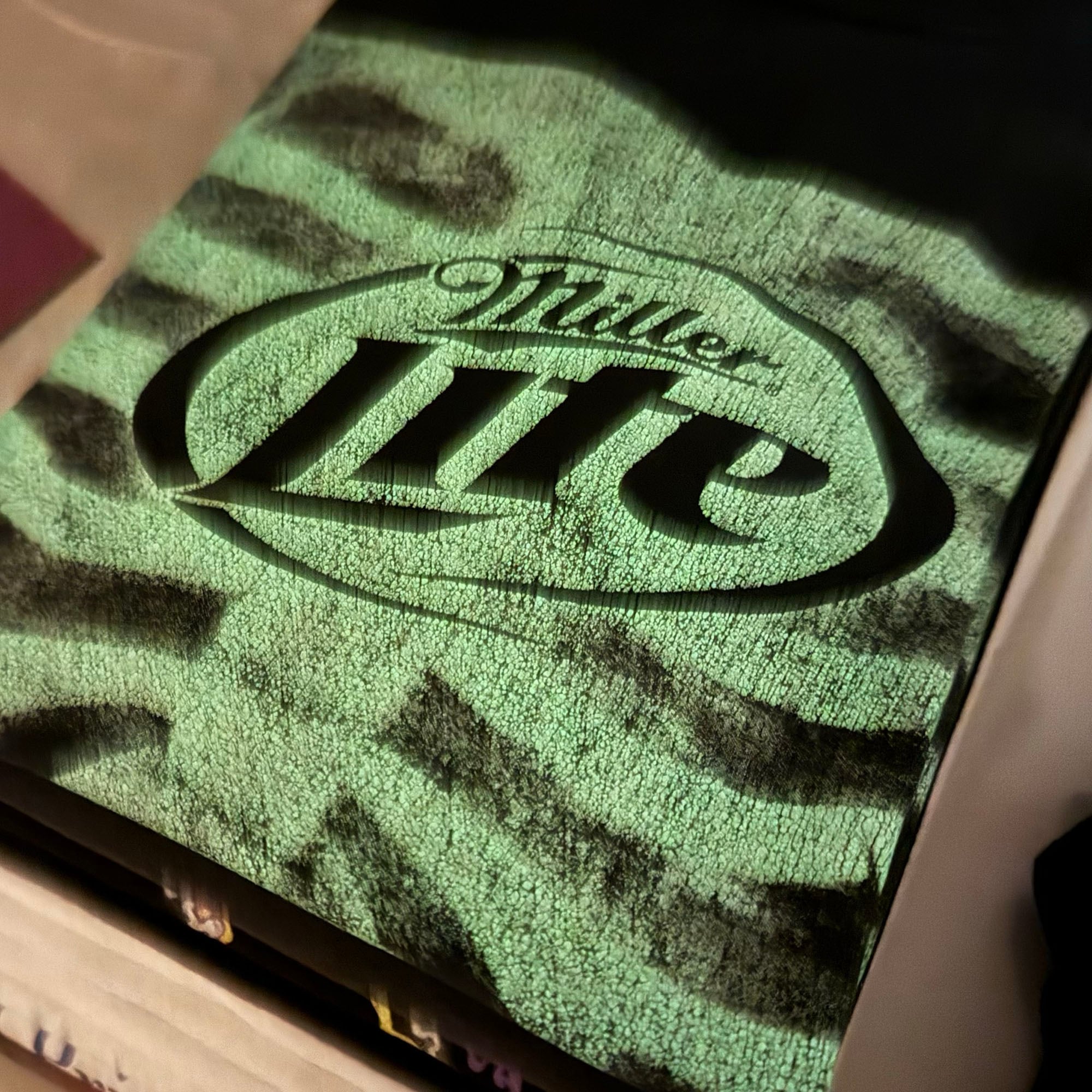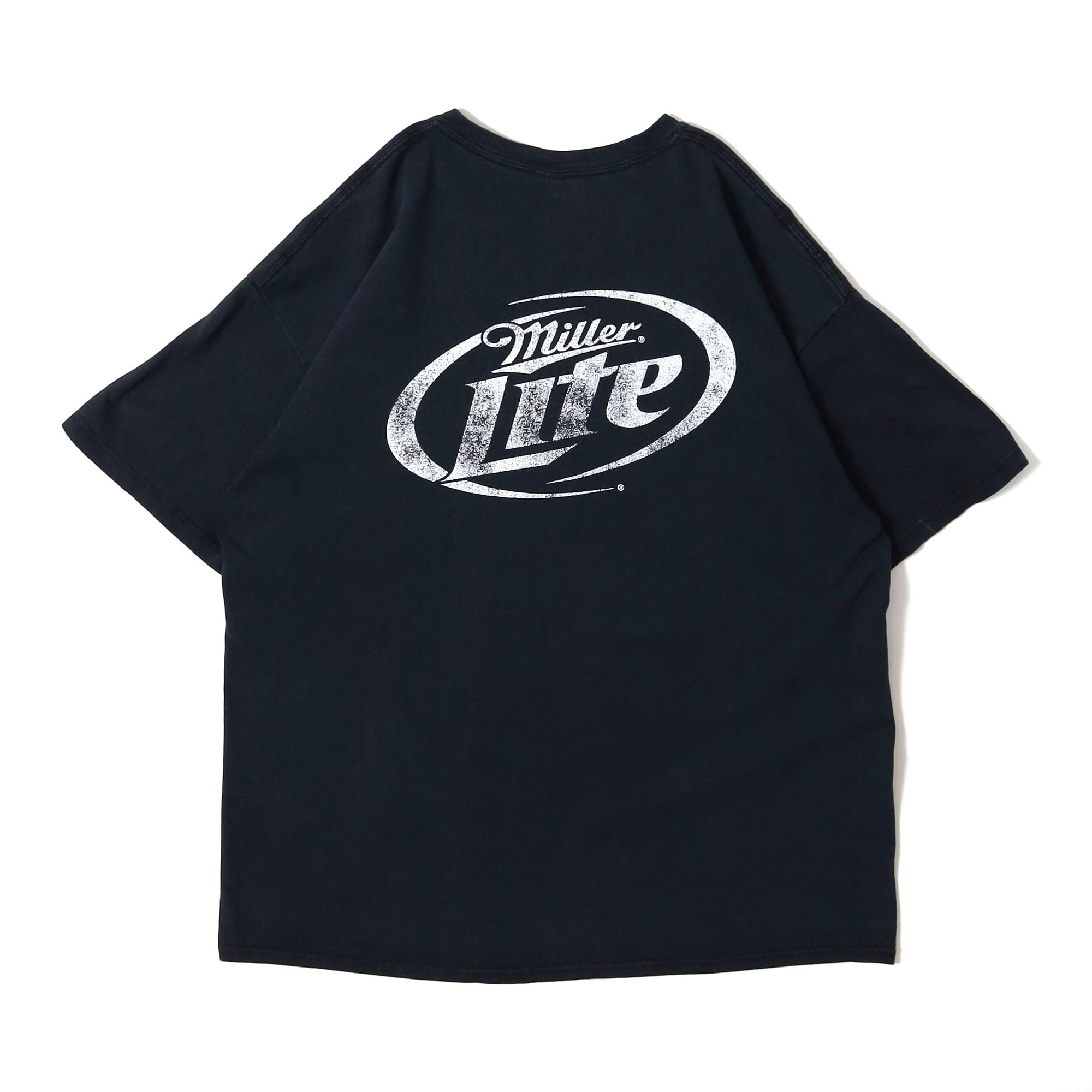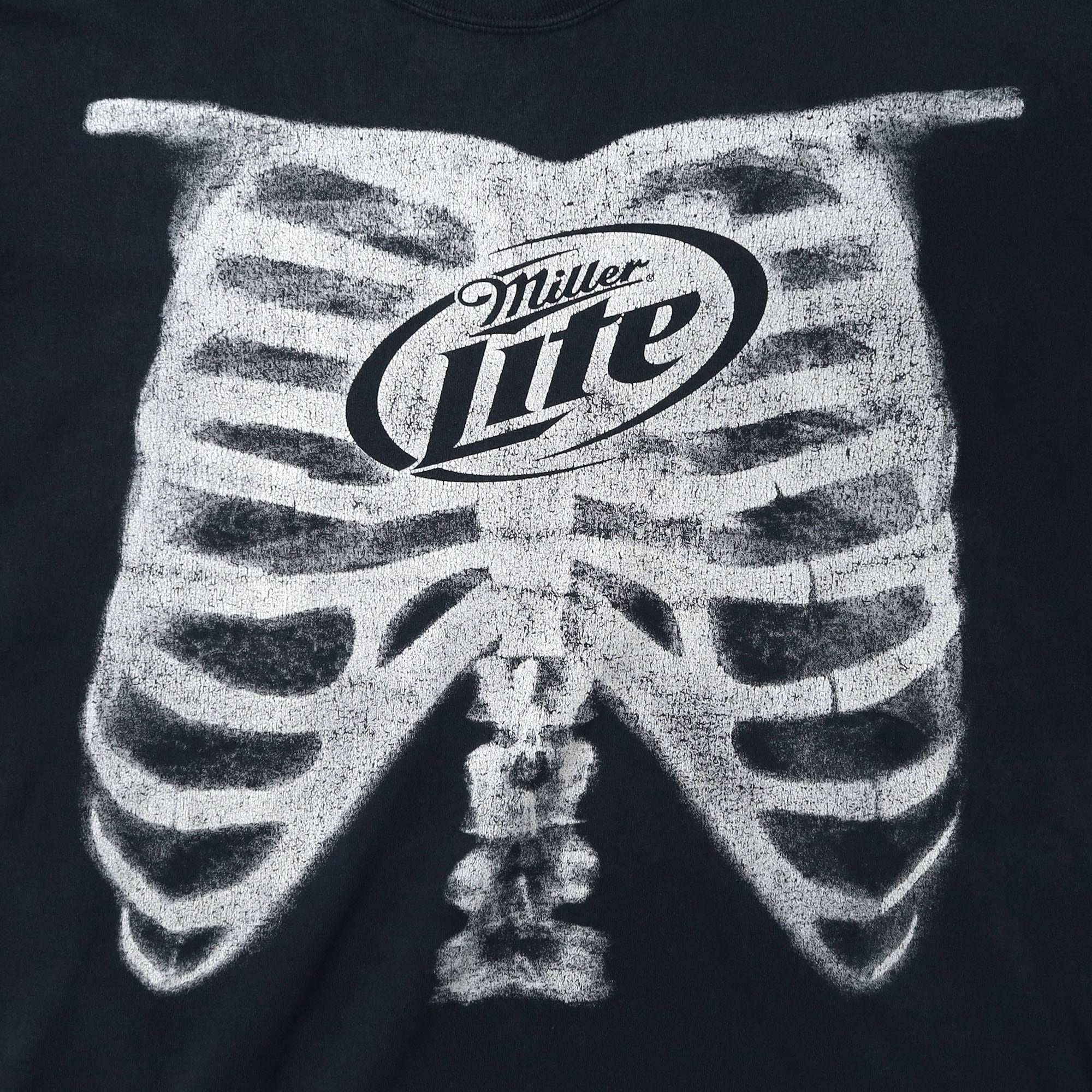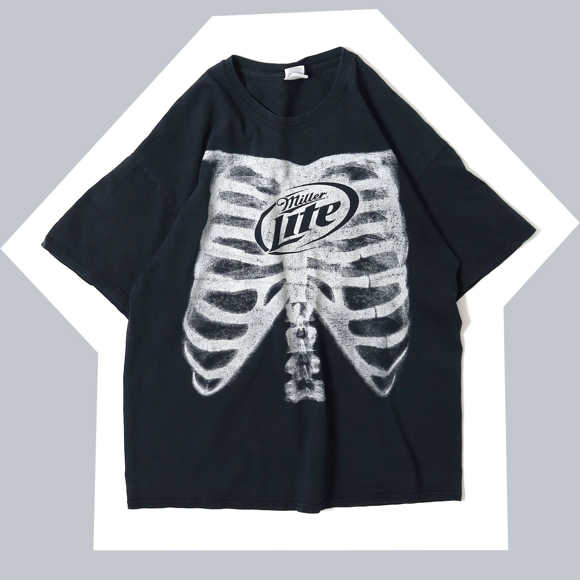 アメリカのビールブランド "Miller" の低カロリービール "Miller Lite" のプロモTシャツです。MillerのTシャツはほとんどがロゴものであまりカッコイイデザインを見かけないので、ほとんど販売したことがないのですが、こちらは初見で一目で惹かれた1枚。ビールのTシャツなのにレントゲン写真というのは、そういった意図があったかは不明ですが、アイロニカルな感じがしていいですよね。しかもこれ蓄光プリントなので、暗いところで光があたれば発光します。こんなTシャツ見たことがありません。