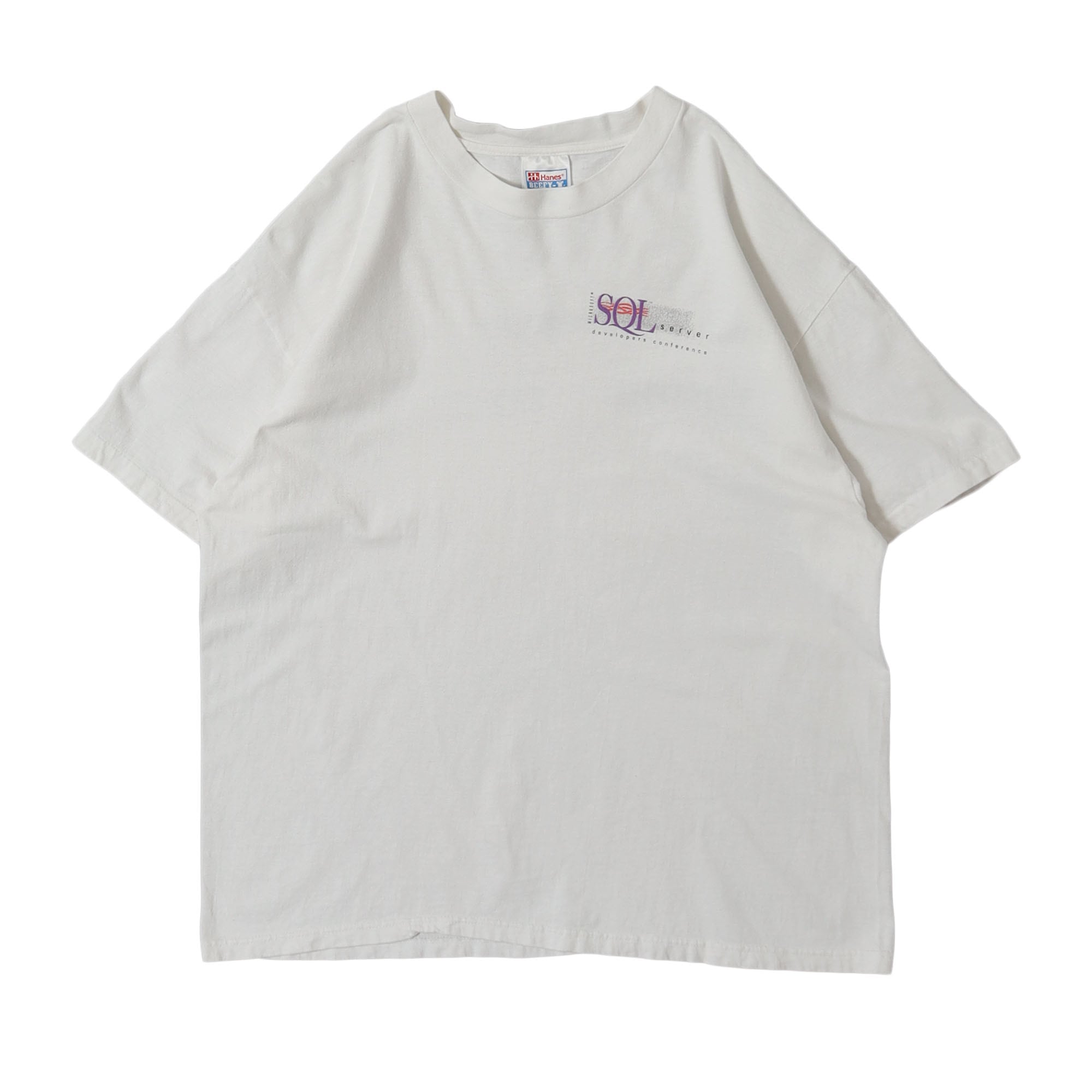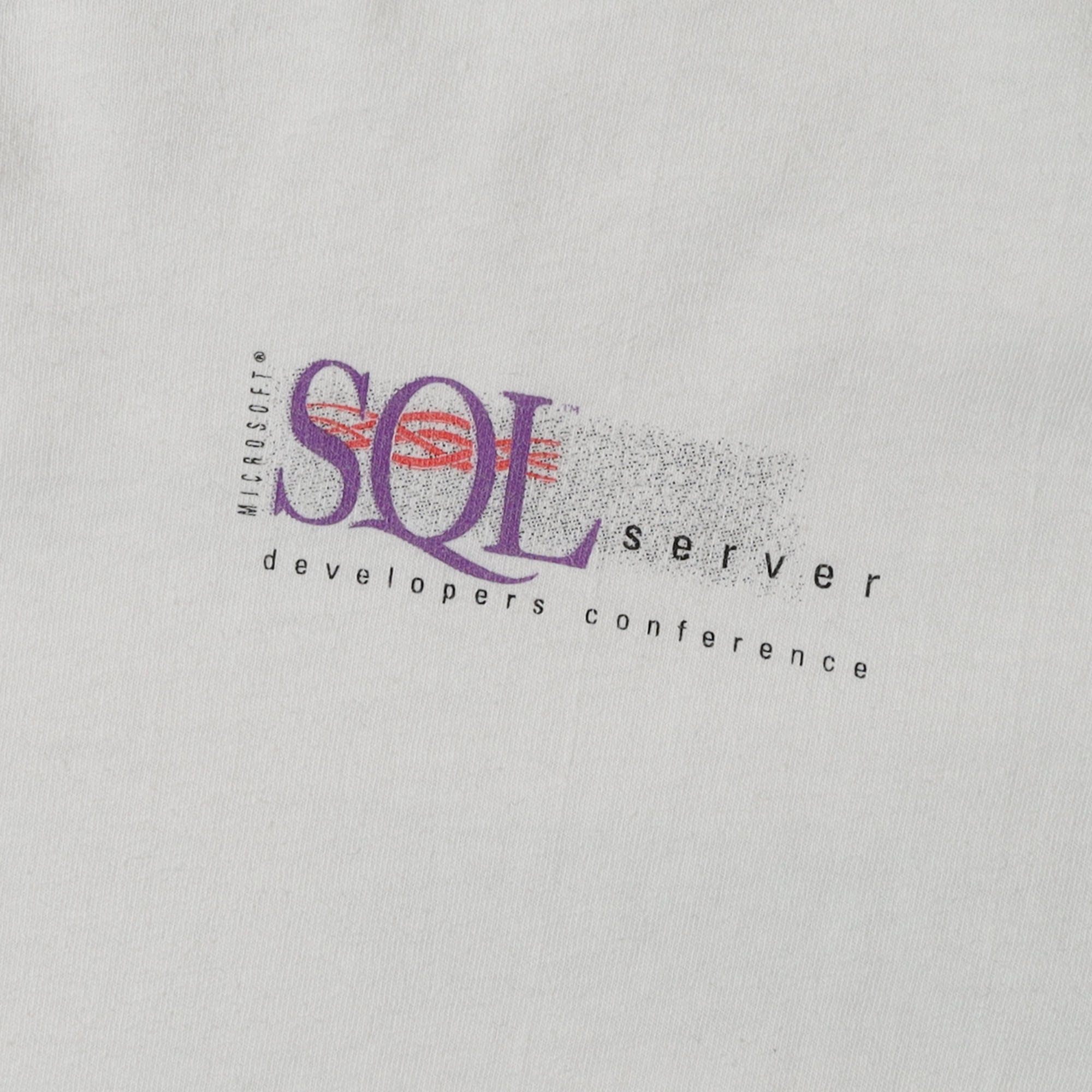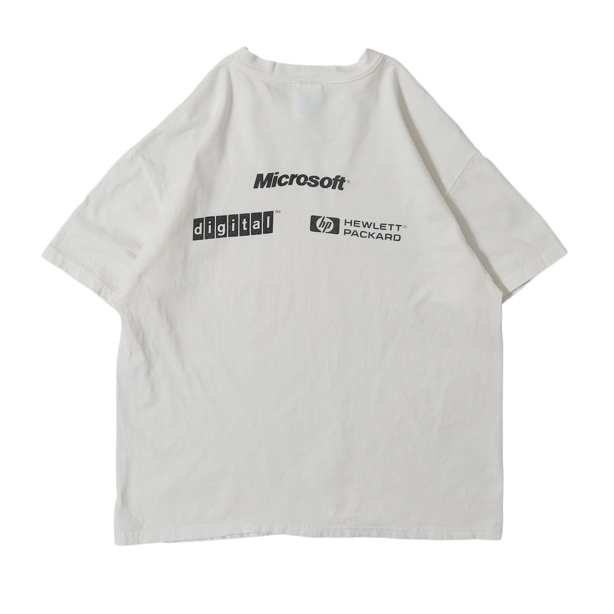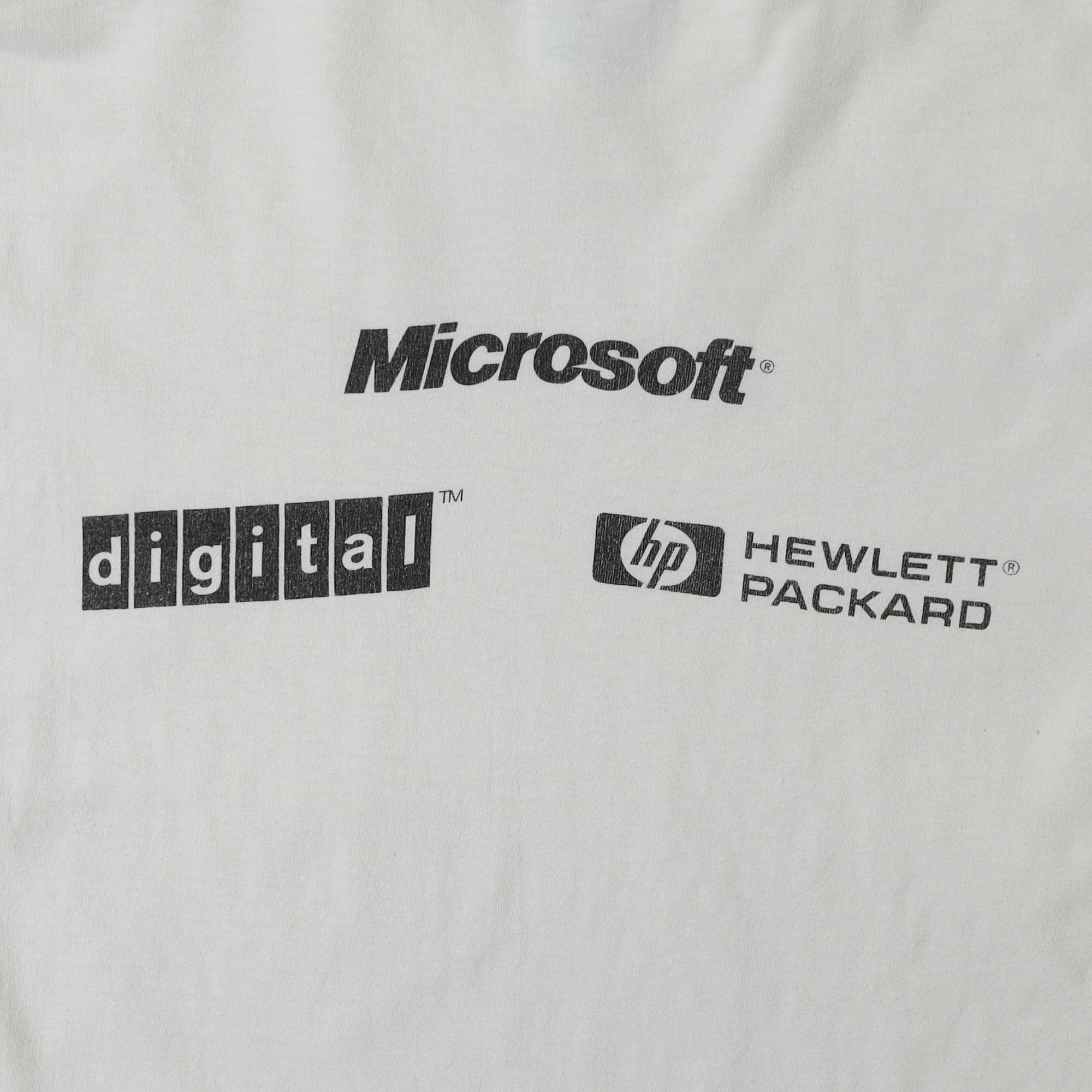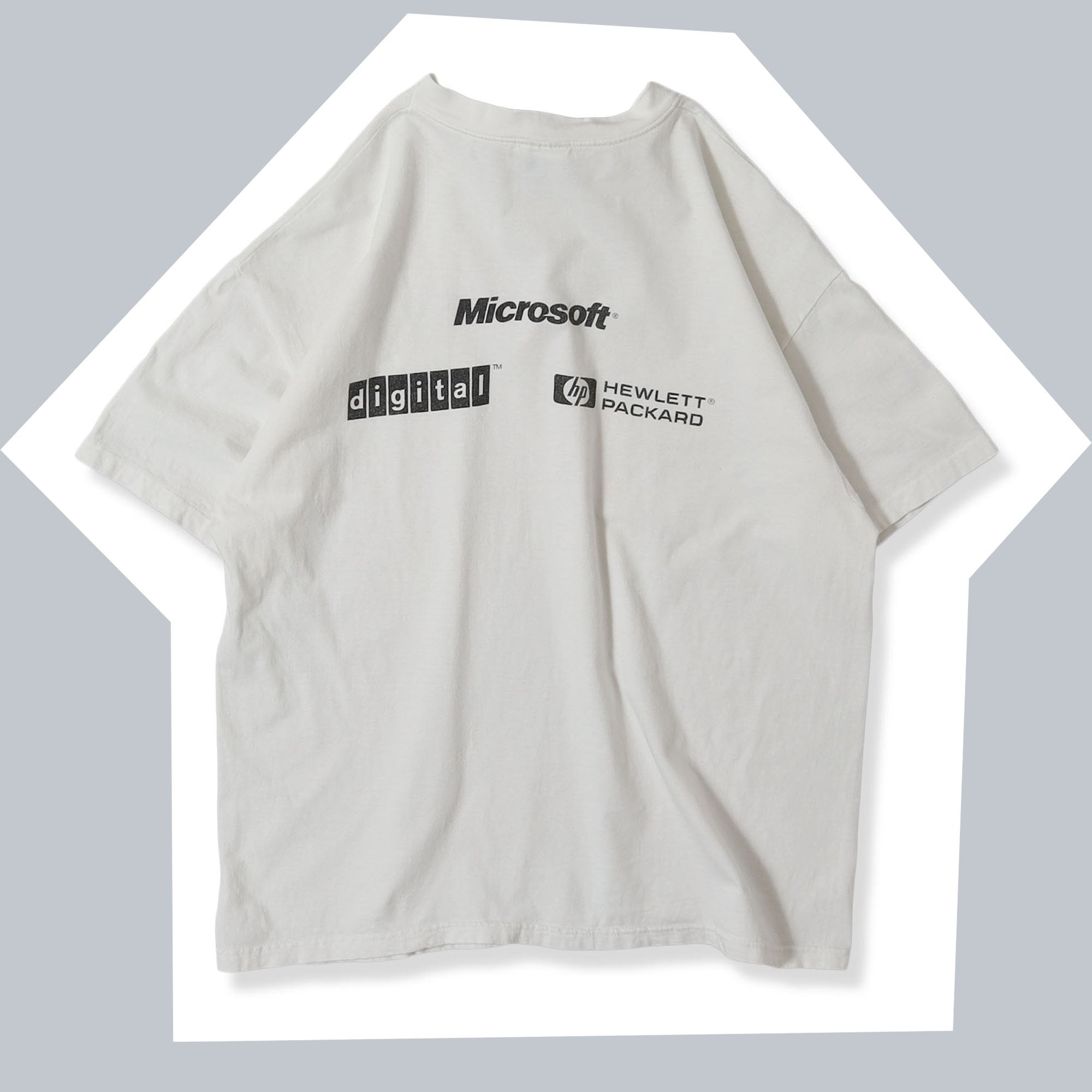 Microsoftが開発する関係データベース管理システム "SQL Server" のプロモTシャツです。バックにはMicrosoftに加え、恐らく開発の上で関係があった "digital" と "Hewlett Packard" というテックジャイアント3社のロゴがプリントされており、企業モノ好きにはたまらないデザインかと思います。この絶妙なプリントの大きさも良いんですよね。全体的にシンプルにまとまっておりますので、サラッと着やすい1枚です。