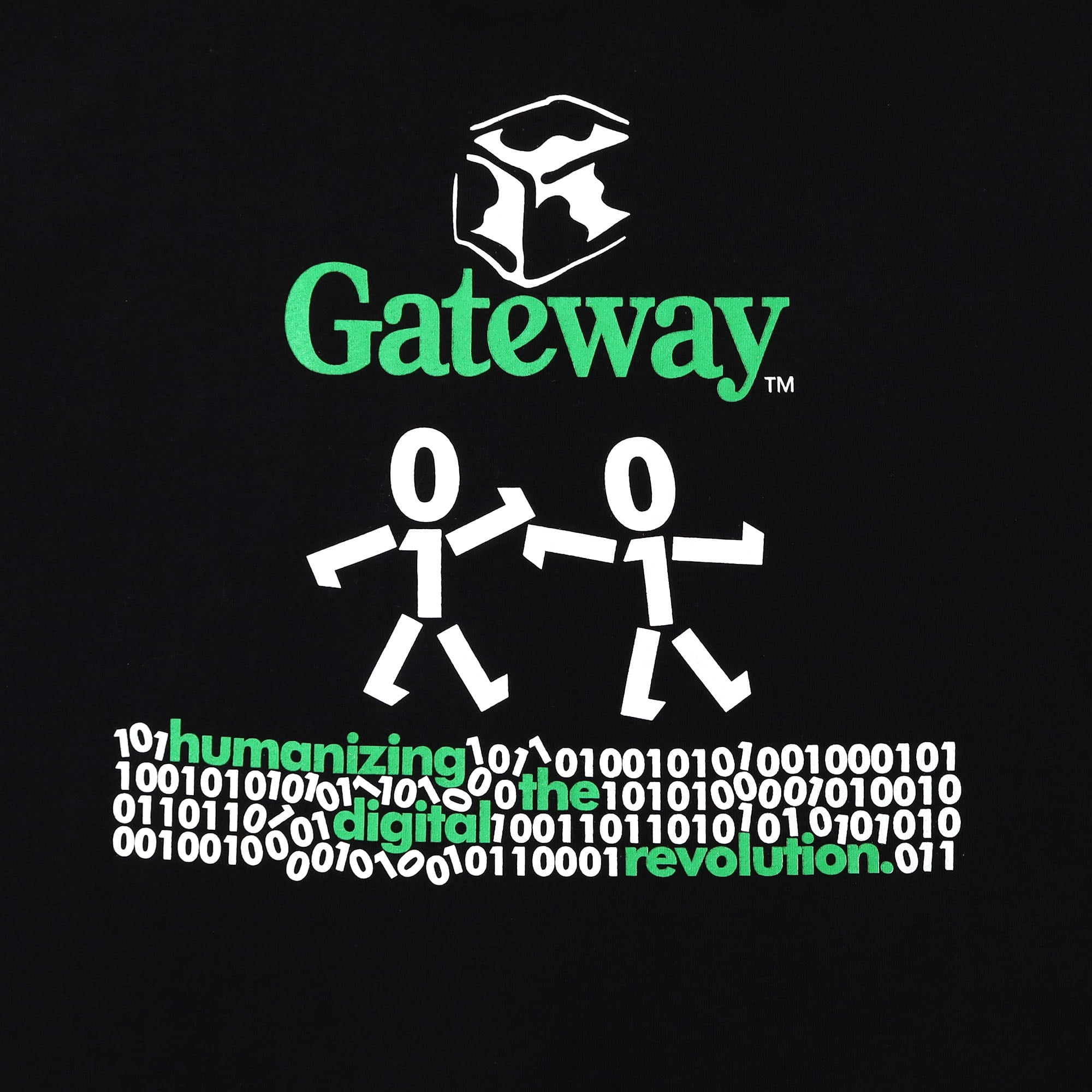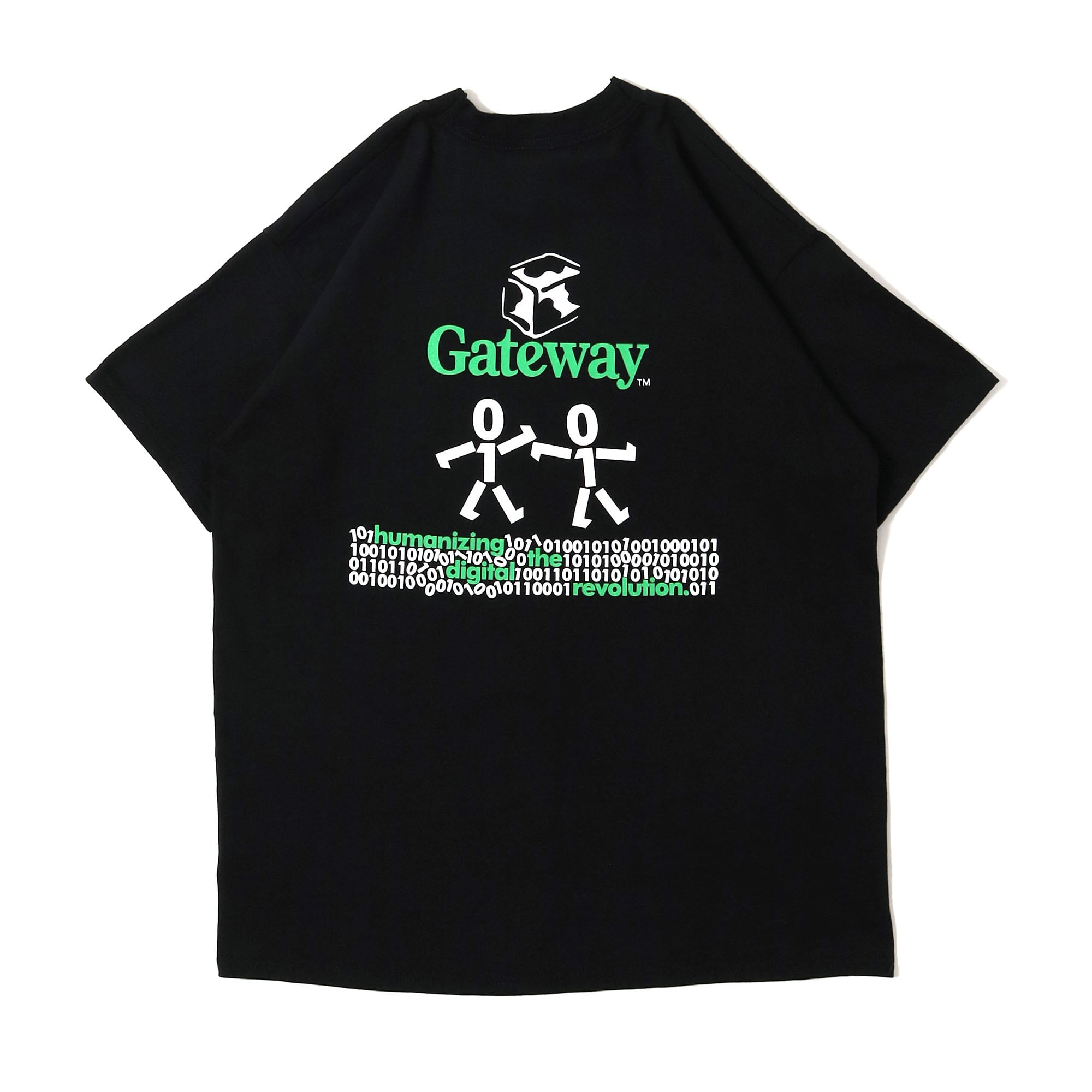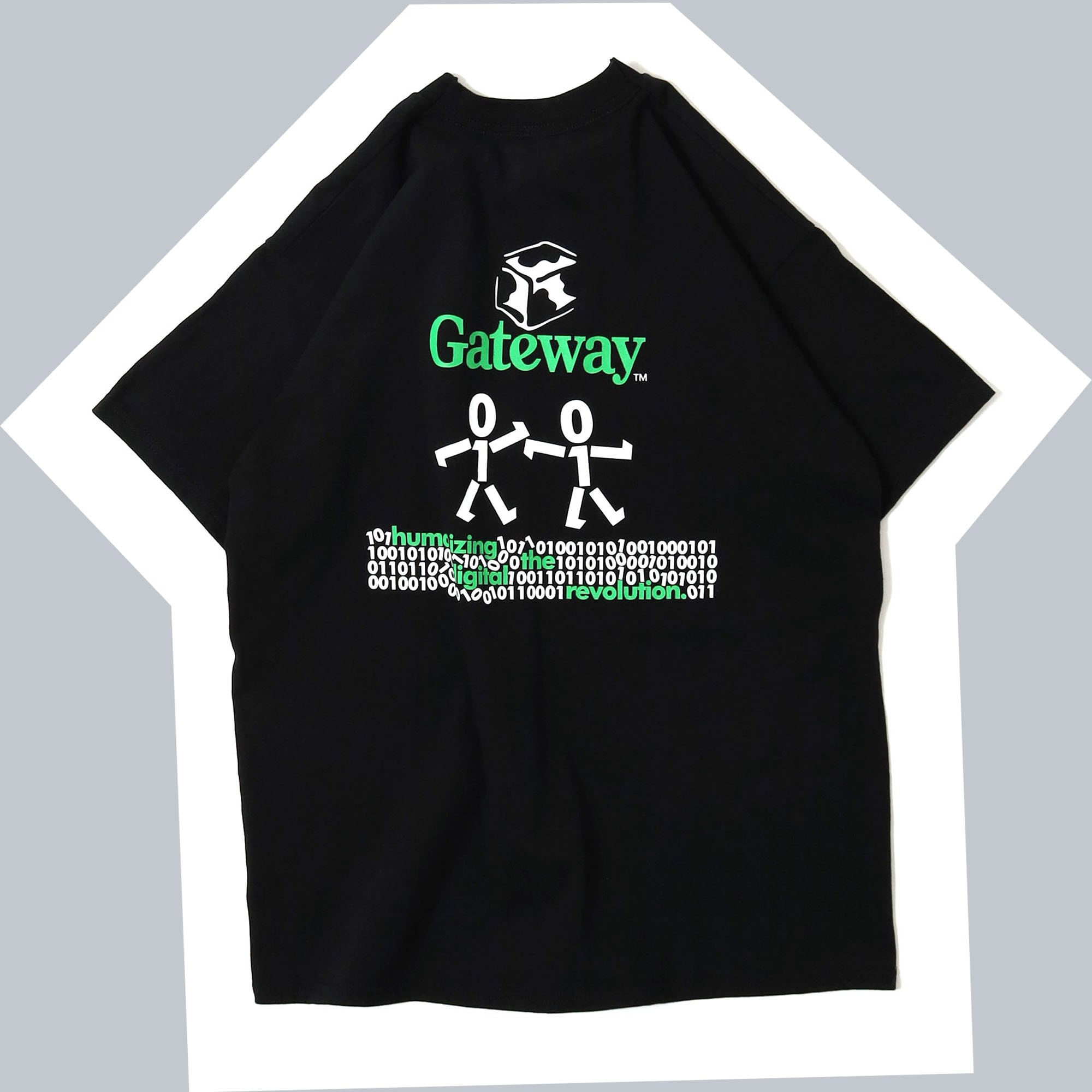 現在は台湾の "Acer" によって買収されている、アメリカのコンピューター企業 "Gateway" のプロモTシャツです。胸元にはこの企業を象徴する牛柄のボックスのロゴのみのシンプルなバランスに、コンピューター企業らしいほとんどが0と1の2進法で構成されたバックプリントが素晴らしいデザイン。ちゃんと解読したら意味のある文章になっていそうですが、僕は諦めたので興味ある人は解読してみてください笑