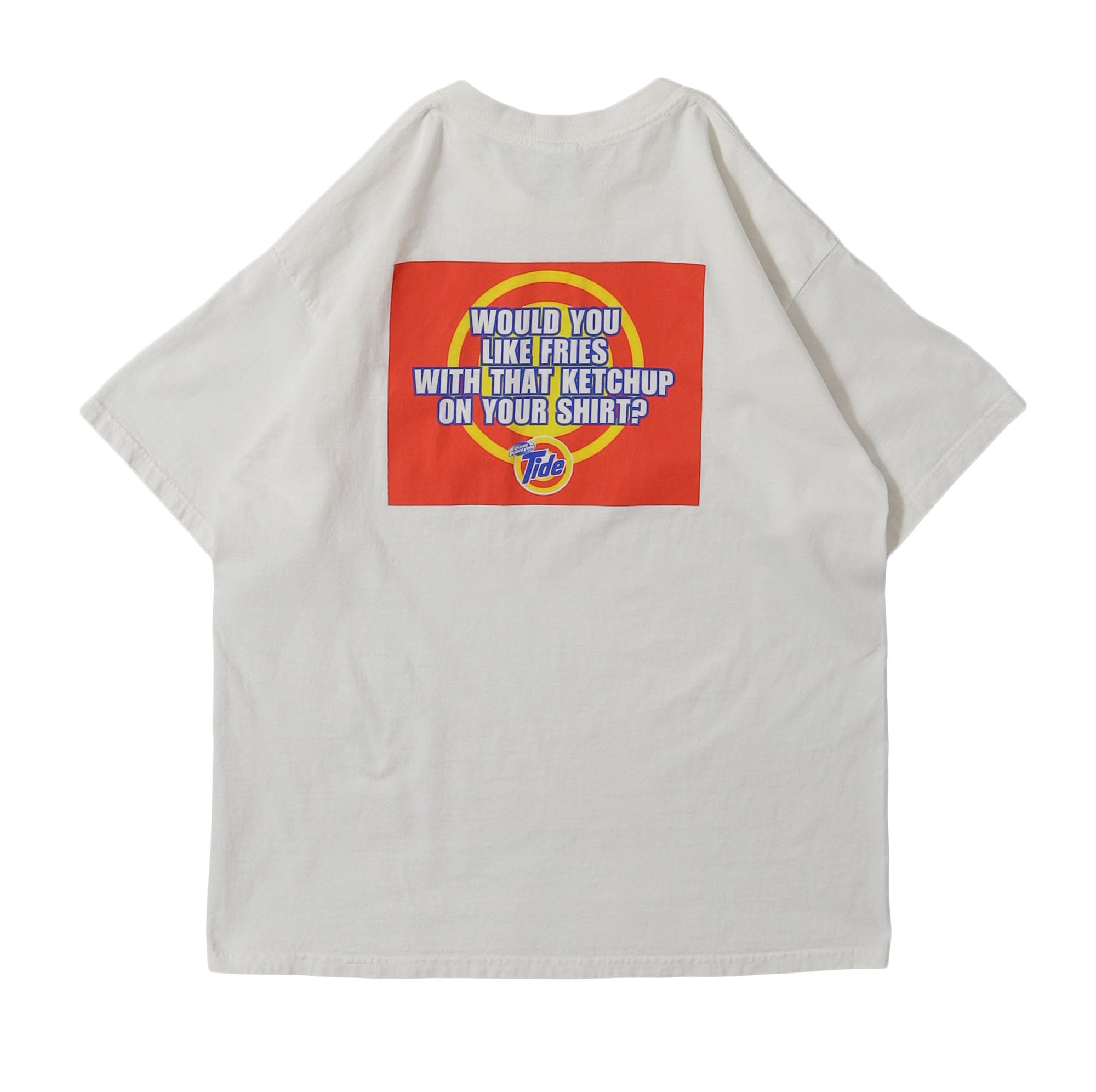 P&Gが製造・販売するアメリカの衣料用洗剤のブランド "Tide" のプロモTシャツです。Tideって分かりやすくアメリカっぽくて、どこのスーパー行っても売ってるかなりベタなアメリカ製品ですが、Tシャツとなるとあまり見なくて、当ショップでは初めての入荷です。こういった有名なブランドの製品だとロゴだけのTシャツが多かったりするのですが、こちらはロゴもしっかり配置されながら、ロゴ以外にもしっかりデザインのあるプリントが魅力的な1枚です。